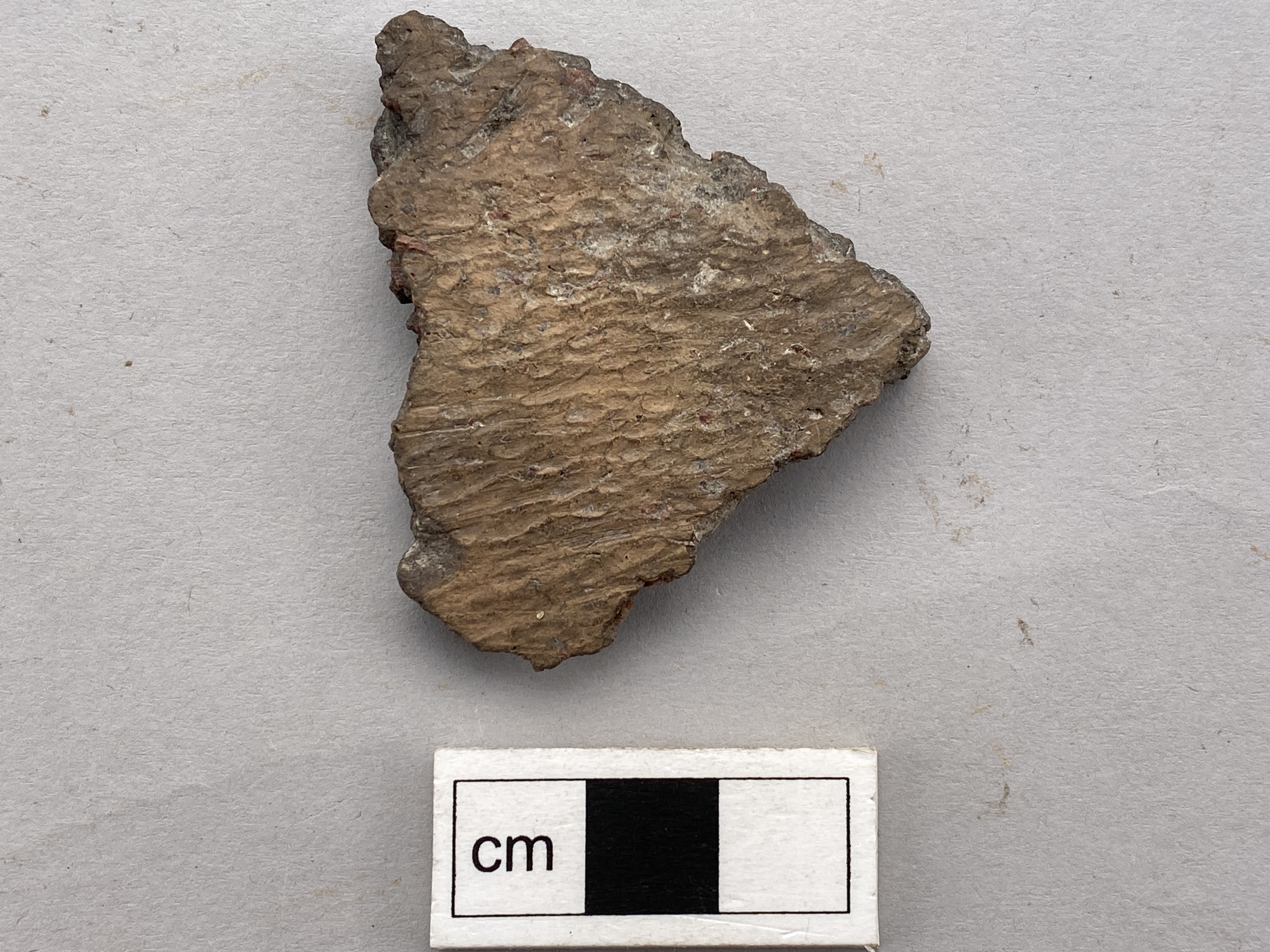 Dekor på buk av djupa sneda instick. textilintryck på utsidan? glättat inne. Oxiderat bränd ute & insida. bergartsmagring