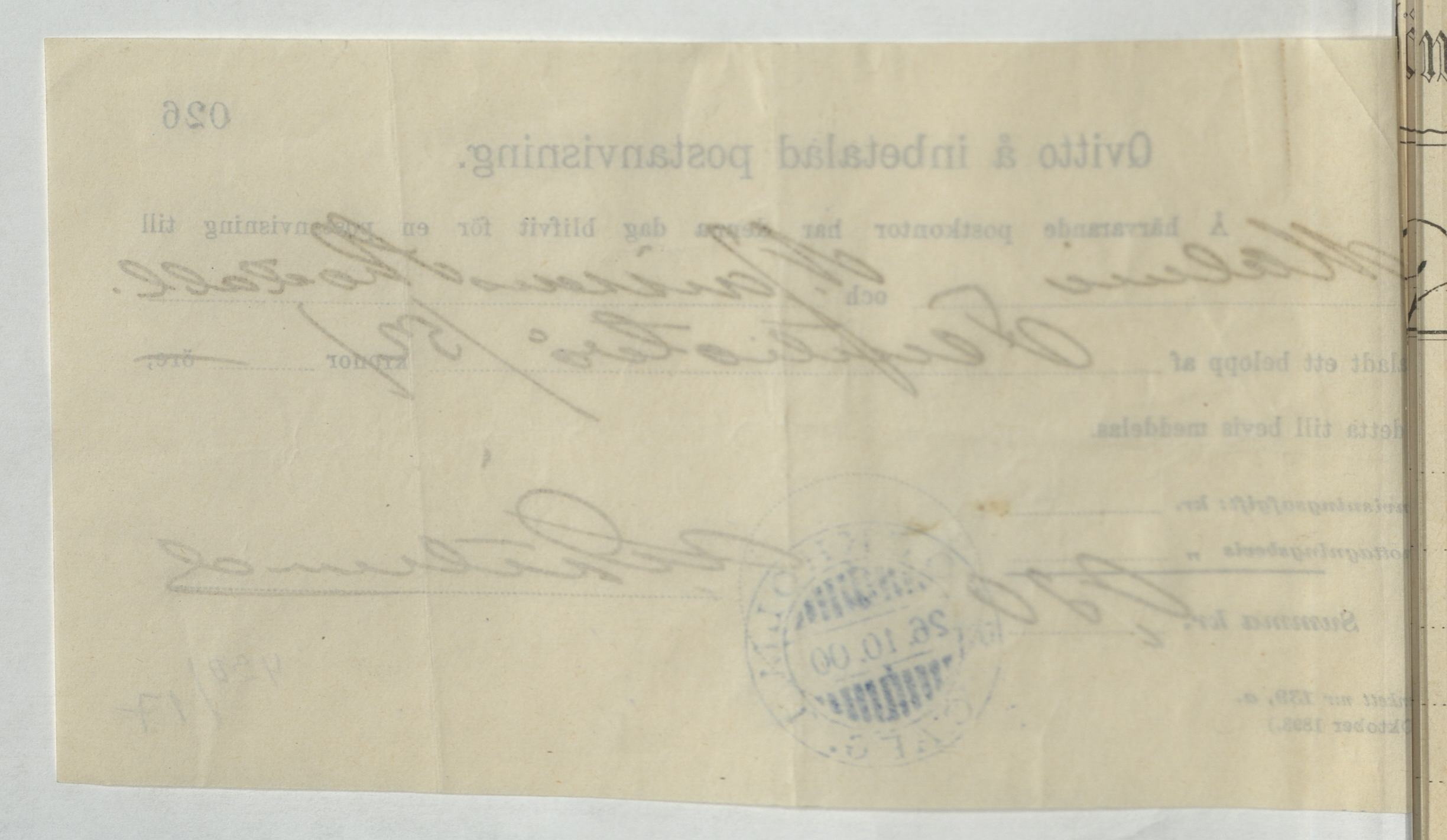 Kvitto för inbetald postanvisning gällande N. Jönsson, Skoetablissement