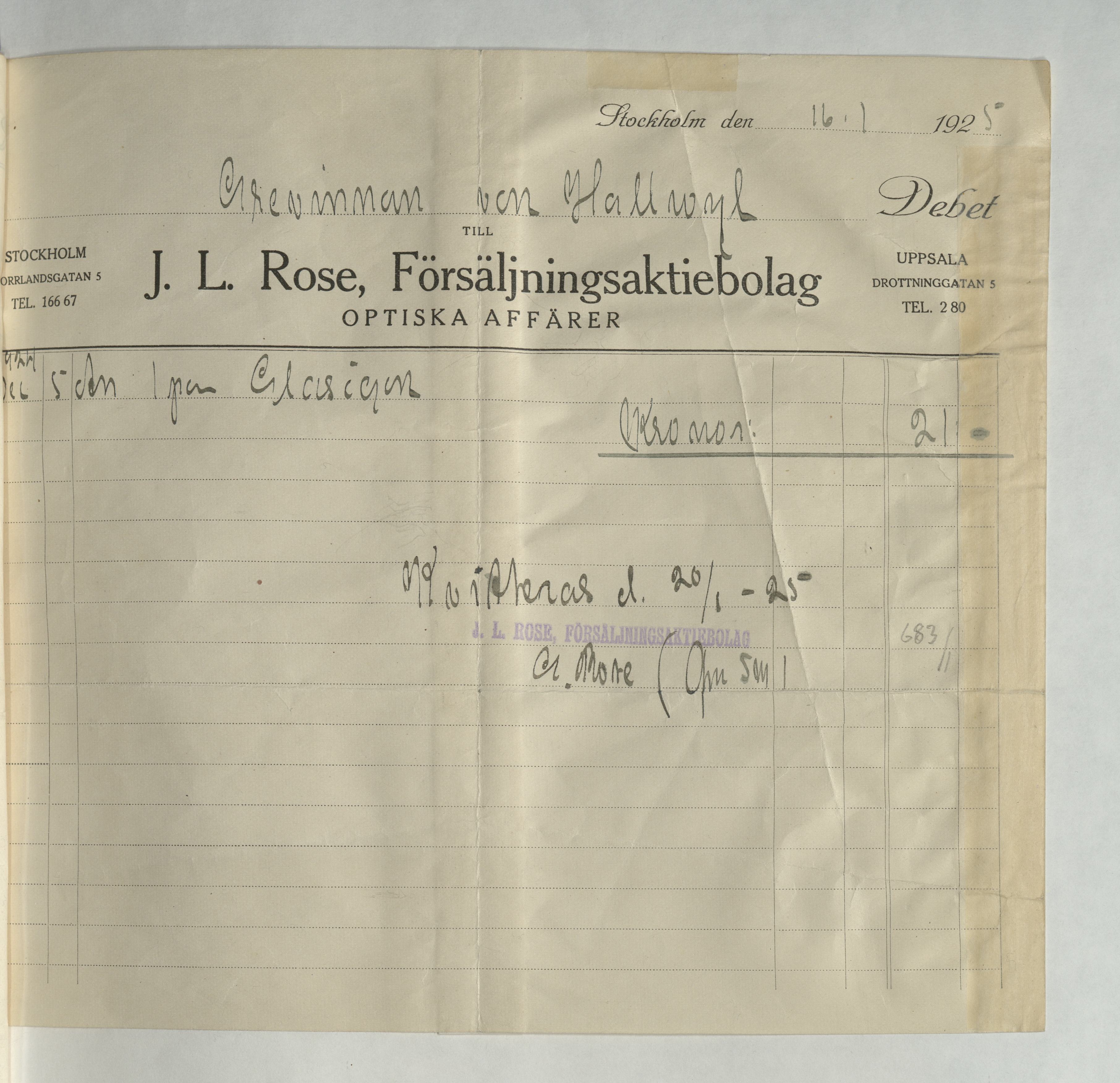 Kvitto från J.L. Rose, Optiska affären, Försäljningsaktiebolag till Grevinnan von Hallwyl, på en summa av 21Kr. Stockholm 16 januari 1925.