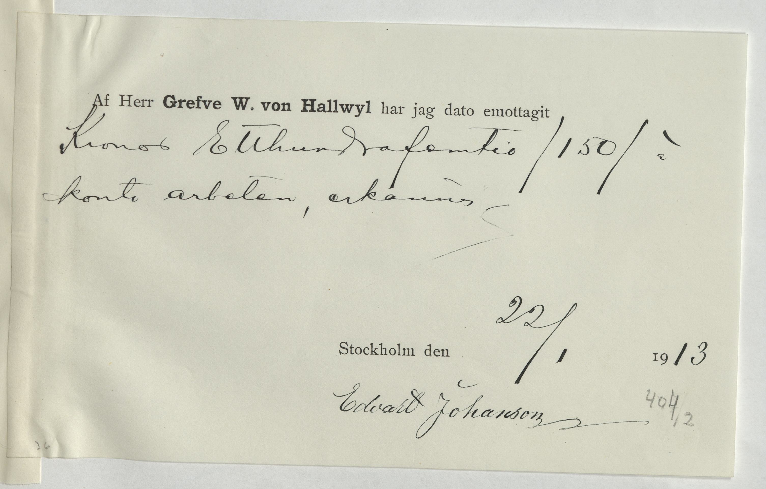 Kvitto från Edvard Johanson, Snickare