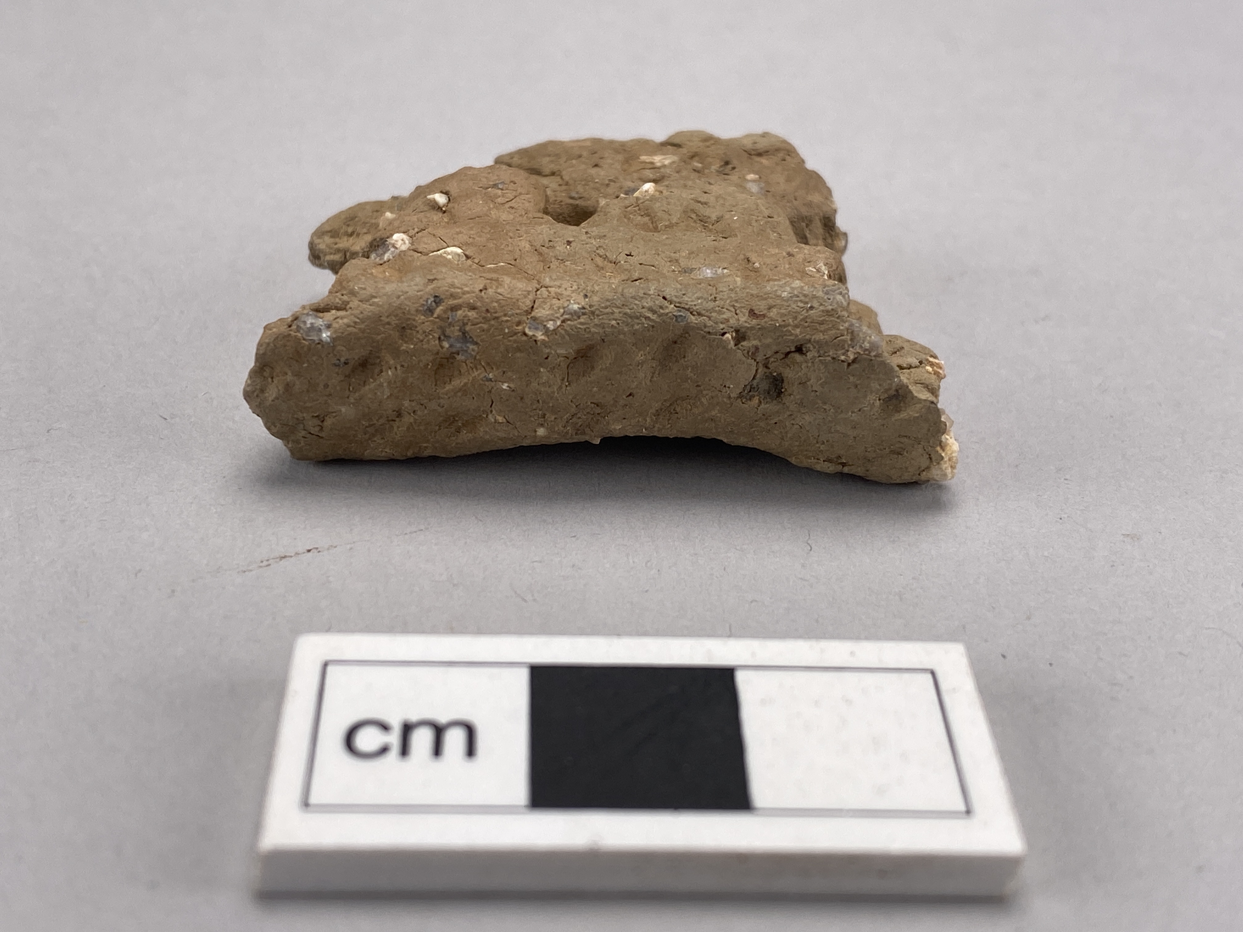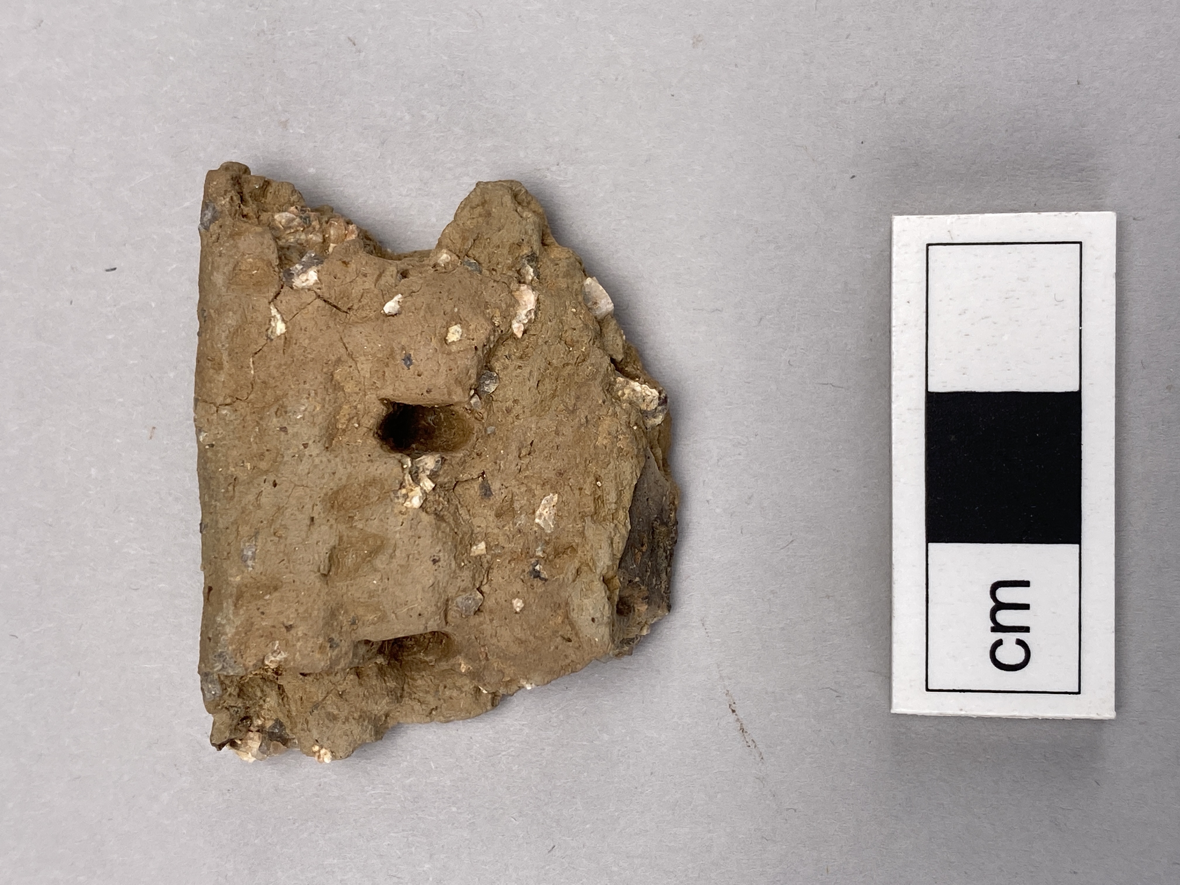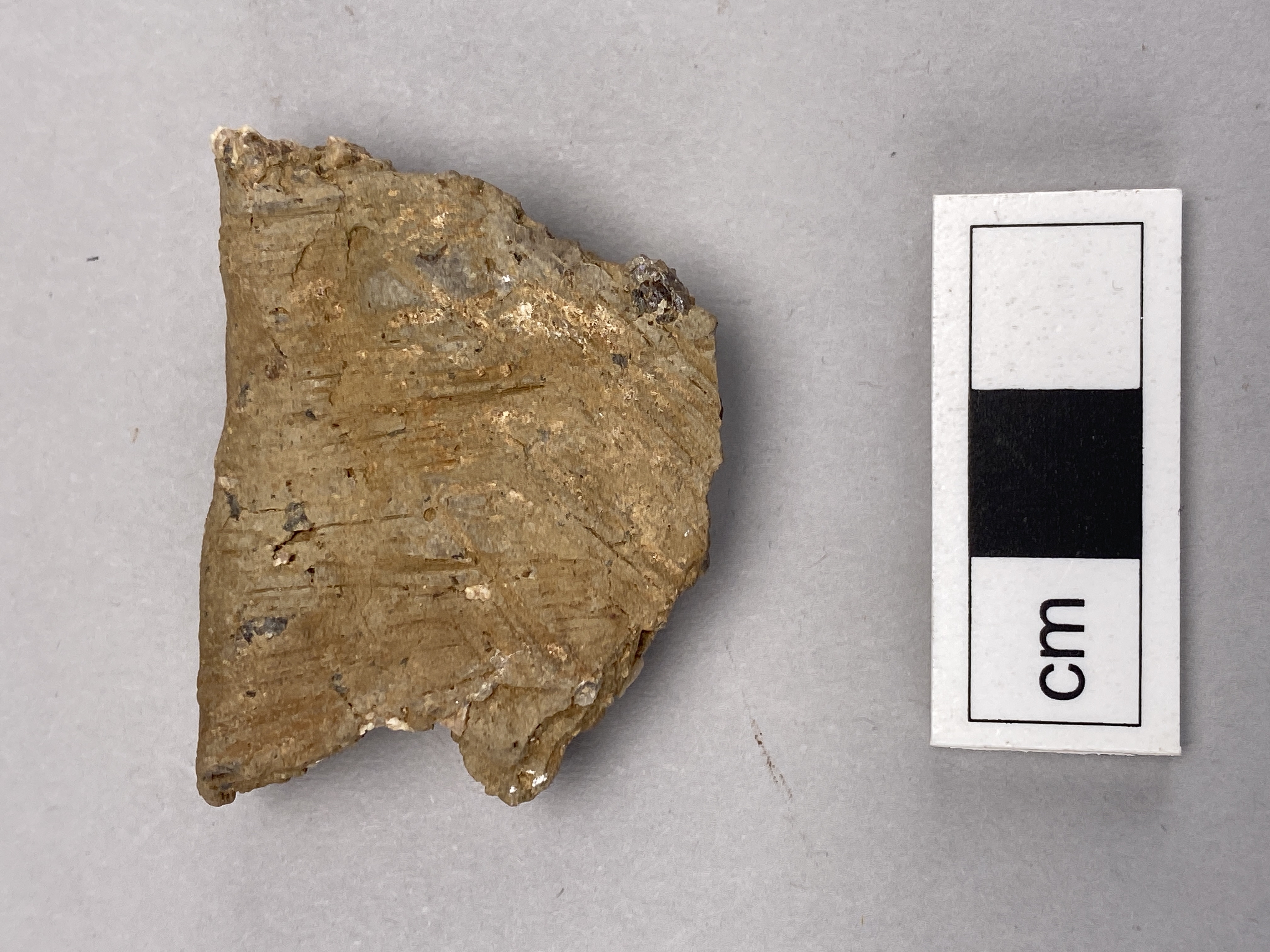 Mynningsskärva. Stämpeldekor på mynnningsrand och nedanför mynningen, två gropar. Struken insida. Fast bergartsmagrat gods.