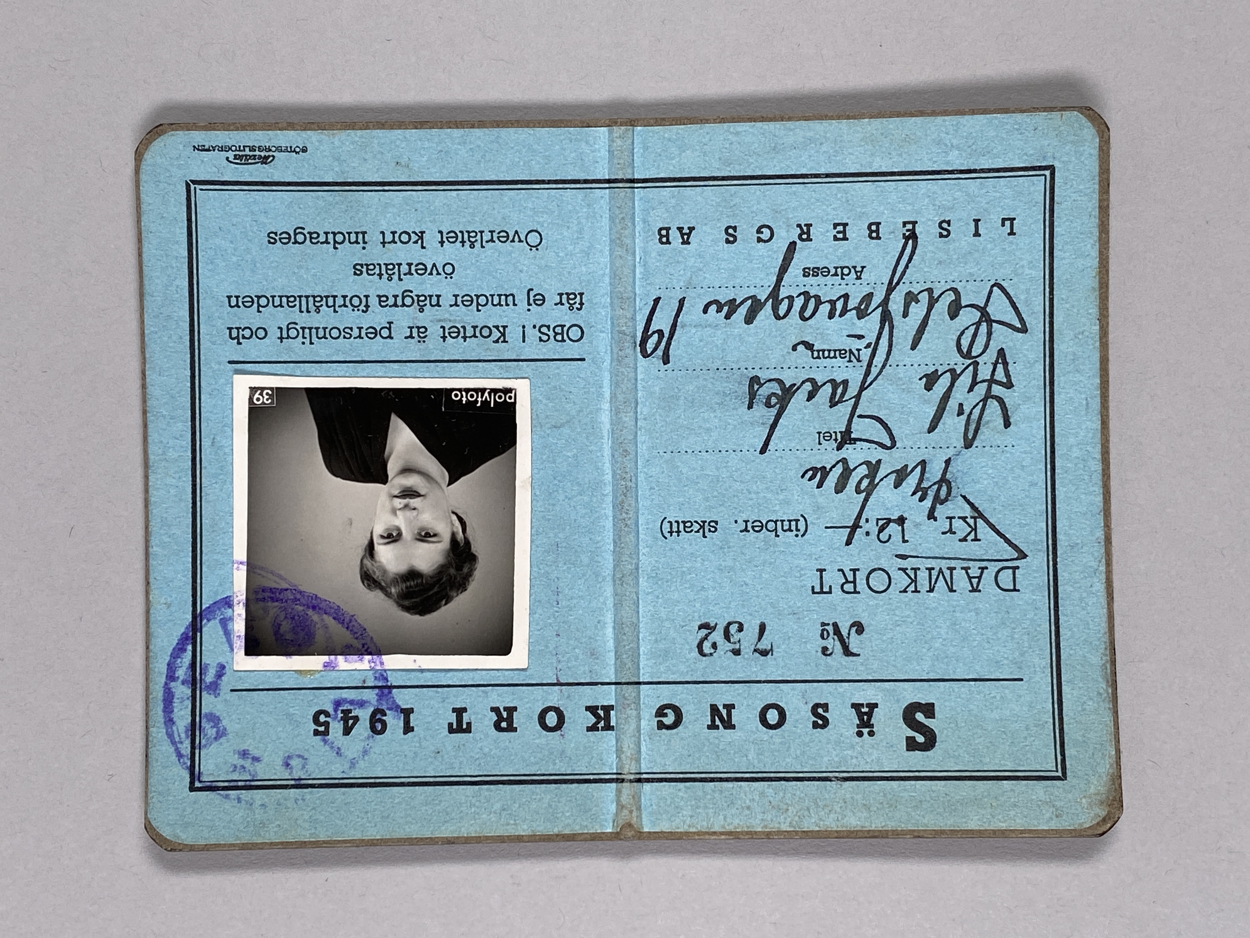 Lieselotte (Lilo) Jacks säsongskort på Liseberg 1945. Lieselotte var ett av de barn som kom till Sverige från Nazityskland med barntransporter som Mosaiska församlingens hjälpkommitté ordnade. Liseberg kom att bli en viktig plats för Lilo.