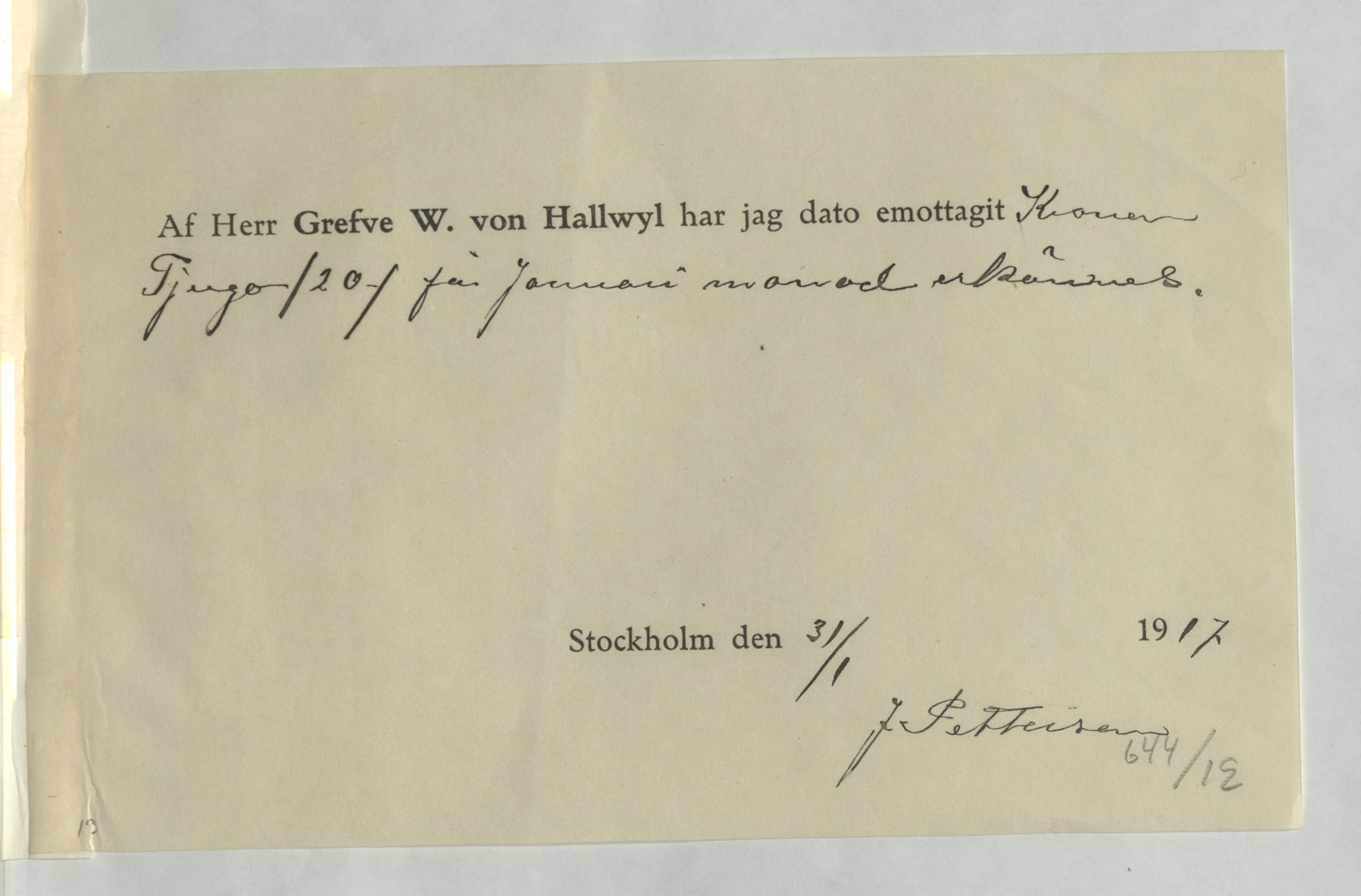 Kvitto från J. Pettersson, på att han emottagit 20Kr av Greve W. von Hallwyl för januari månad. Stockholm 31 januari 1917.