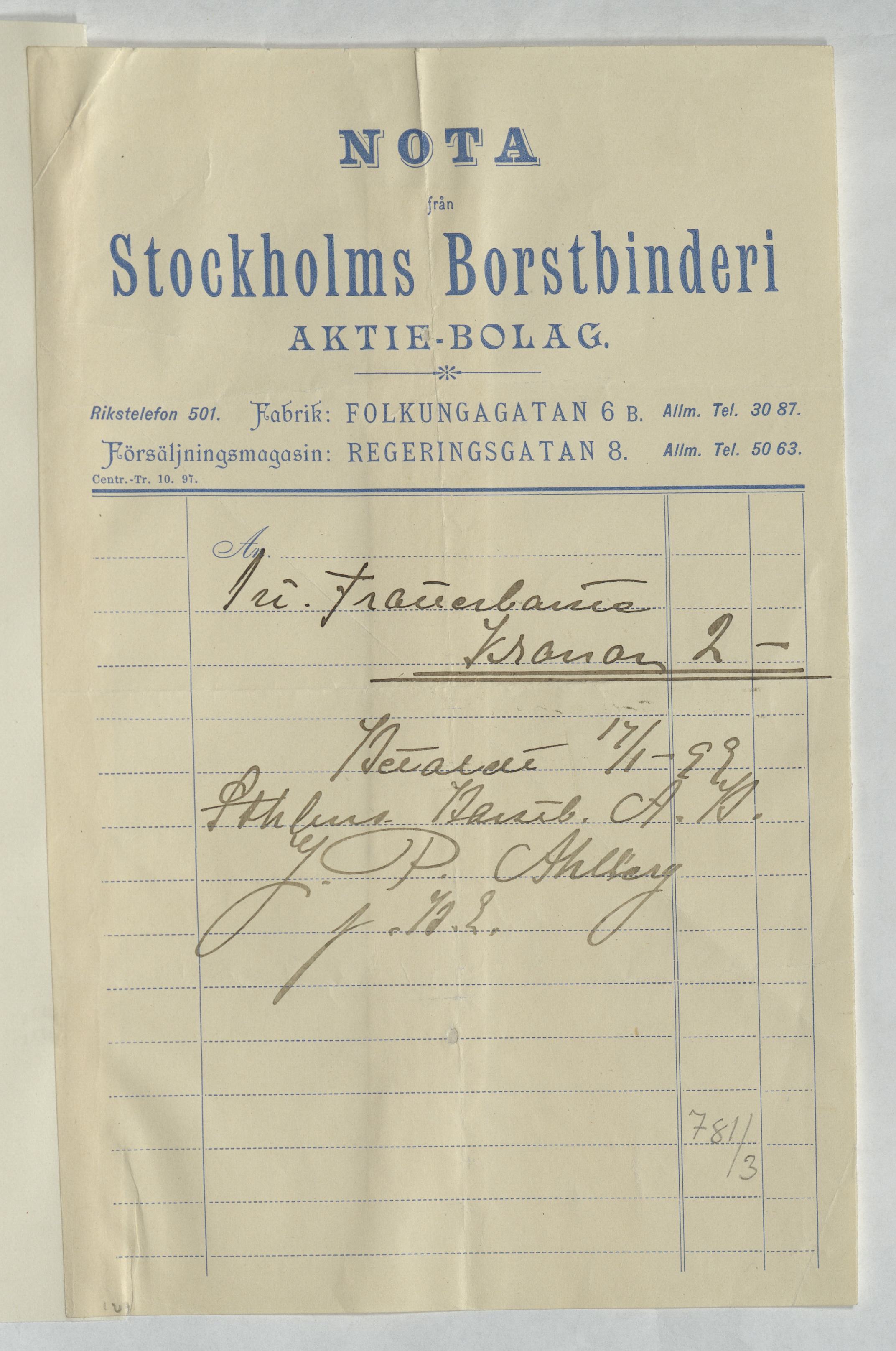 Kvitto från Stockholms Borsbinderi Aktiebolag. Stockholm, 1899.