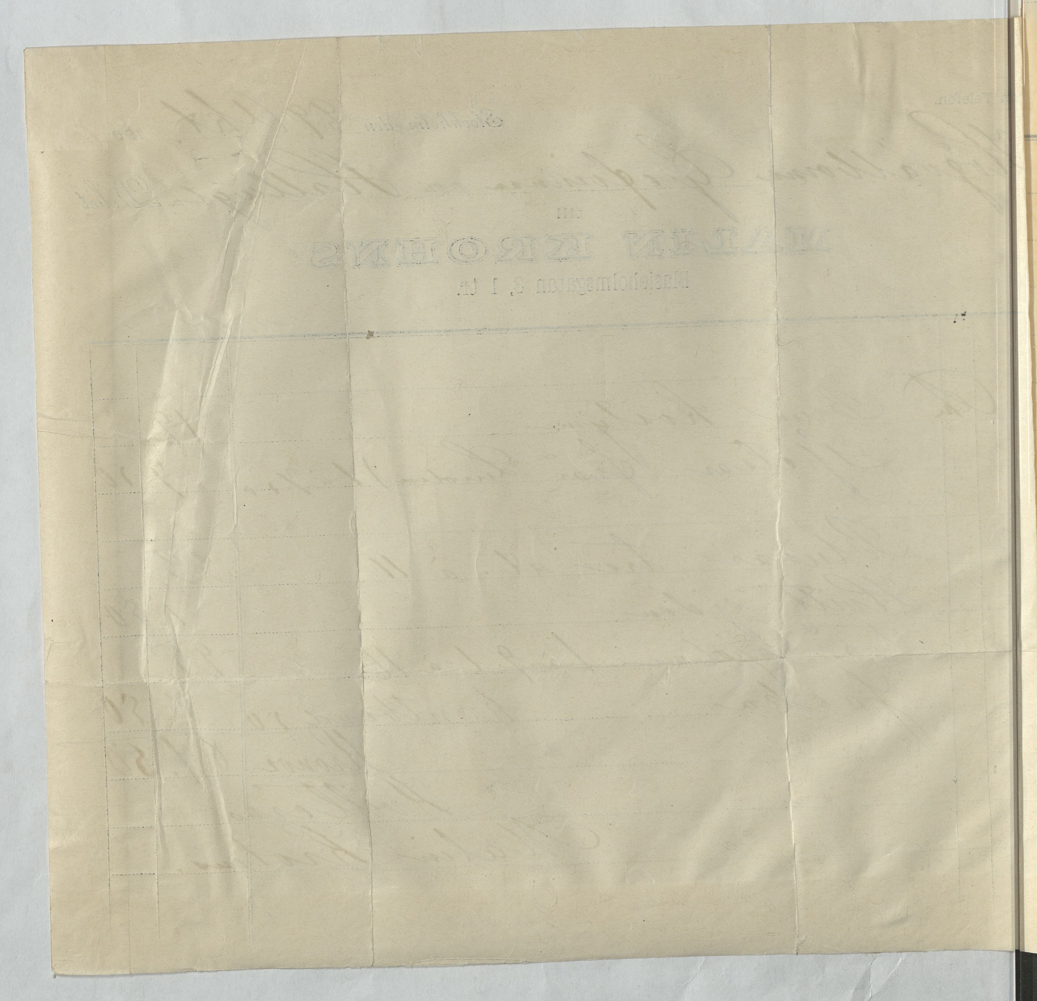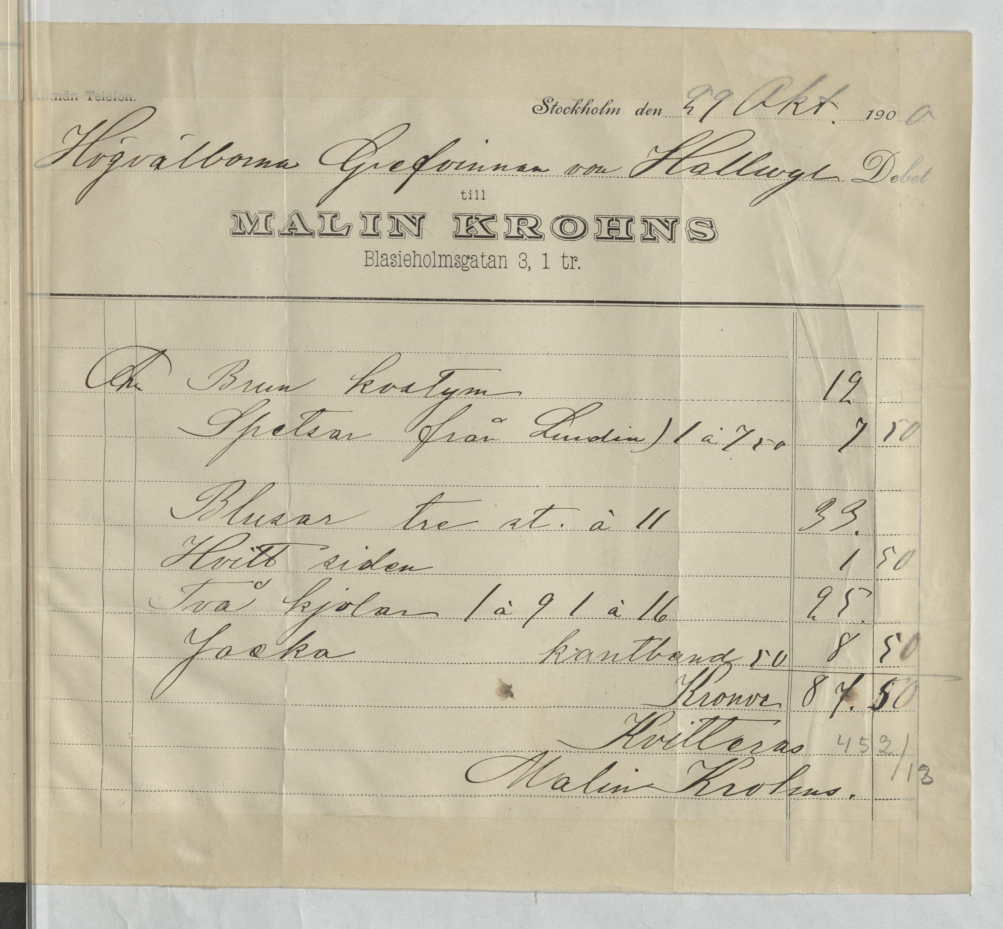 Kvitto från Malin Krohns ateljé. Gällande material och sylön för flertalet plagg. Stockholm, 1900.