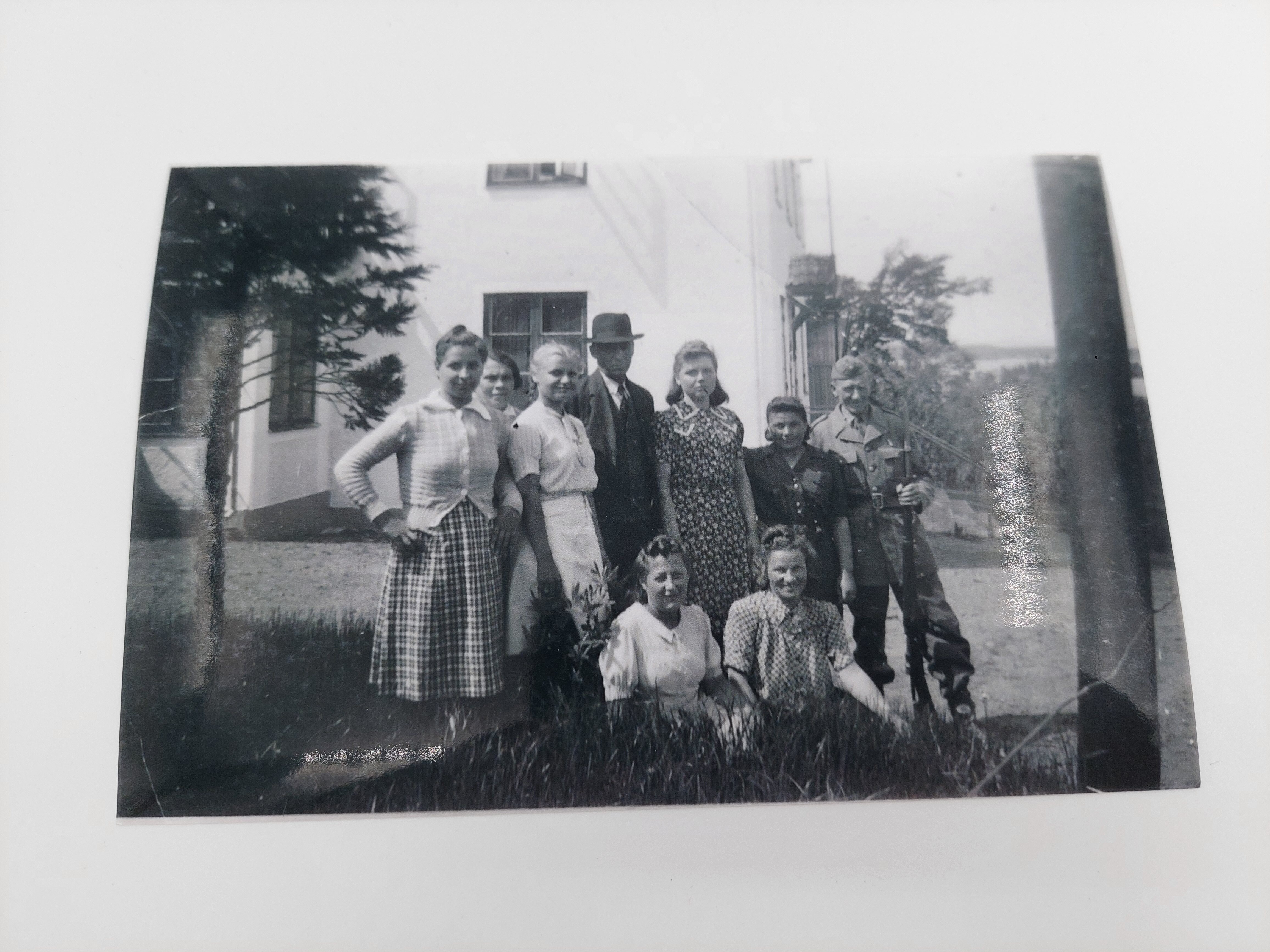 Kvinnor och soldater utanför ett hus. 3 juni 1945 i Bondstorp.