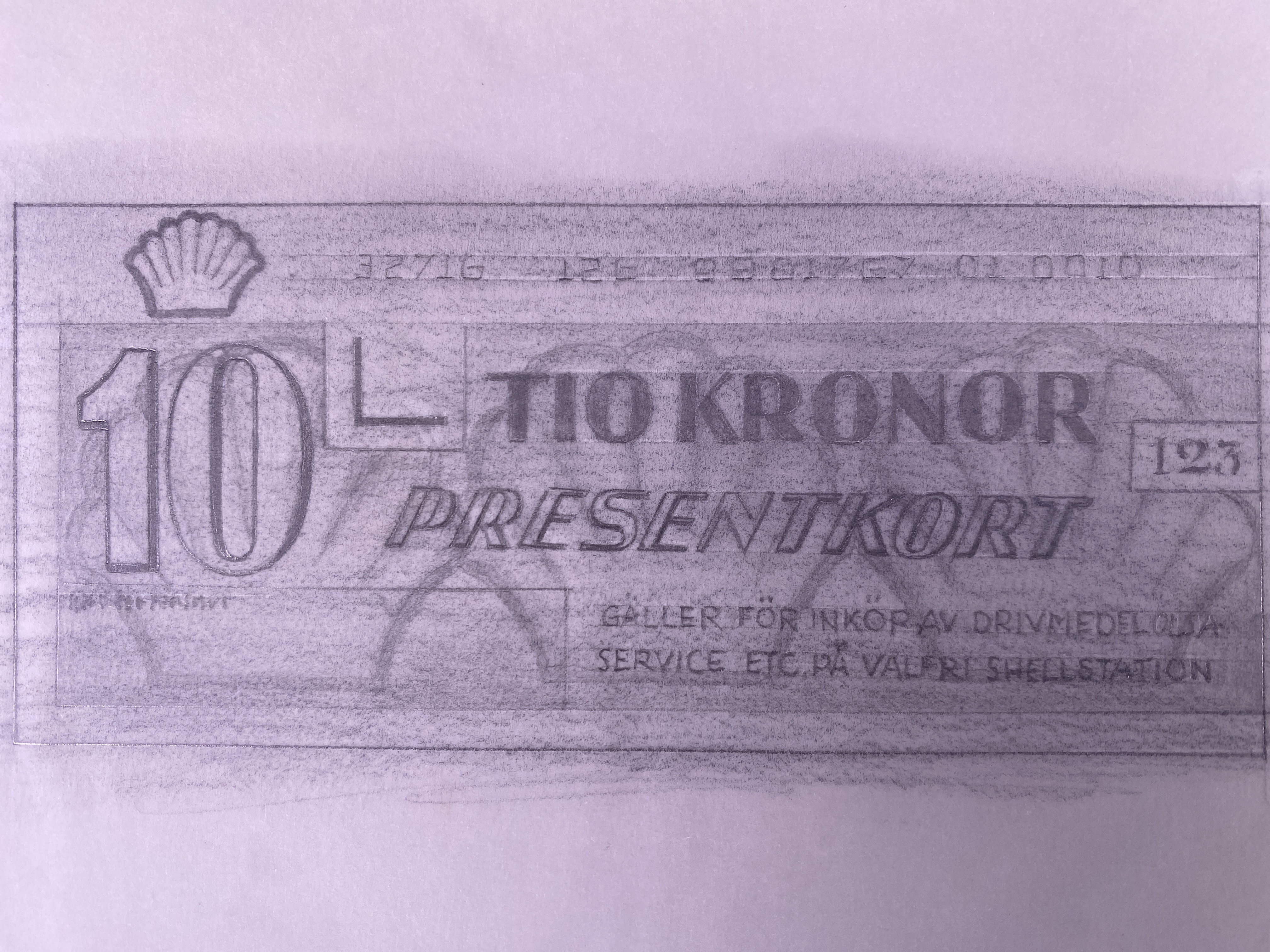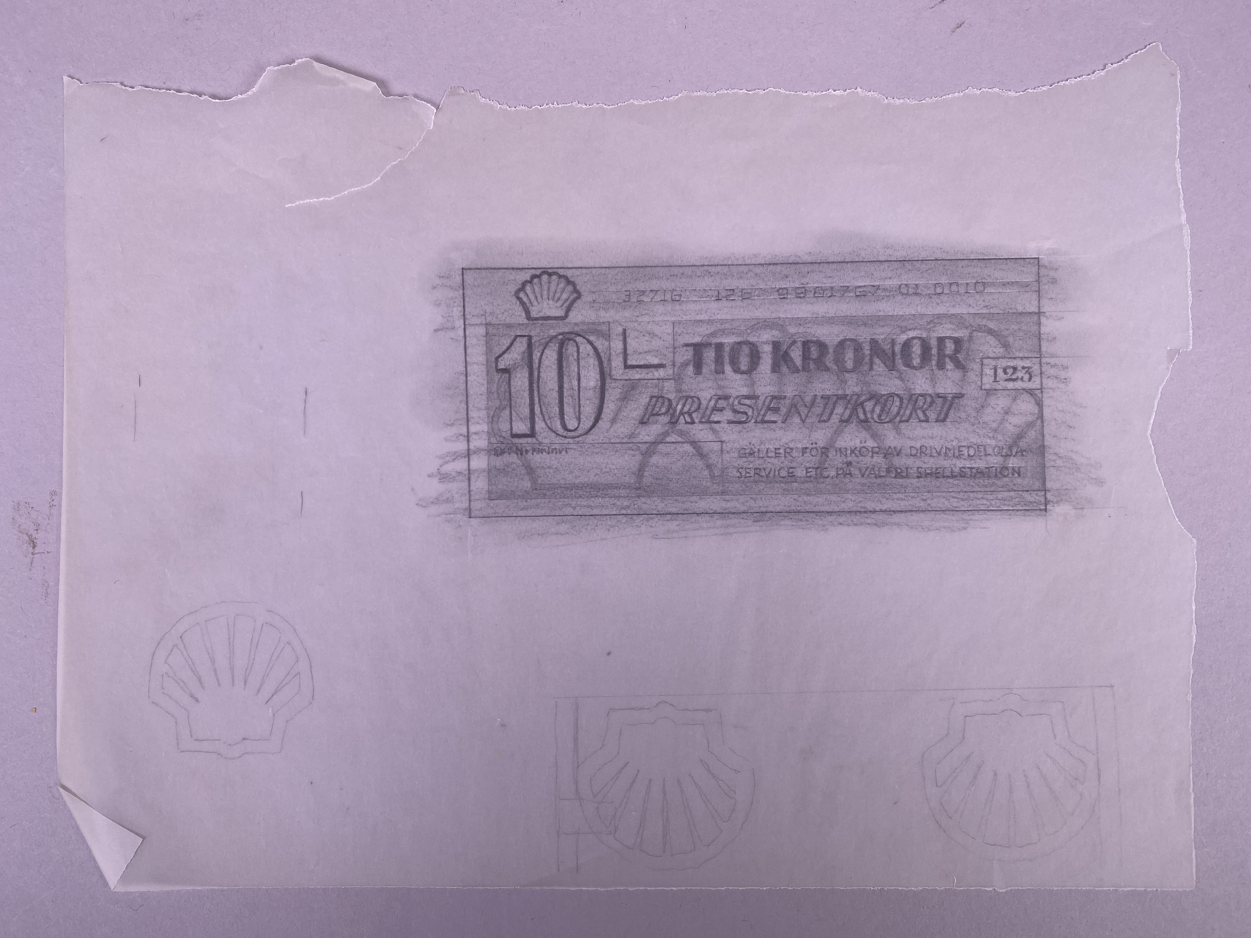 Skiss/förslag till presentkort till ett värde av 10 kronor vid köp av drivmedel, olja, service etc. på valfri Shellstation. Blyerts på vaxpapper, skador längs kanterna. Hör ihop med fotostatkopia 3145714, båda odaterade.