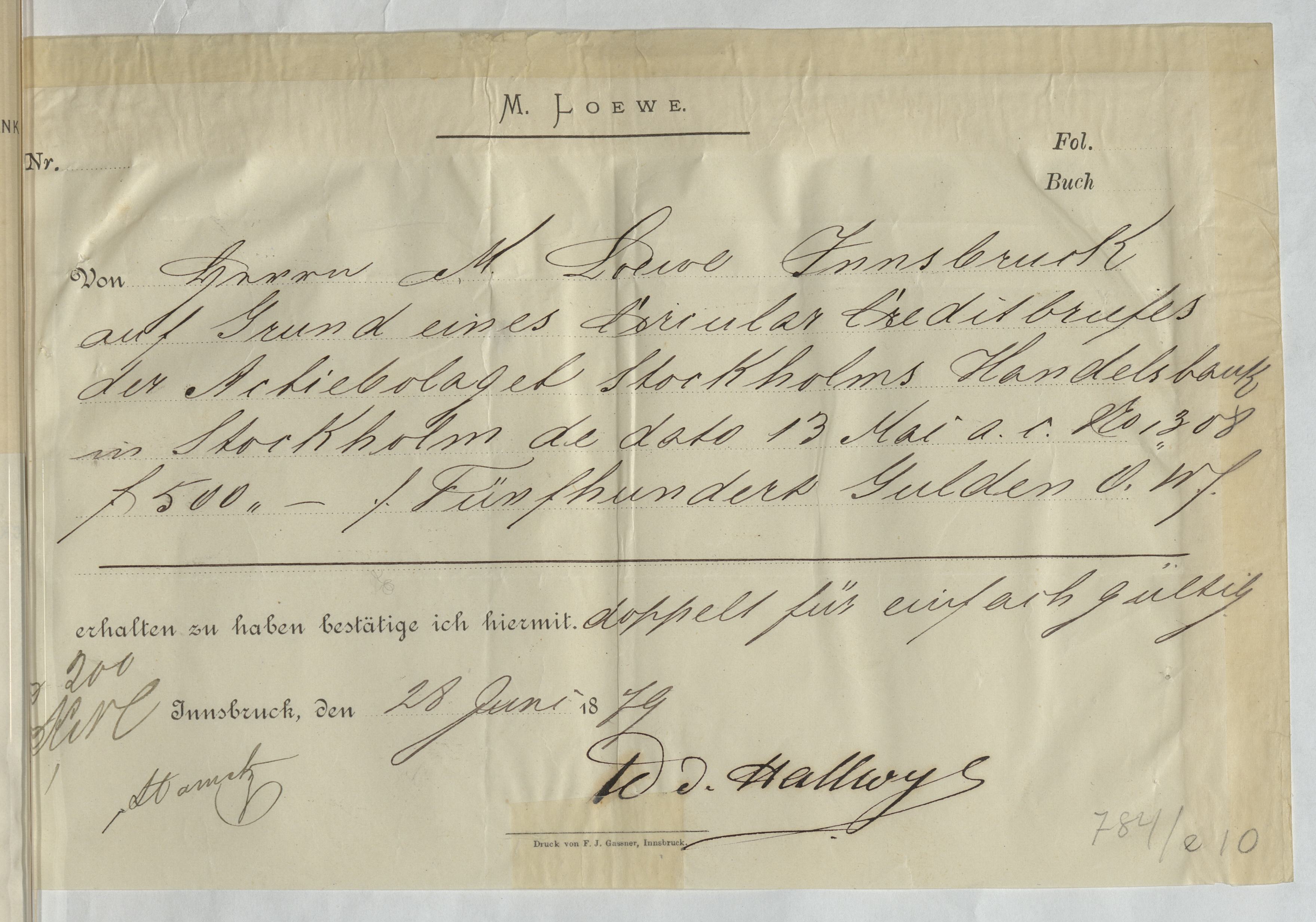 Kvitto från Aktiebolaget Stockholms Handelsbank rörande Loewe, M. Innsbruck