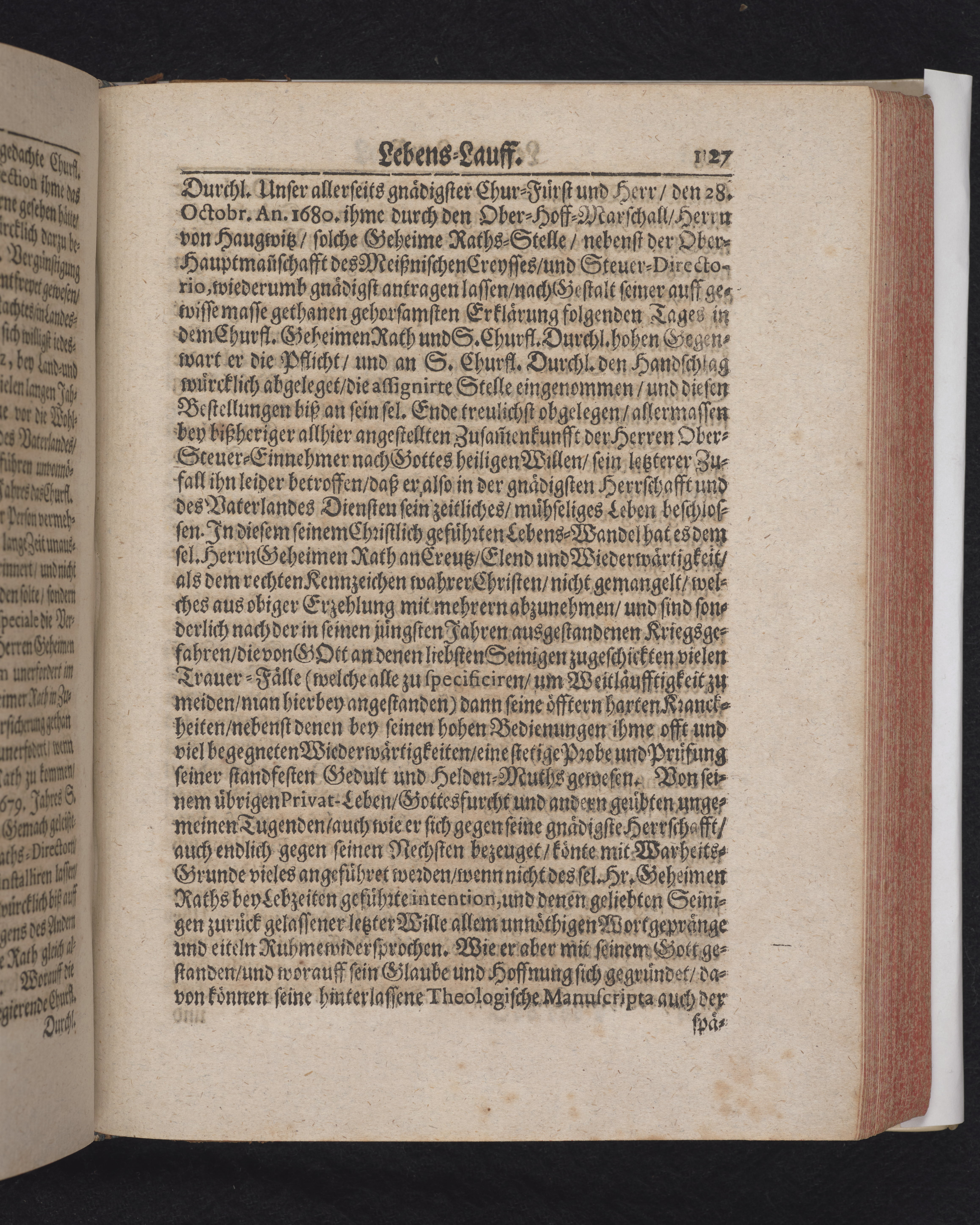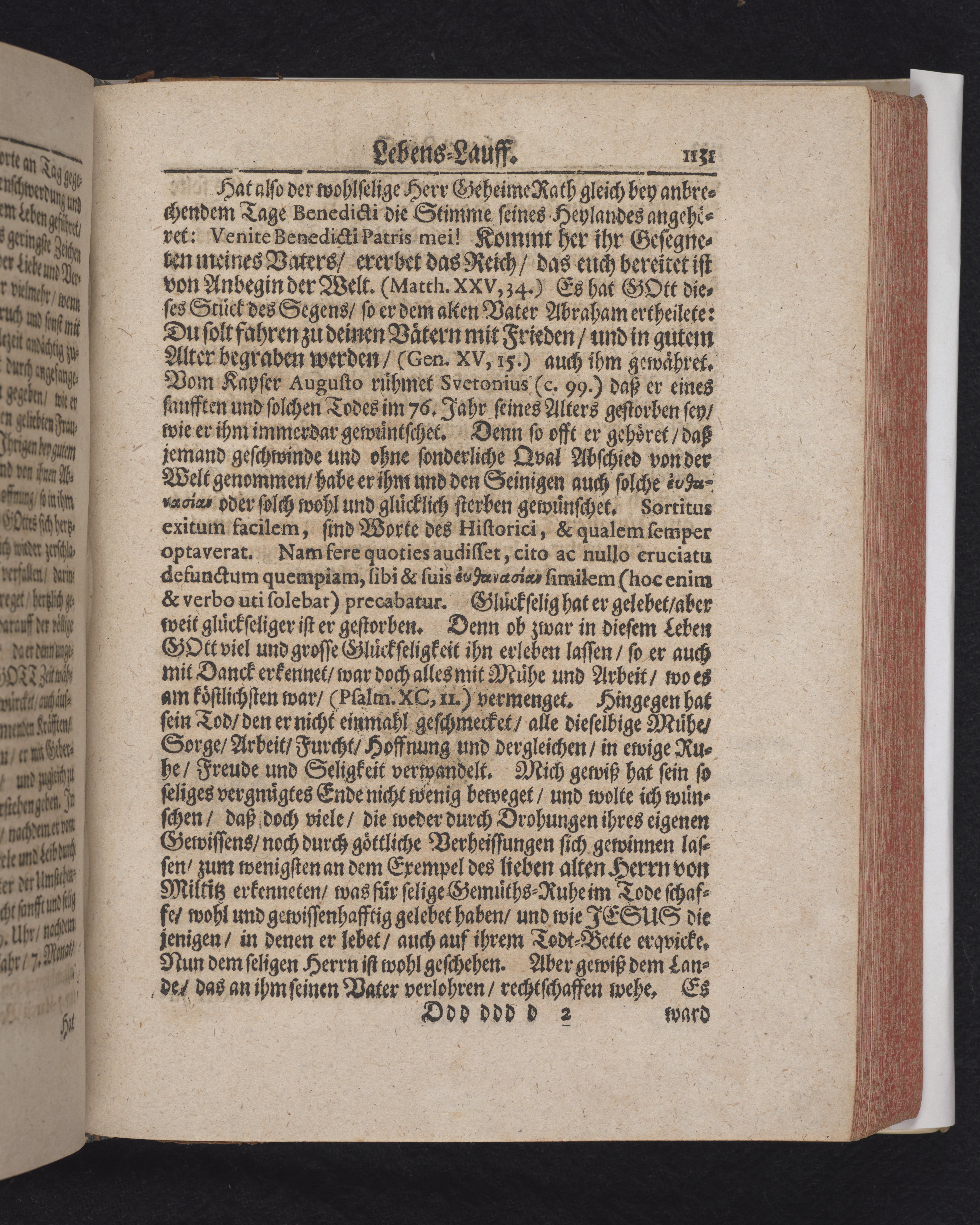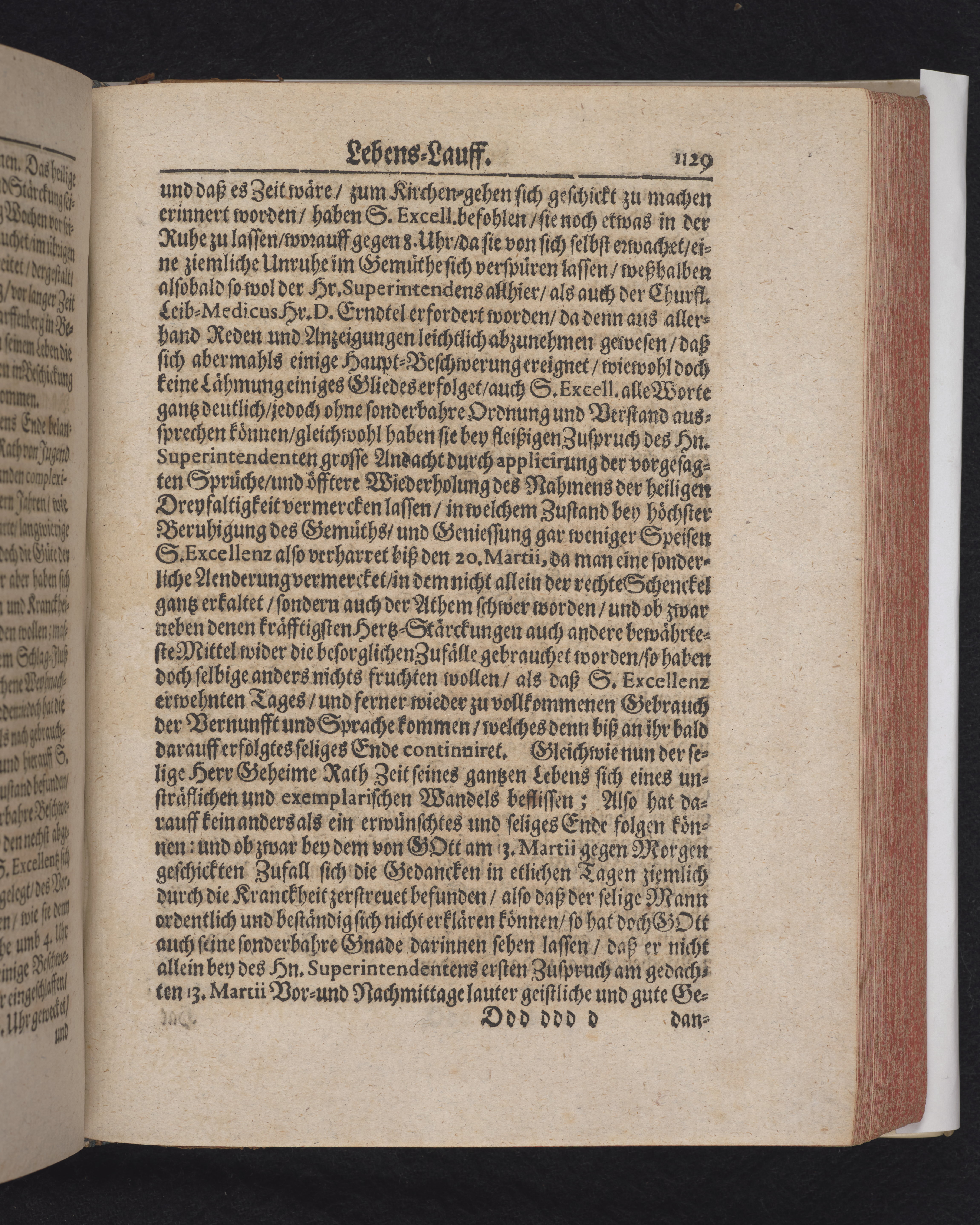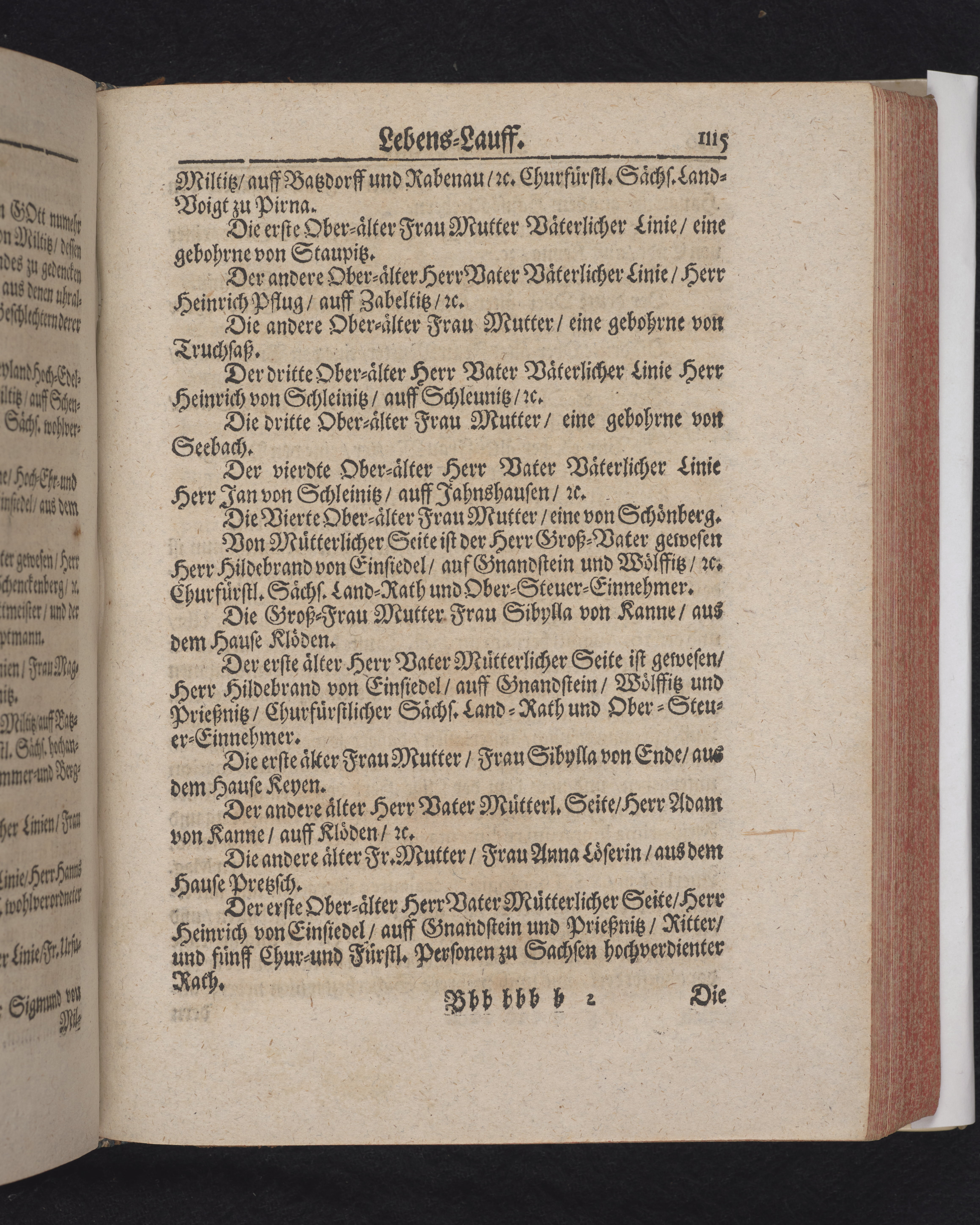 Ingår i en utgiven samling med 28 likpredikningar av Samuel Benedikt Carpzov: Grünende Gebeine, oder Leich-Predigten... Tryckt innehållsförteckning och register. Handskriven innehållsförteckning över de 28 likpredikningarna med bläck på främre försättsbladet (recto och verso).