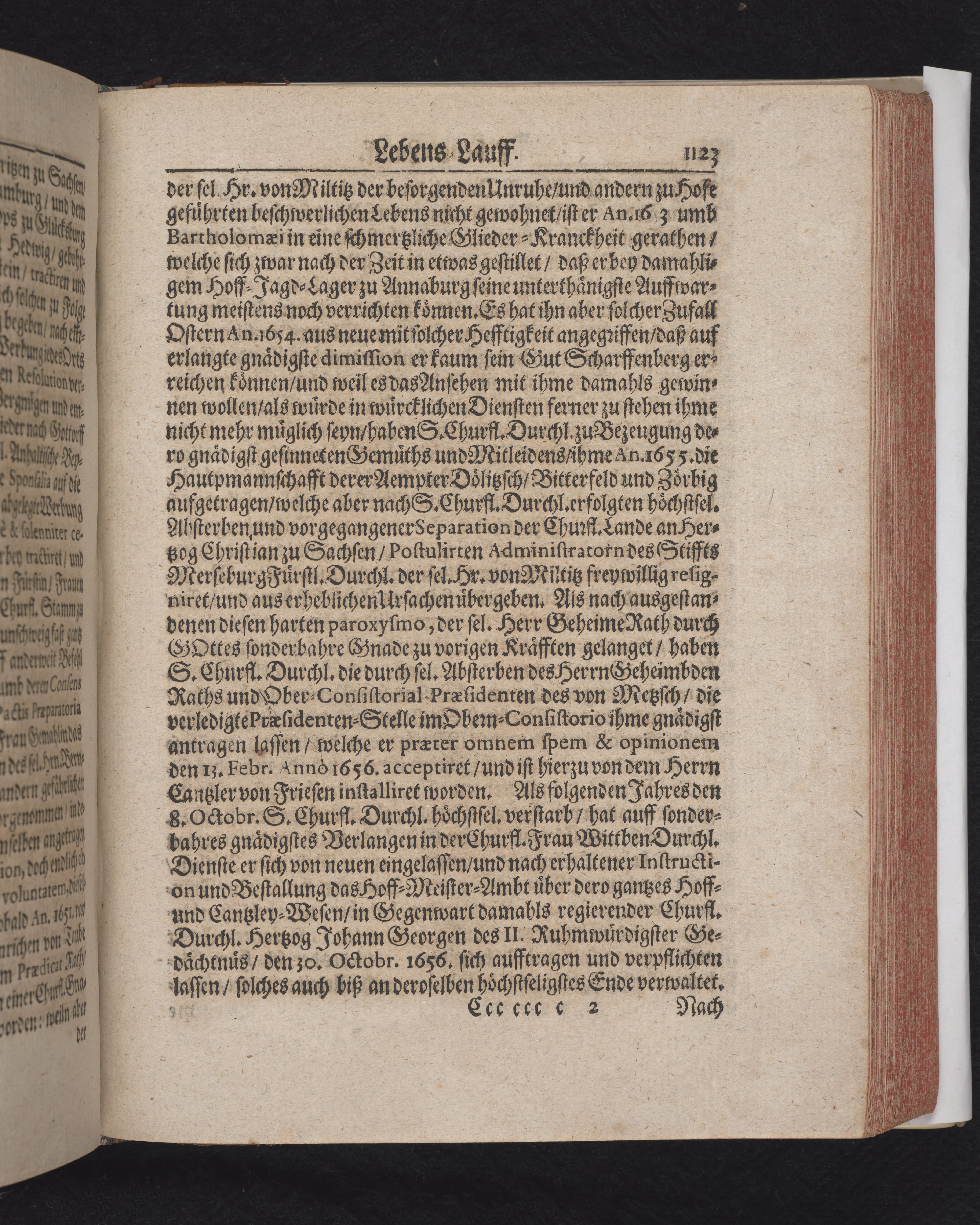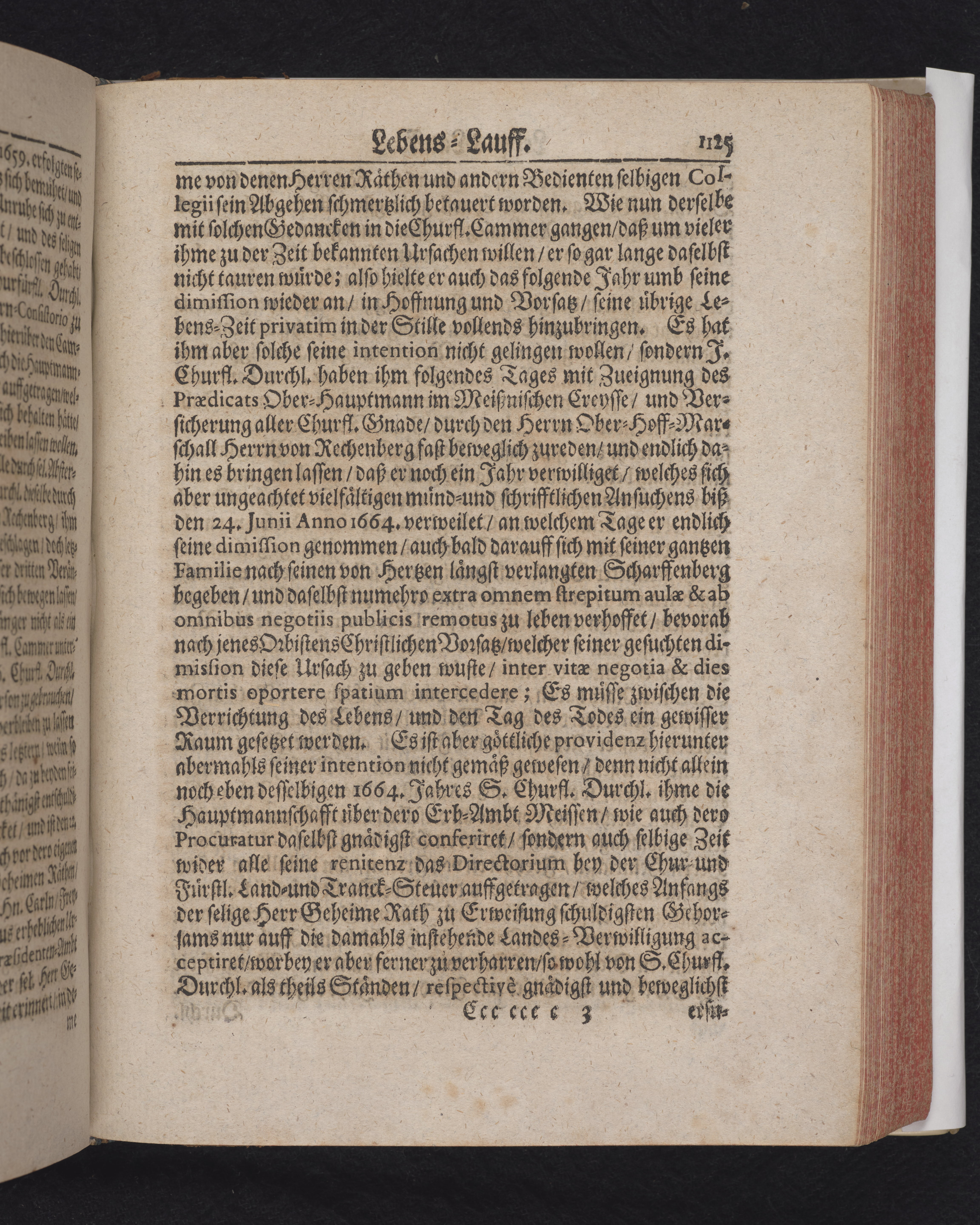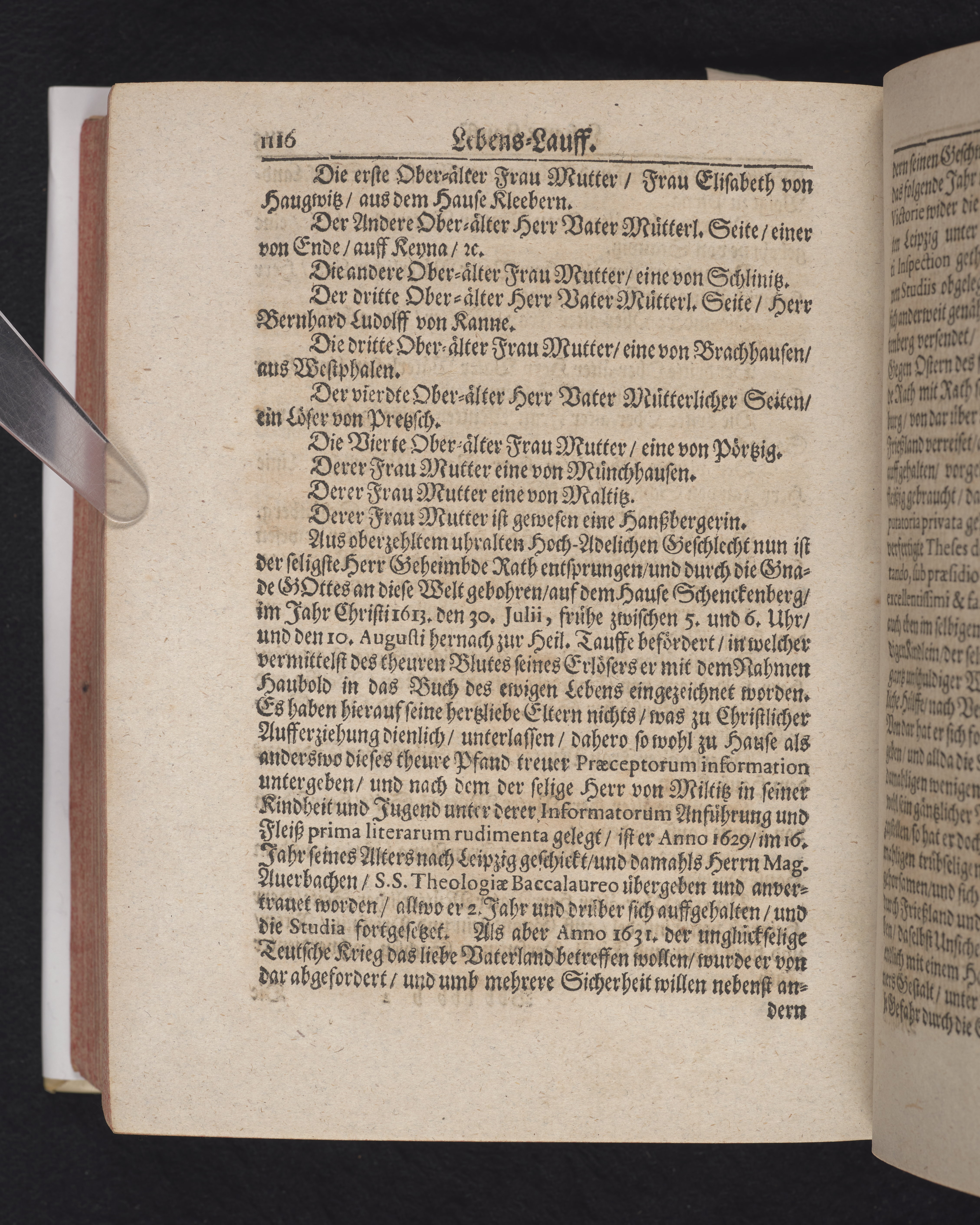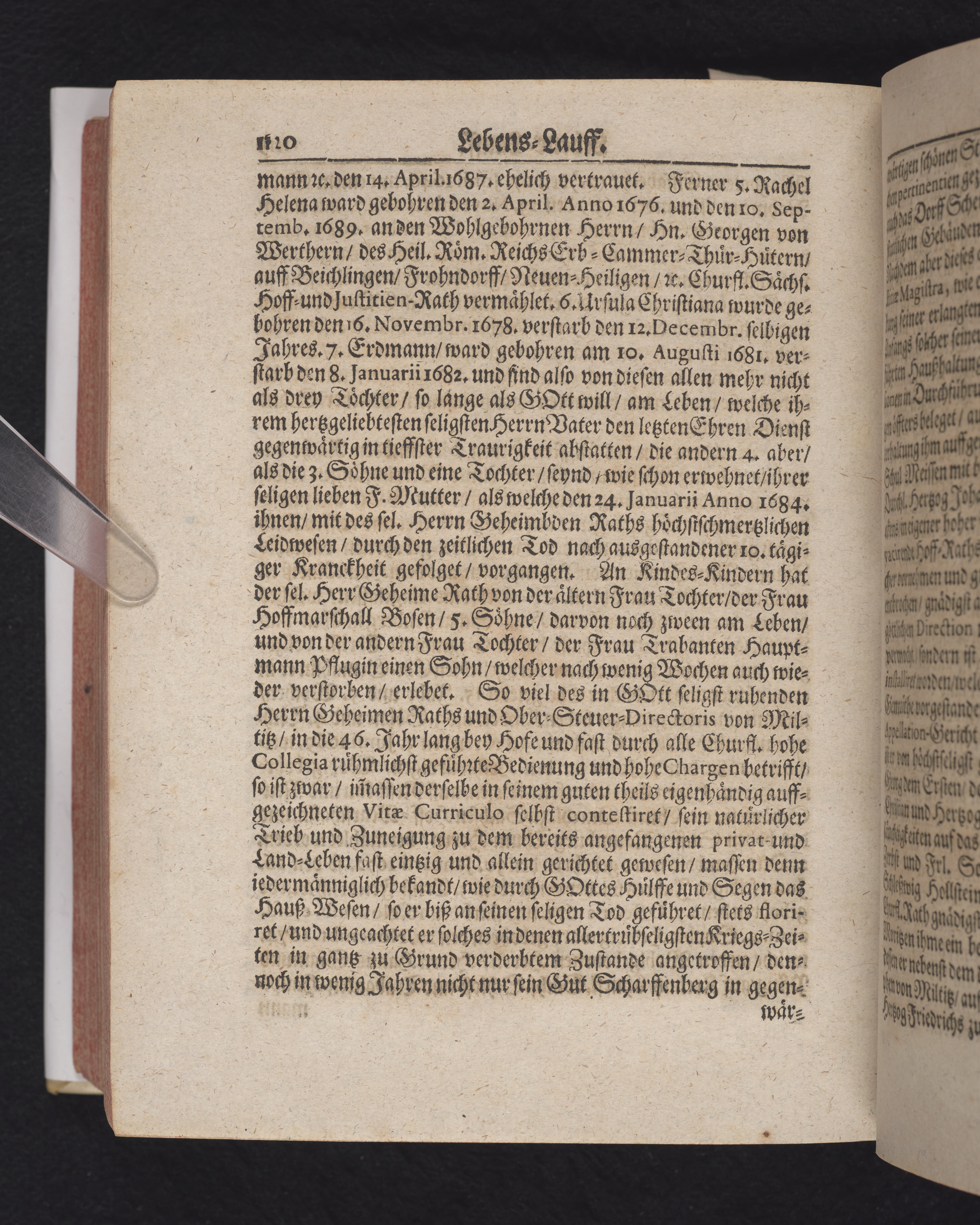 Ingår i en utgiven samling med 28 likpredikningar av Samuel Benedikt Carpzov: Grünende Gebeine, oder Leich-Predigten... Tryckt innehållsförteckning och register. Handskriven innehållsförteckning över de 28 likpredikningarna med bläck på främre försättsbladet (recto och verso).