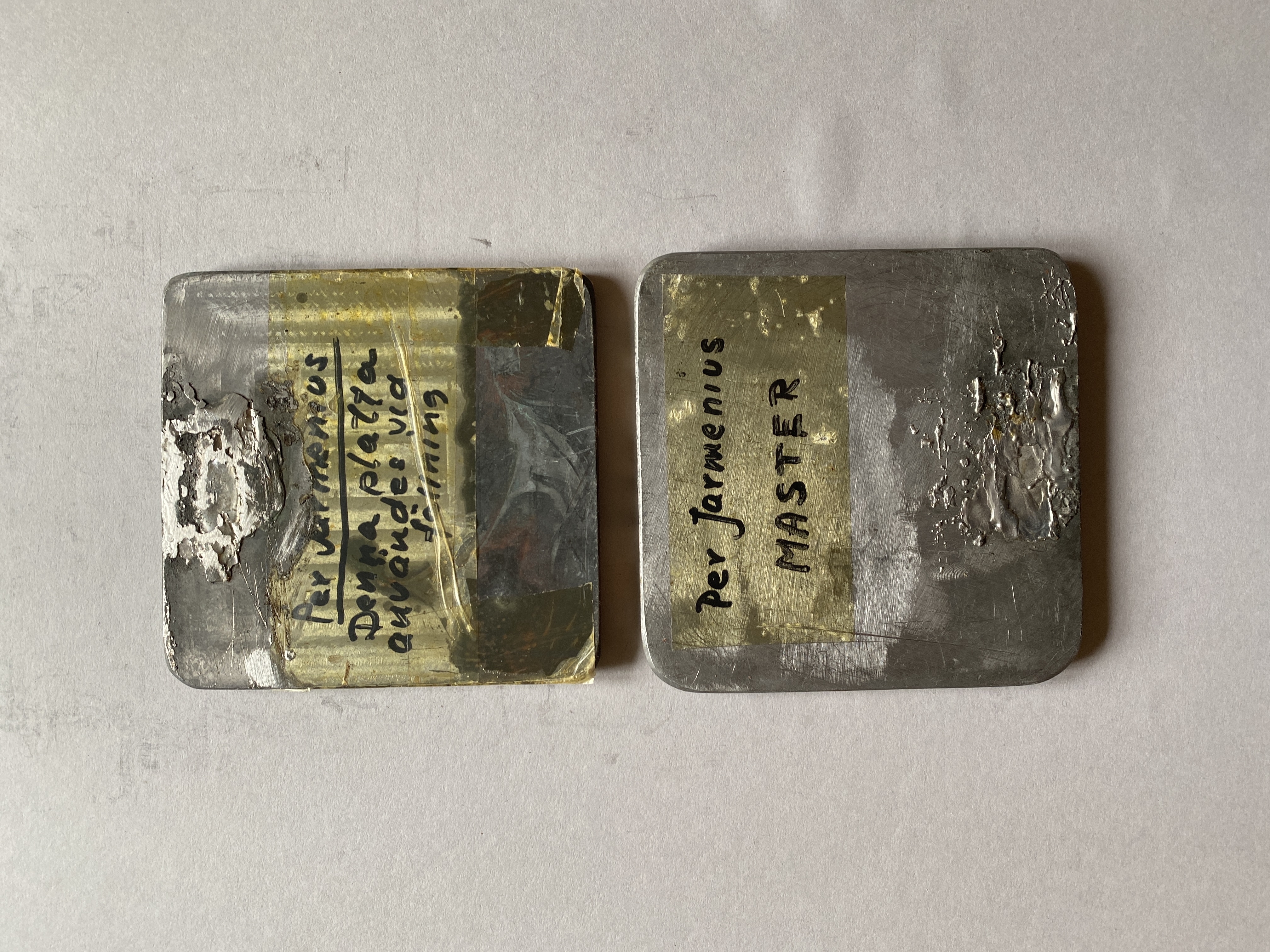 Pressplatta för vattenmärkestillverkning: "Per Jarmenius MASTER". 2 stycken. Text på baksidan av plattorna: Per Jarmenius/Denna platta användes vid fällning/Per Jarmenius MASTER. Text på framsidan: Matris(?)/4.