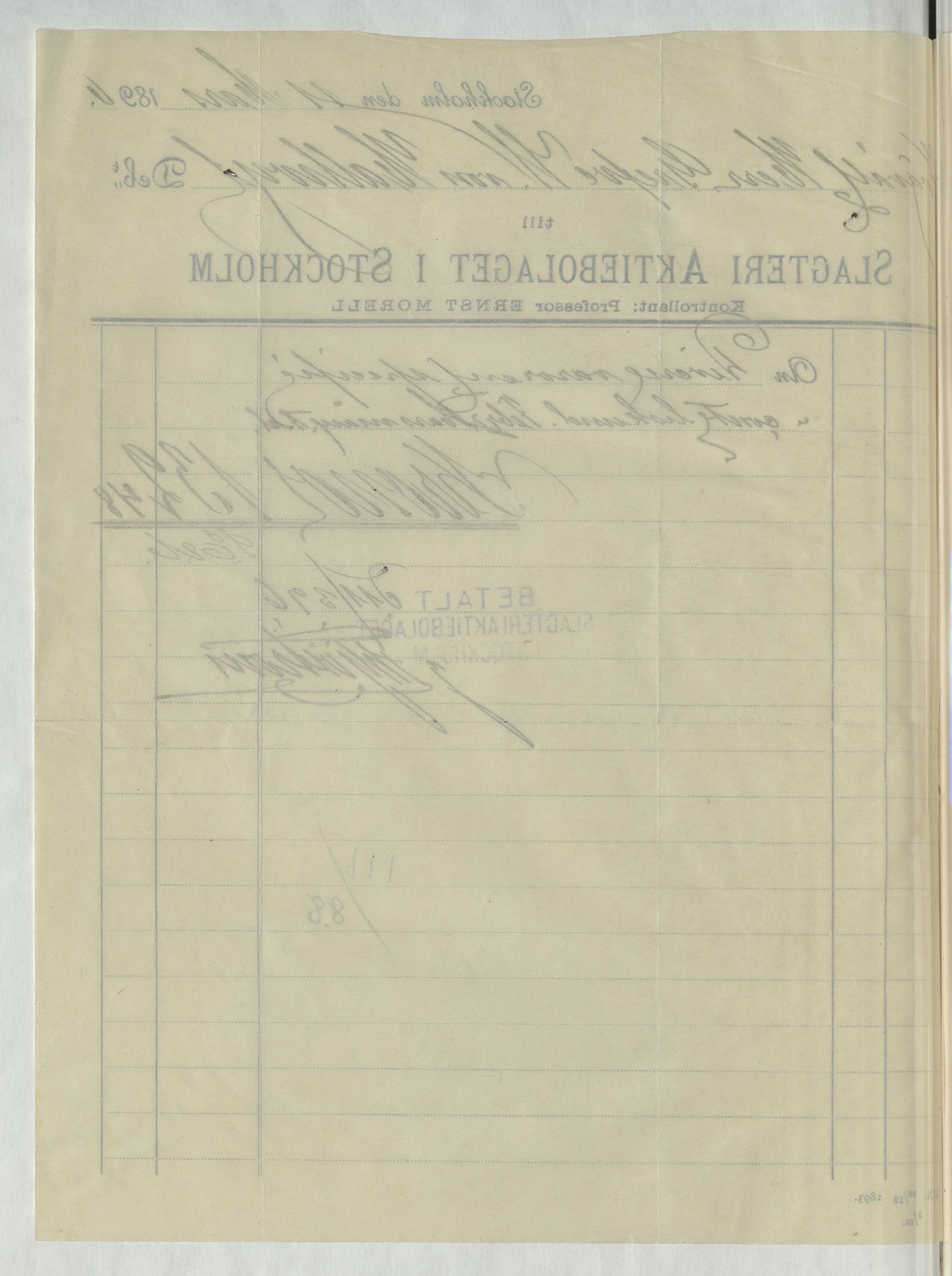 Kvitto från Slagteri Aktiebolaget i Stockholm