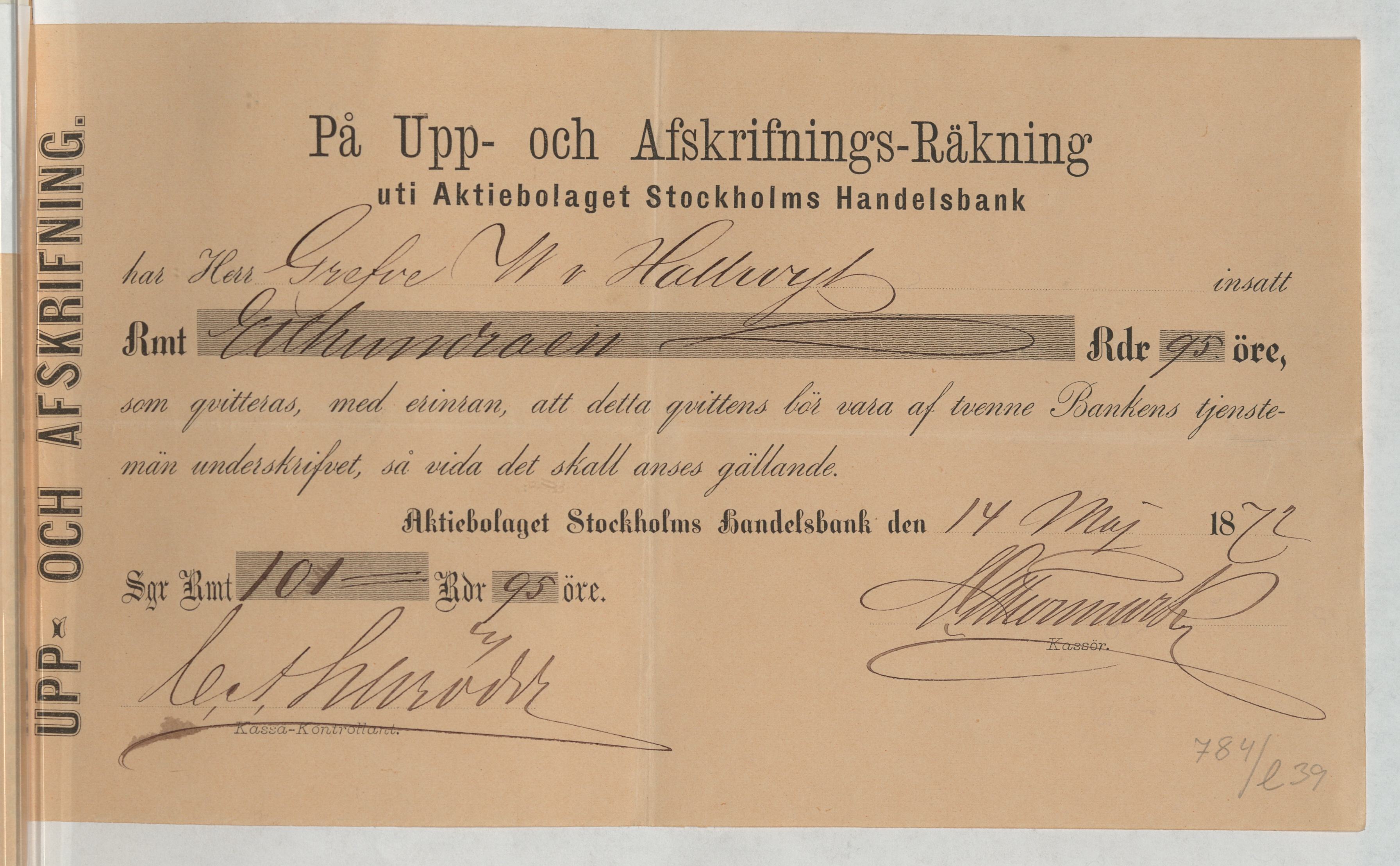 Kvitto från Aktiebolaget Stockholms Handelsbank rörande Upp- och Afskrifnings-Räkning