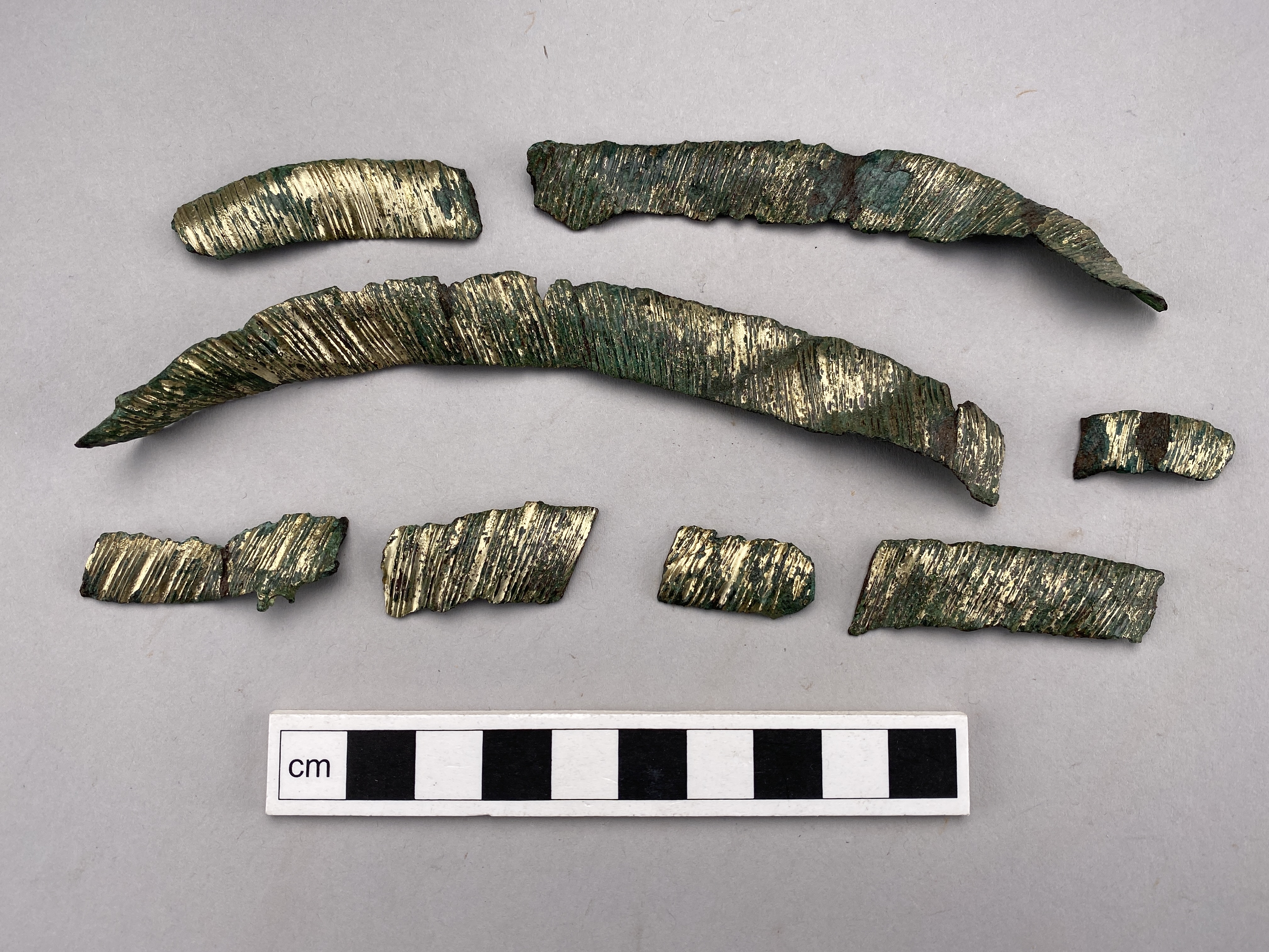 fragment av sidorna av en hjälmkam. Dekor av snedställda fält med ränder. Ska ursprungligen ha funnits 11 fragment. Lätt böjda
