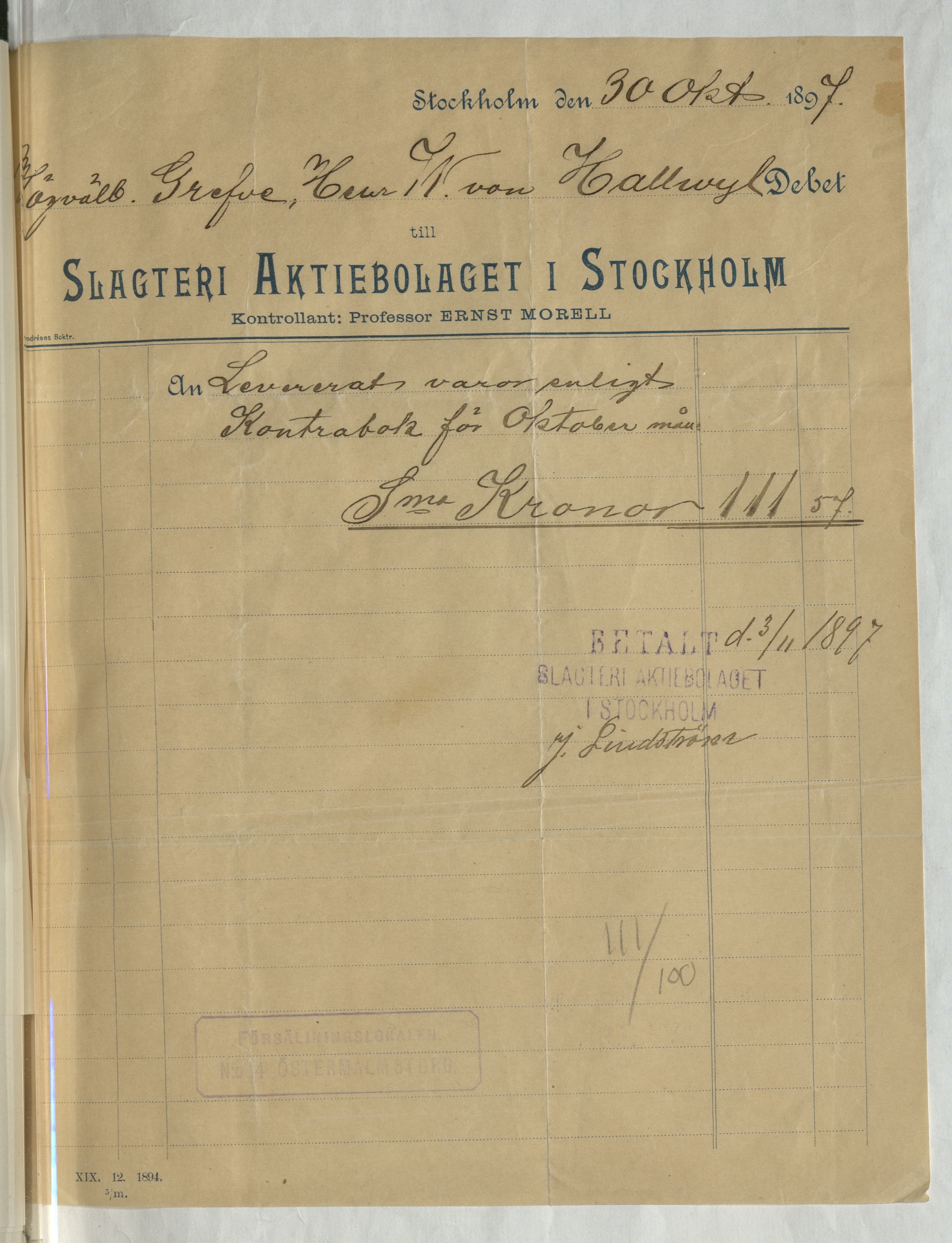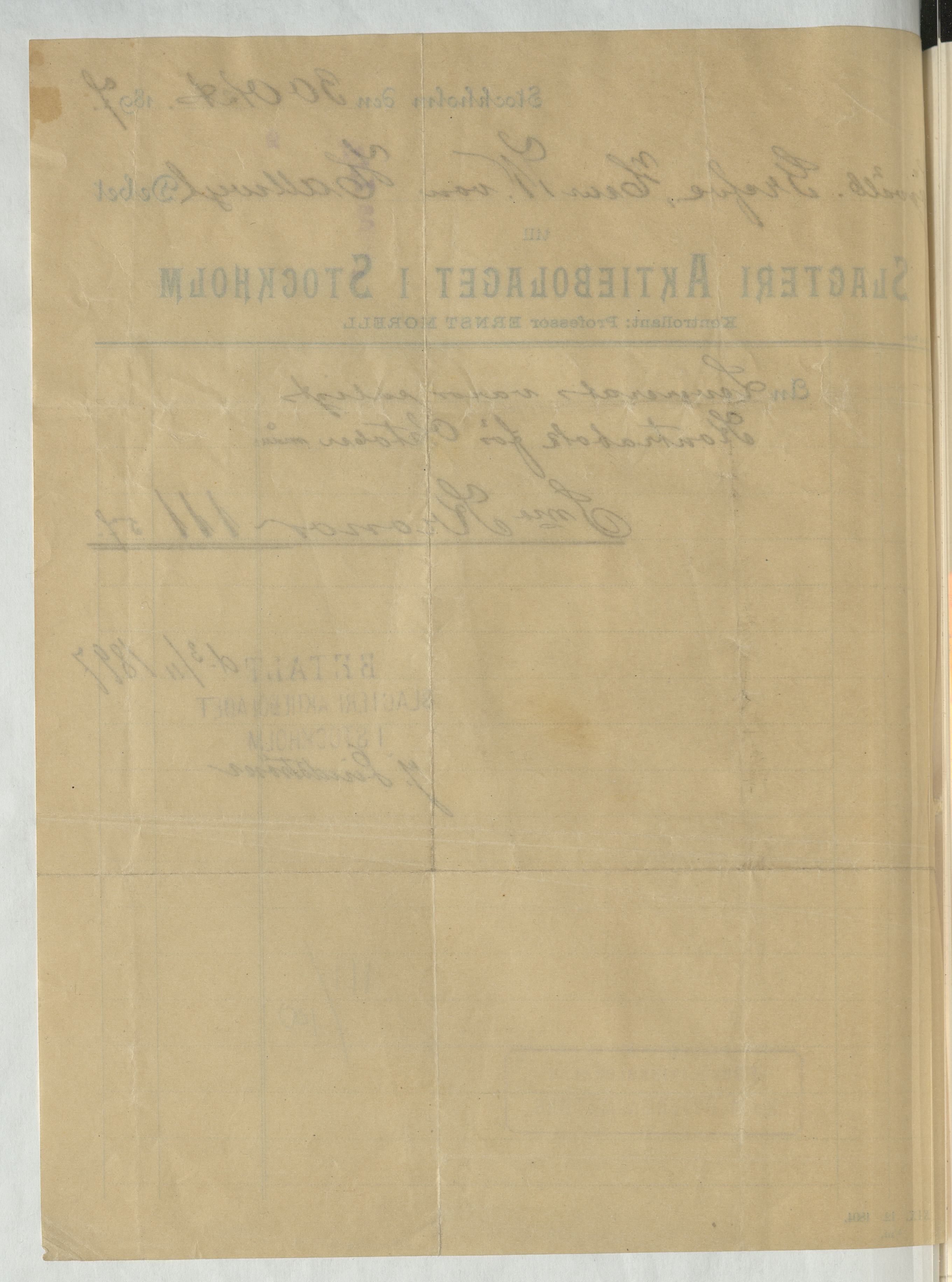 Kvitto från Slagteri Aktiebolaget i Stockholm