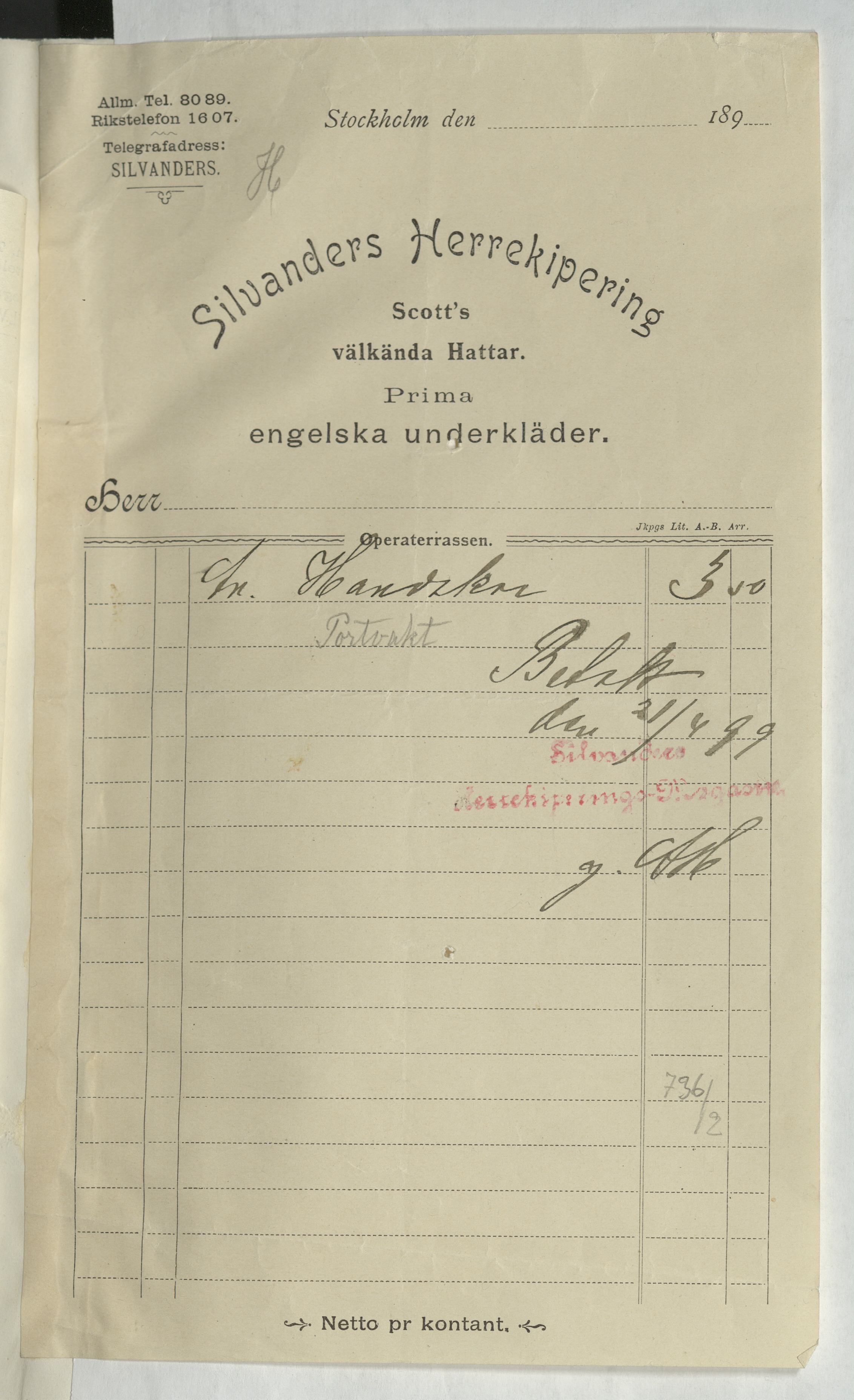 Kvitto från Silvanders Herrekipering. Gällande inköp av handskar. Stockholm, 1899.
