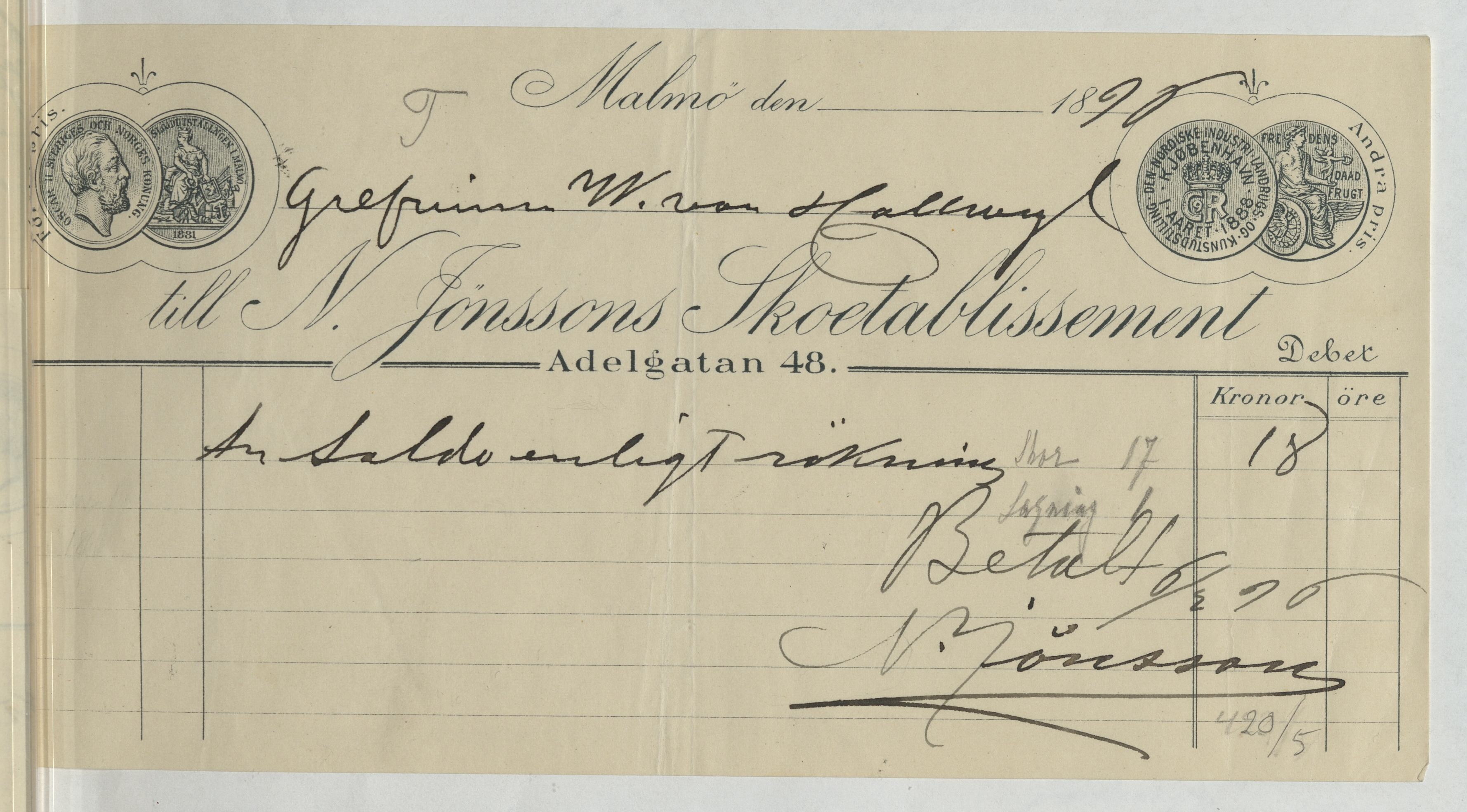 Kvitto från N. Jönssons Skoetablissement. Gällande inköp och lagning av skor. Malmö, 1896.
