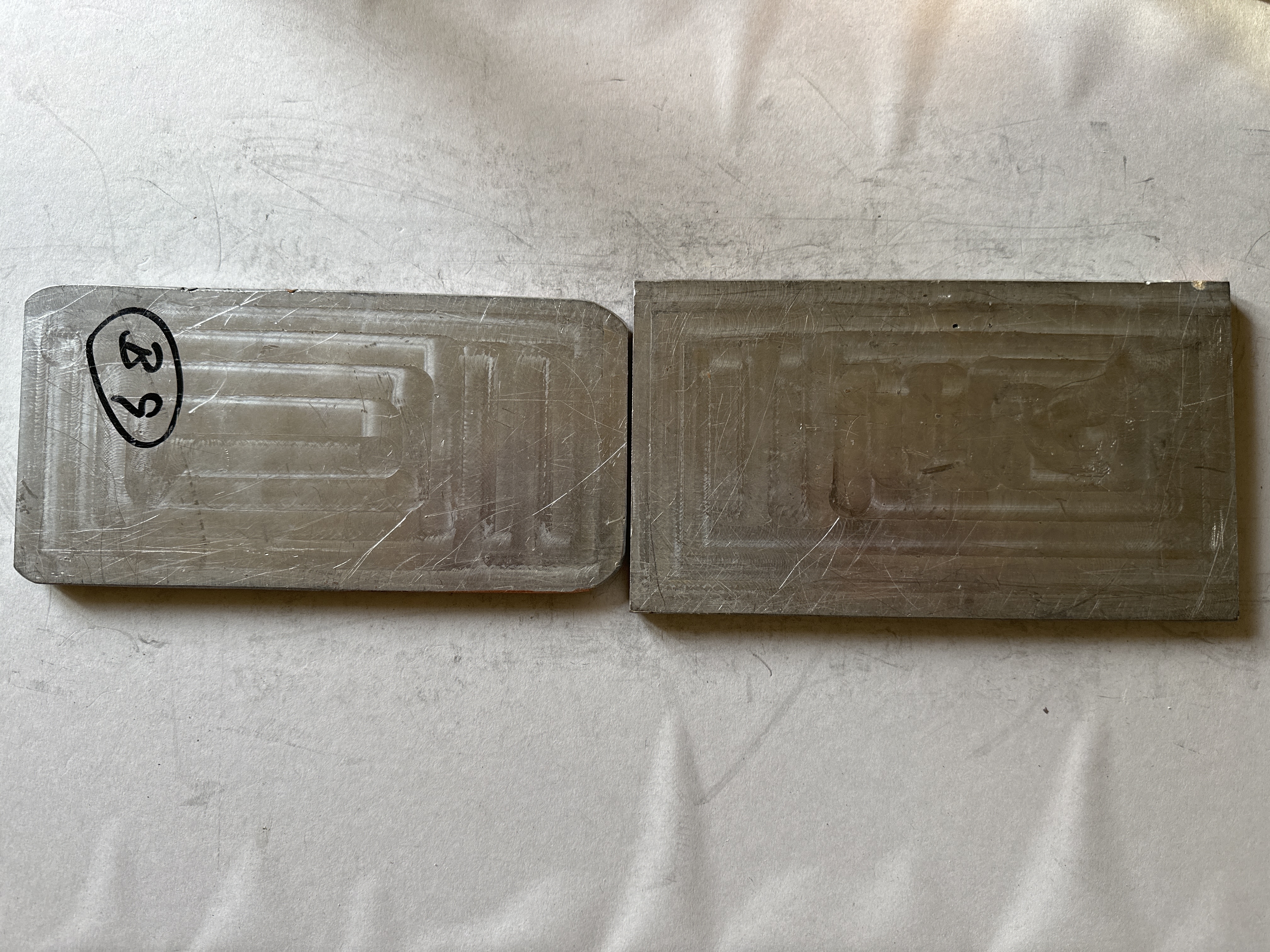 Pressplattor för vattenmärkestillverkning. Två rektangulära plattor, matris och patris, tillverkad i koppar och bly. Patrisen med fasade hörn. Plattorna med motiv föreställande lejon-kapitälen av Ashoka, samt skriften "RBI 20". Text på framsidan av båda plattorna: "FÄLLD PÅ ENGELK PLATTA B.37". Text på baksidan av patrisen: "B9".