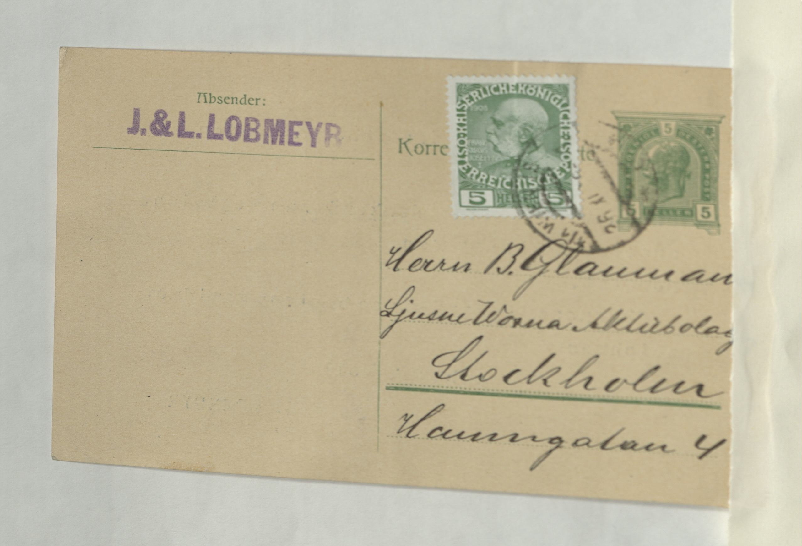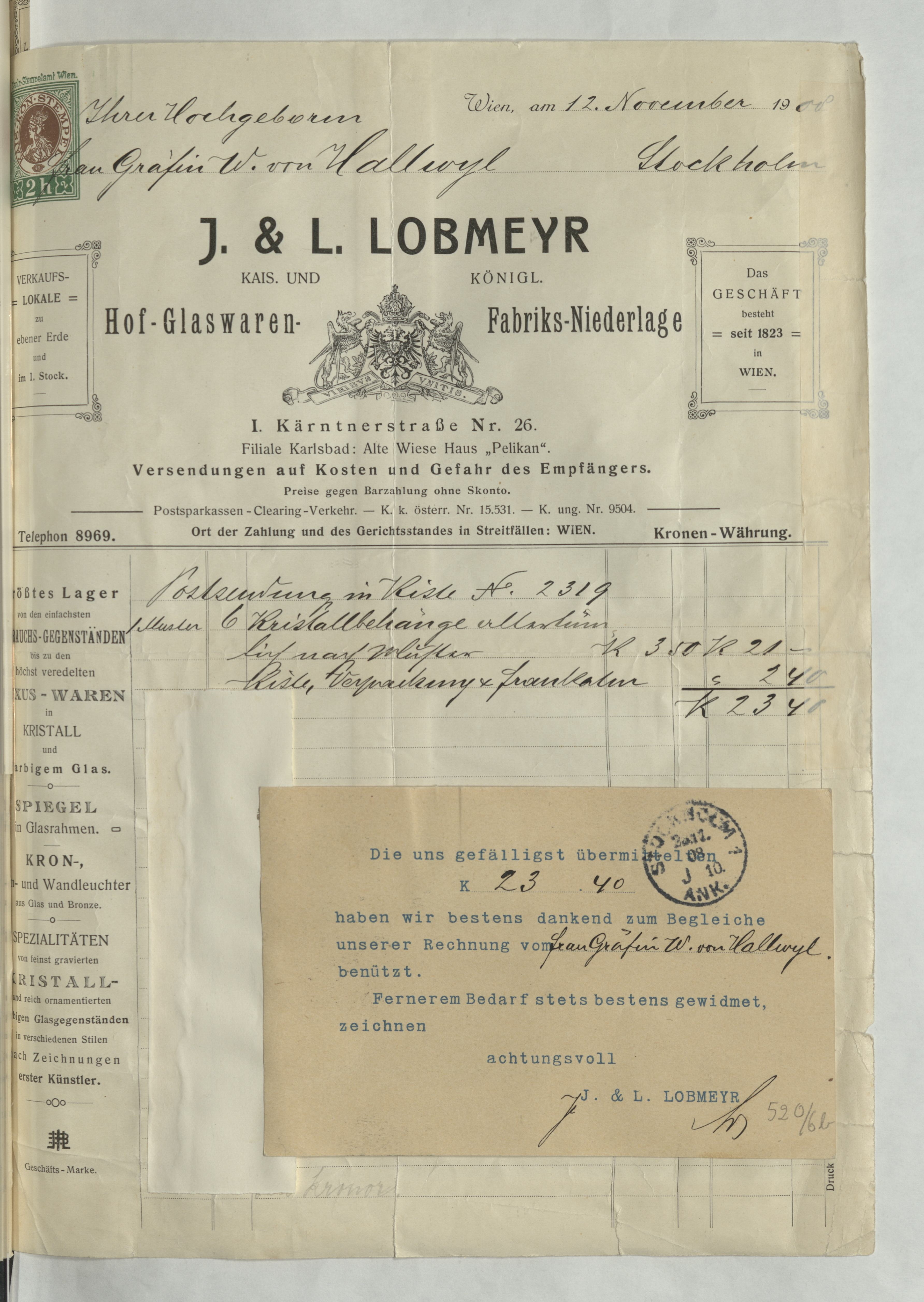 Verifikation på försändelse, av J. & L. Lobmeyer, Wien, till Greve Walther von Hallwyl, Stockholm, 1908.