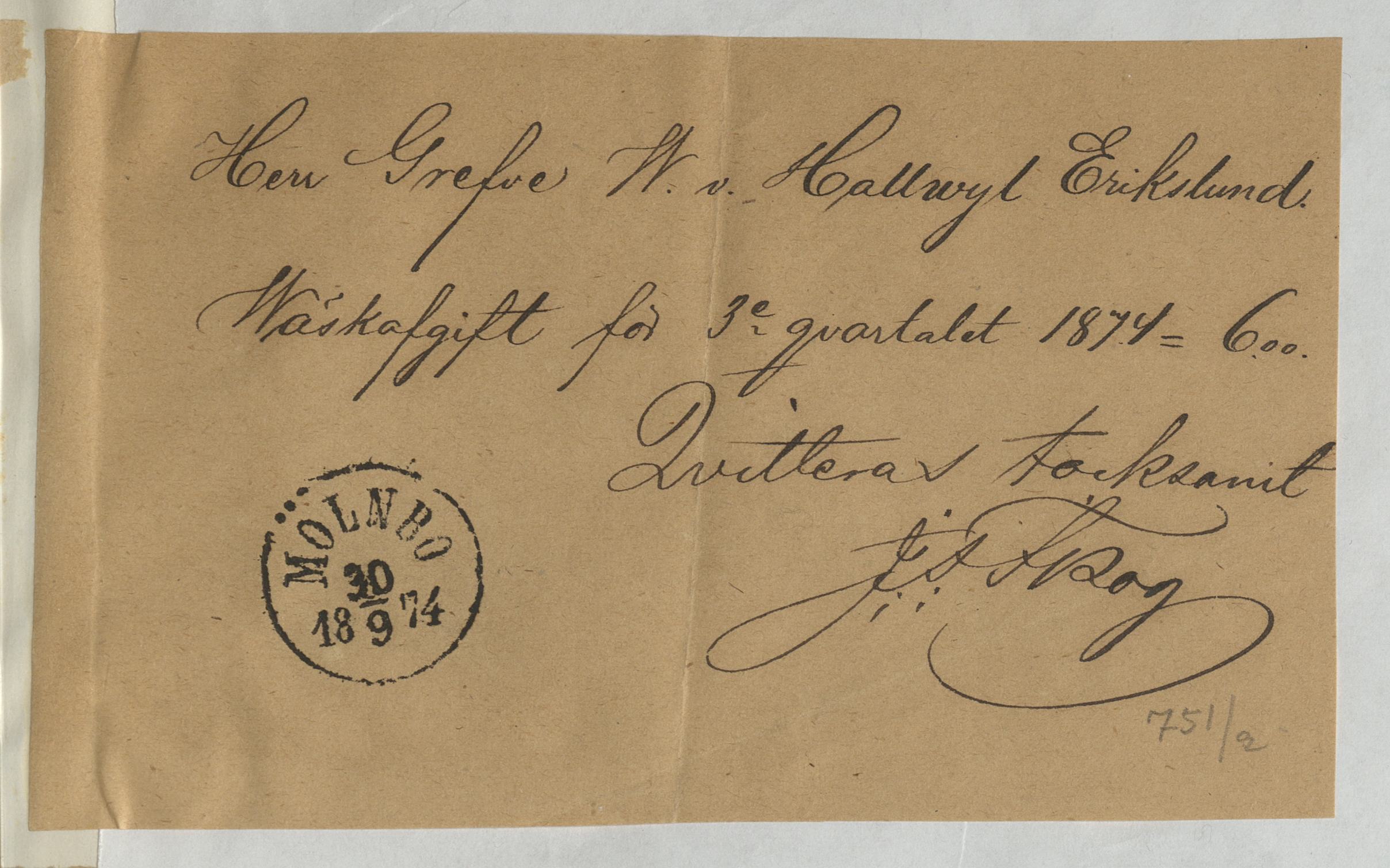 Kvitto från J. F. Skog. Postföreståndare, Mölnbo 1874.
