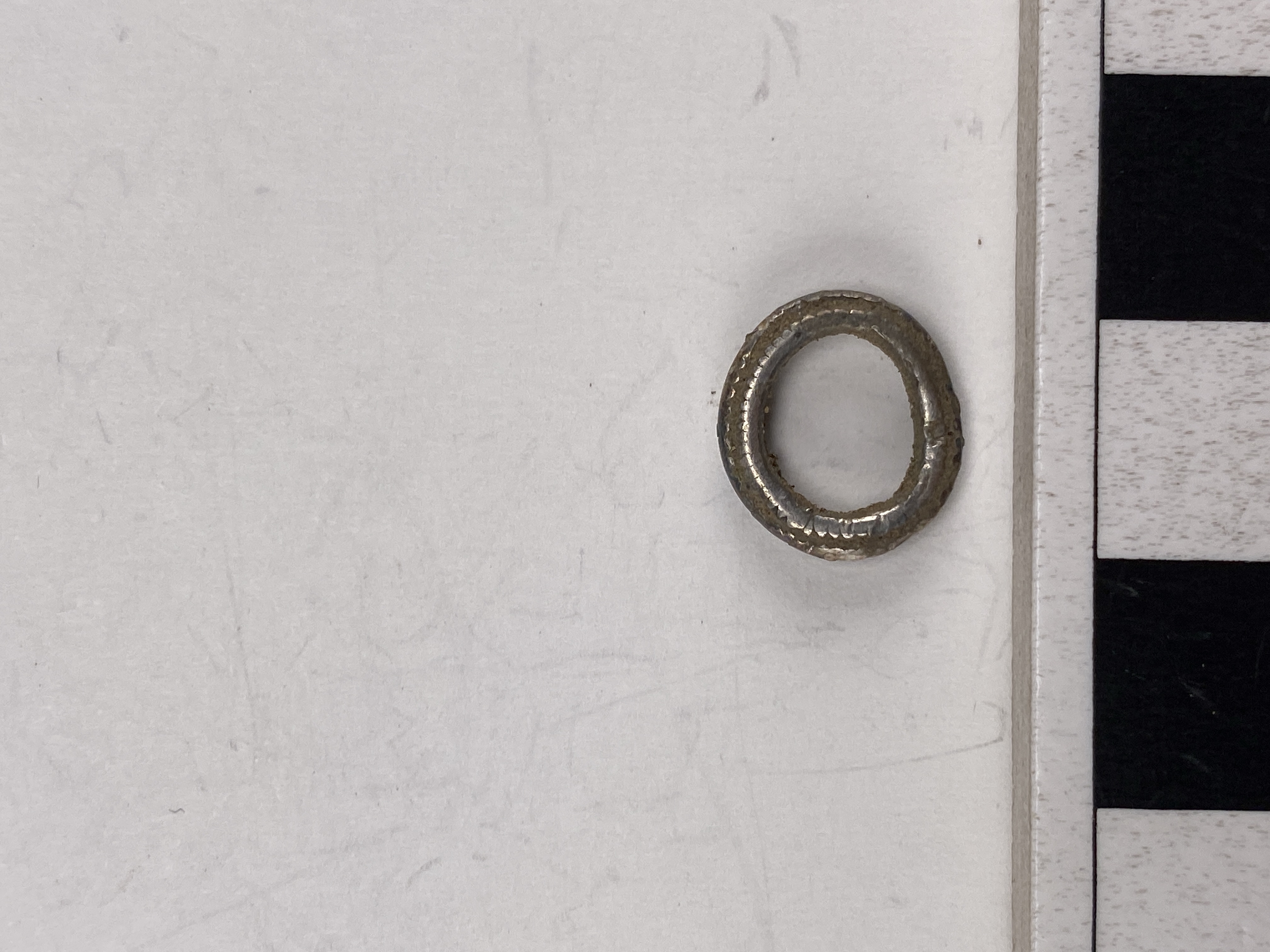 Liten dekorerad ring, upphängningsring till myntkedja eller enkolpion? Dekoren utgörs av en skåra på båda sidor. Skårorna kantas av mycket små flikar på ömse sidor. Har möjligen hört till hängsmycke.