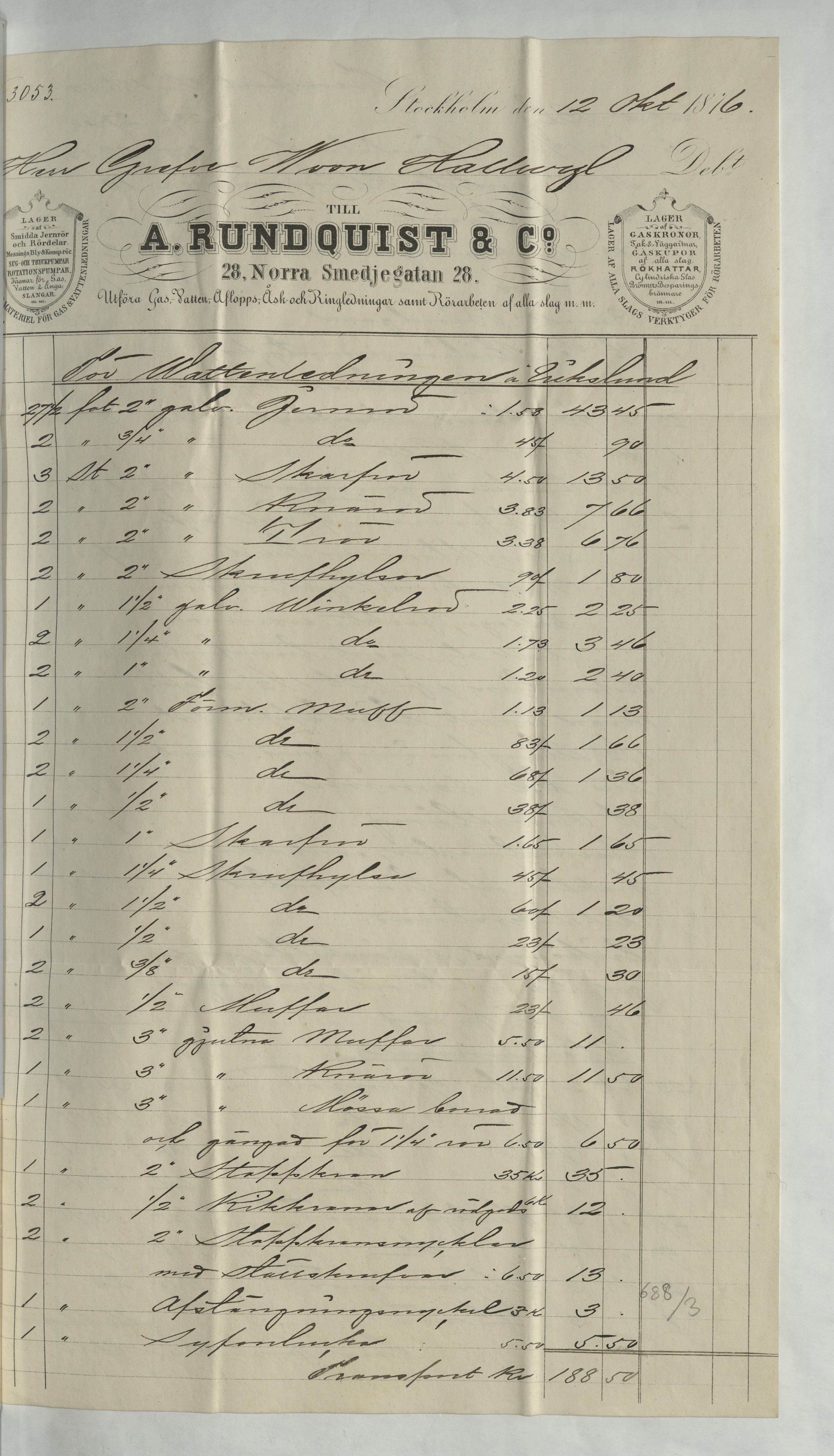 Kvitto från A. Rosberg & Co, ang "rörarbeten", till Greve W. von Hallwyl på Erikslund. Totalsumma 188:50Kr. Stockholm 12 oktober 1876.