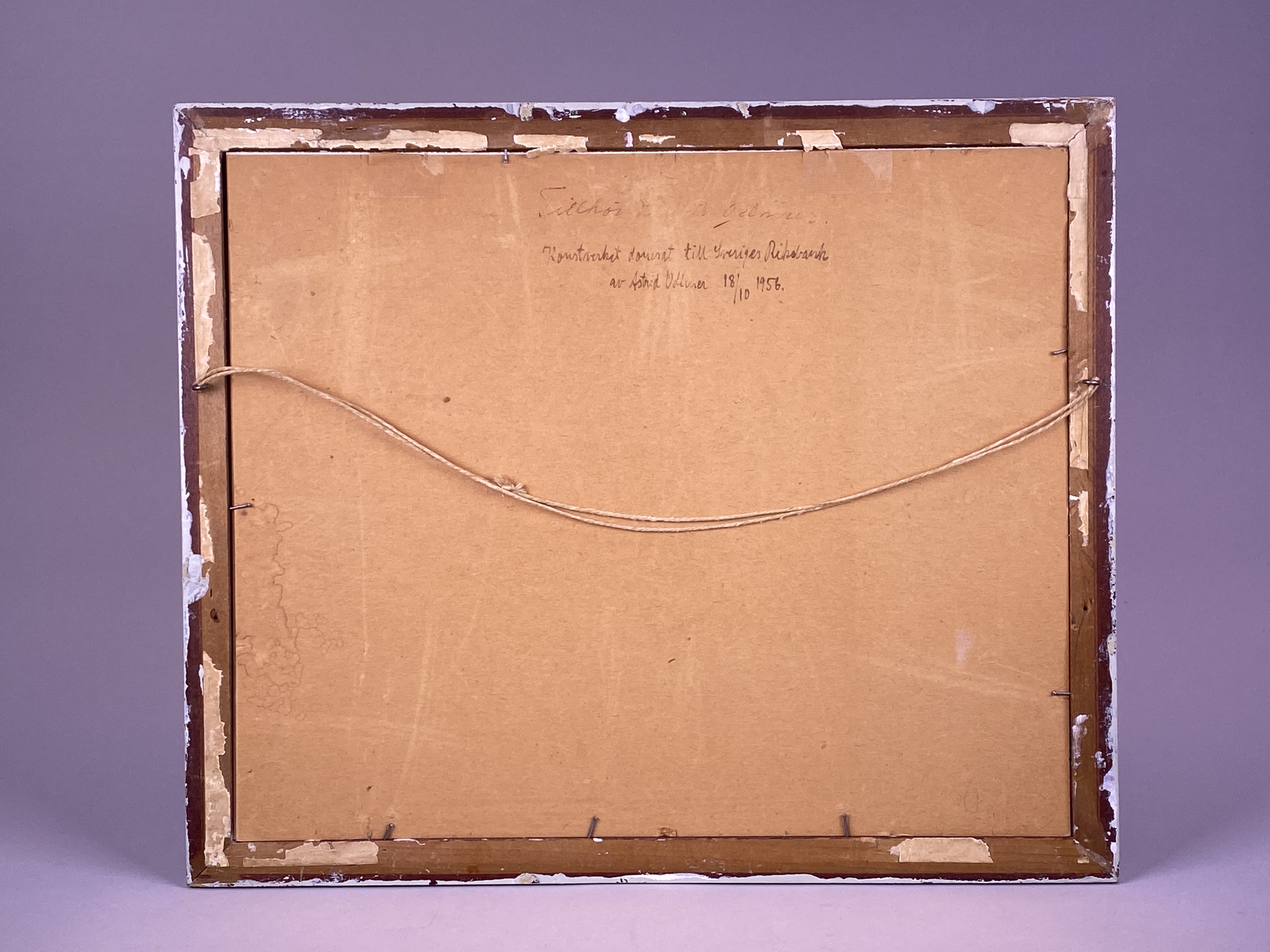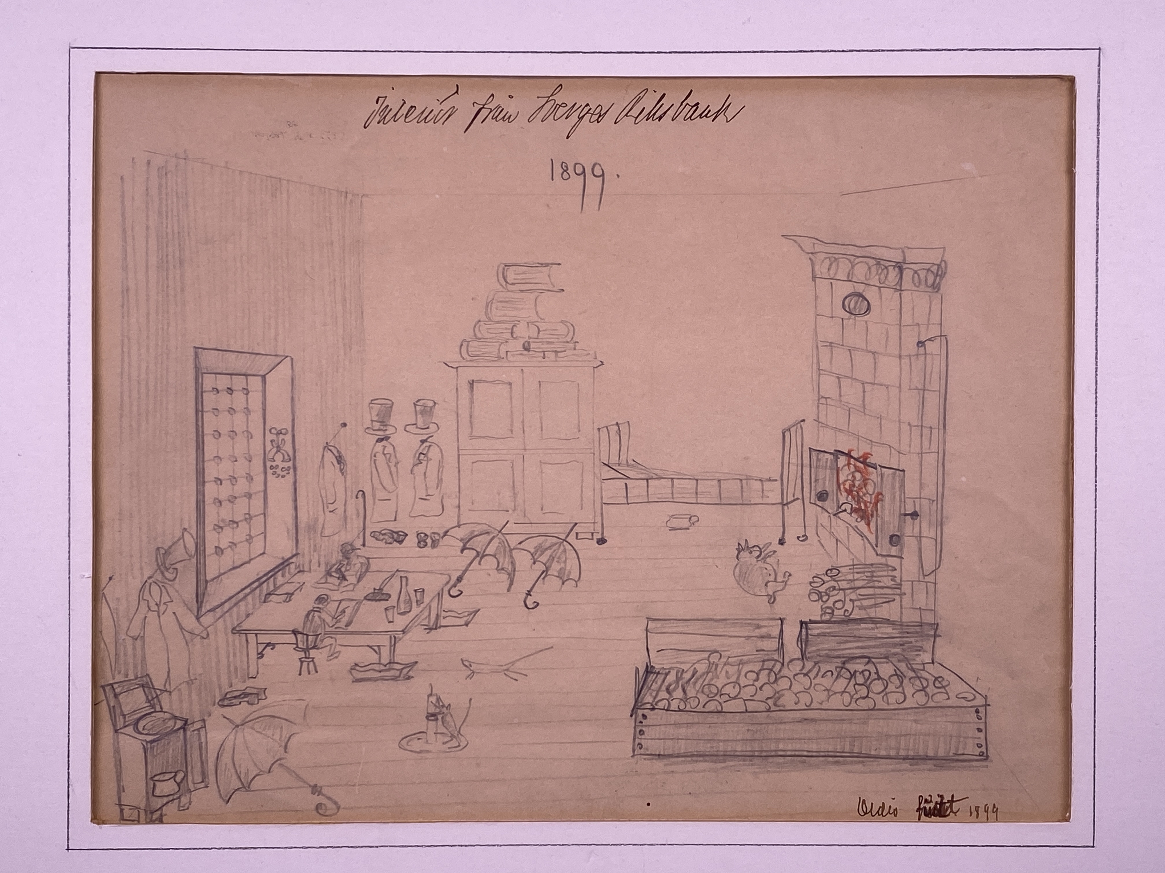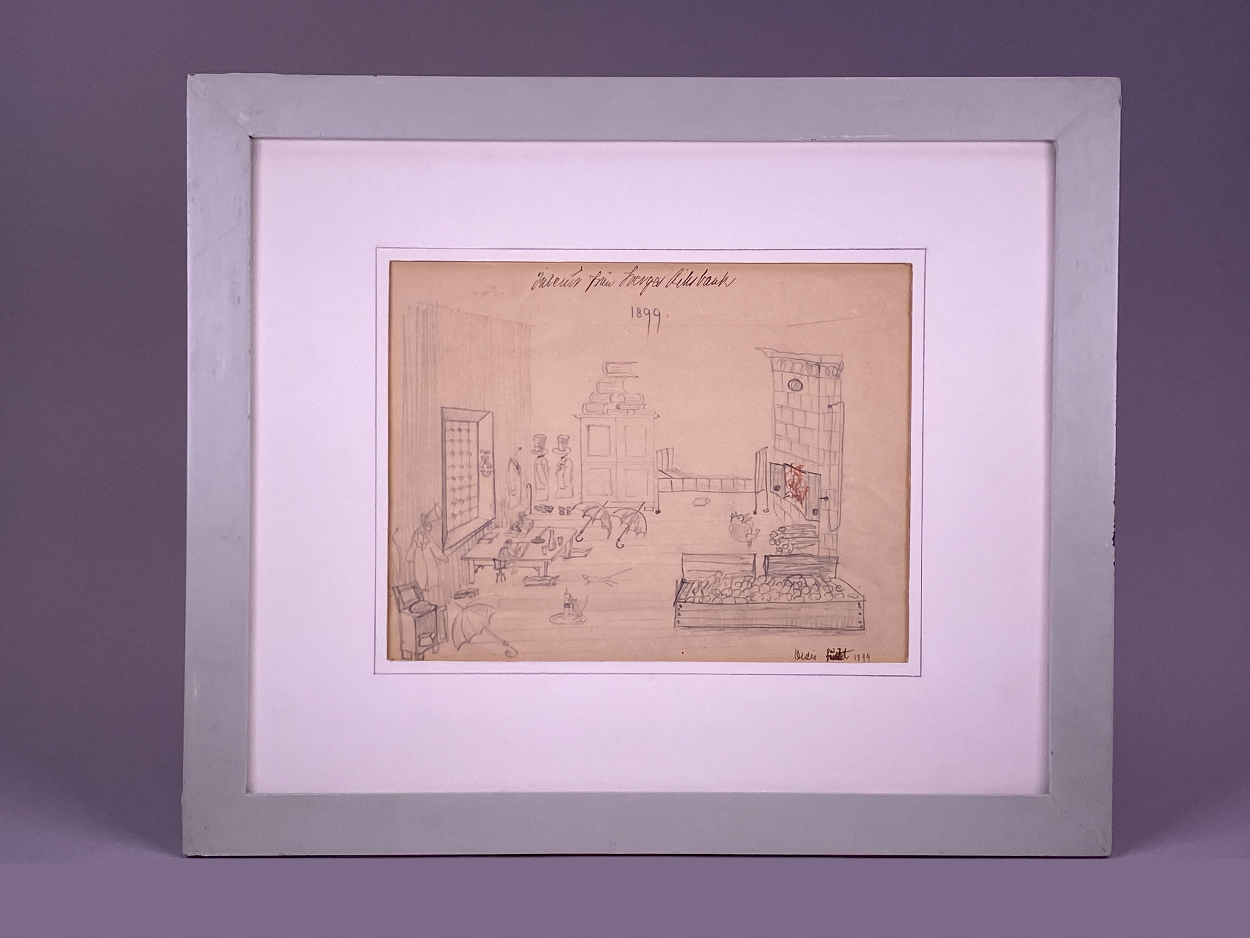 Tavla tecknad år 1899. Påskrift "Interiör från Sverges Riksbank". Otydligt signerad. Blyerts på papper med vit passepartout av papp, placerat innanför enkel träram målad blågrå. Ramens baksida med snöre för upphängning samt med svårtydd påskrift "Tillhör (Fedrik?) Odhner (?). Konstverket donerat till Sveriges Riksbank av Astrid Odhner (?) 18/10 1956".