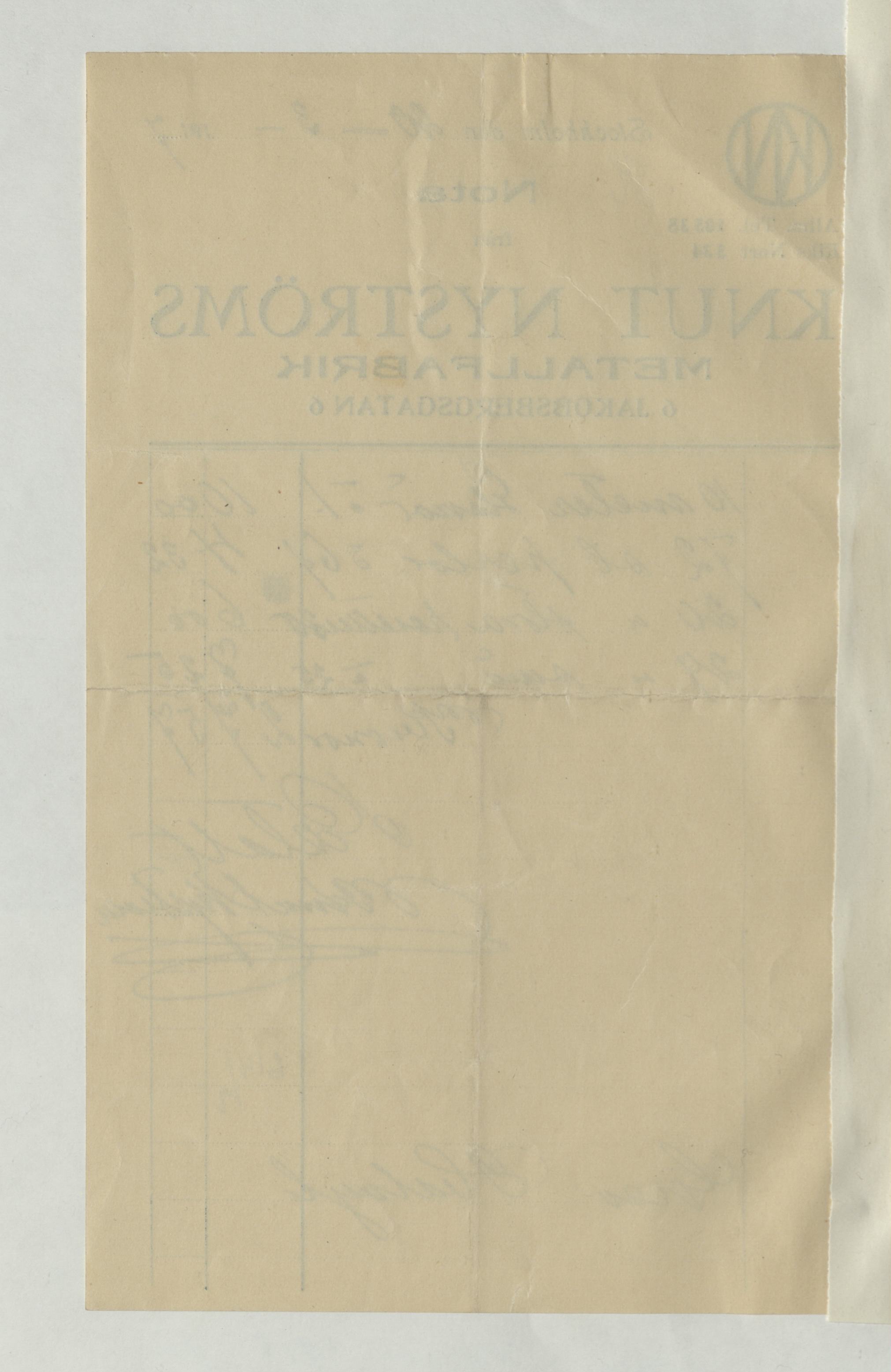 Kvitto från Knut Nyströms, Metallfabrik, 1917