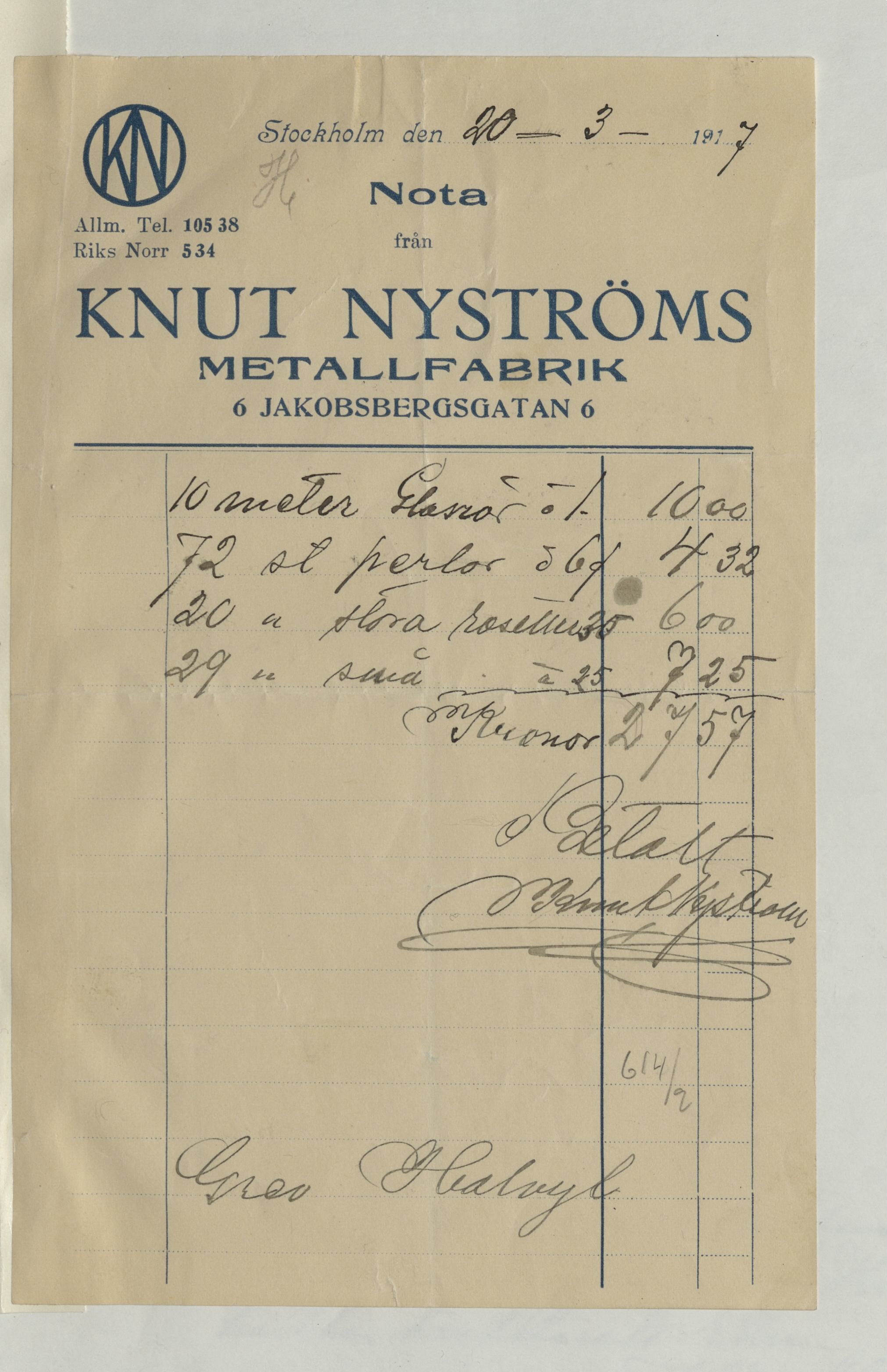 Kvitto från Knut Nyströms, Metallfabrik, för bl a 72st pärlor m.m med totalsumma 27:57Kr. Stockholm 20 mars 1917.
