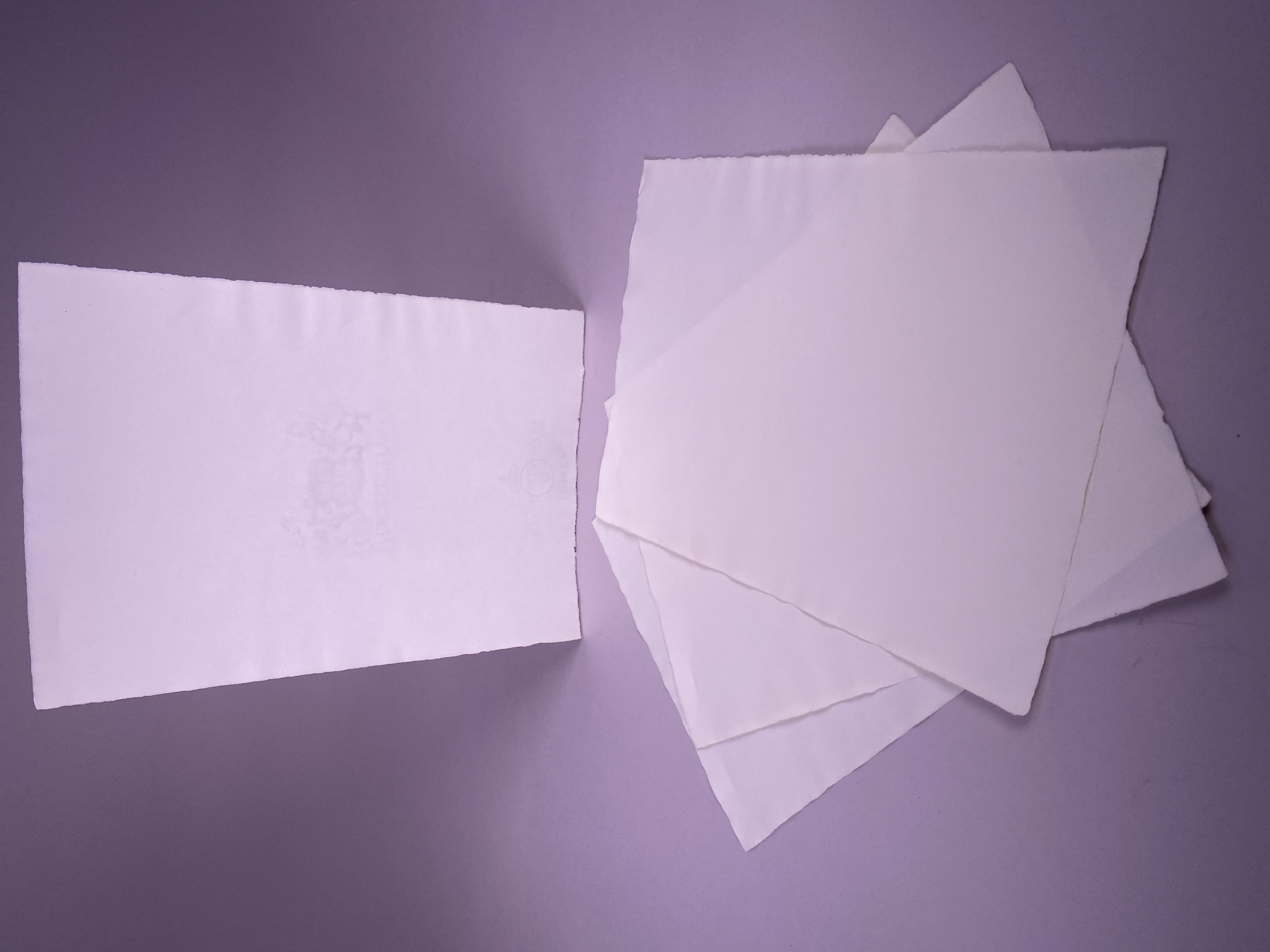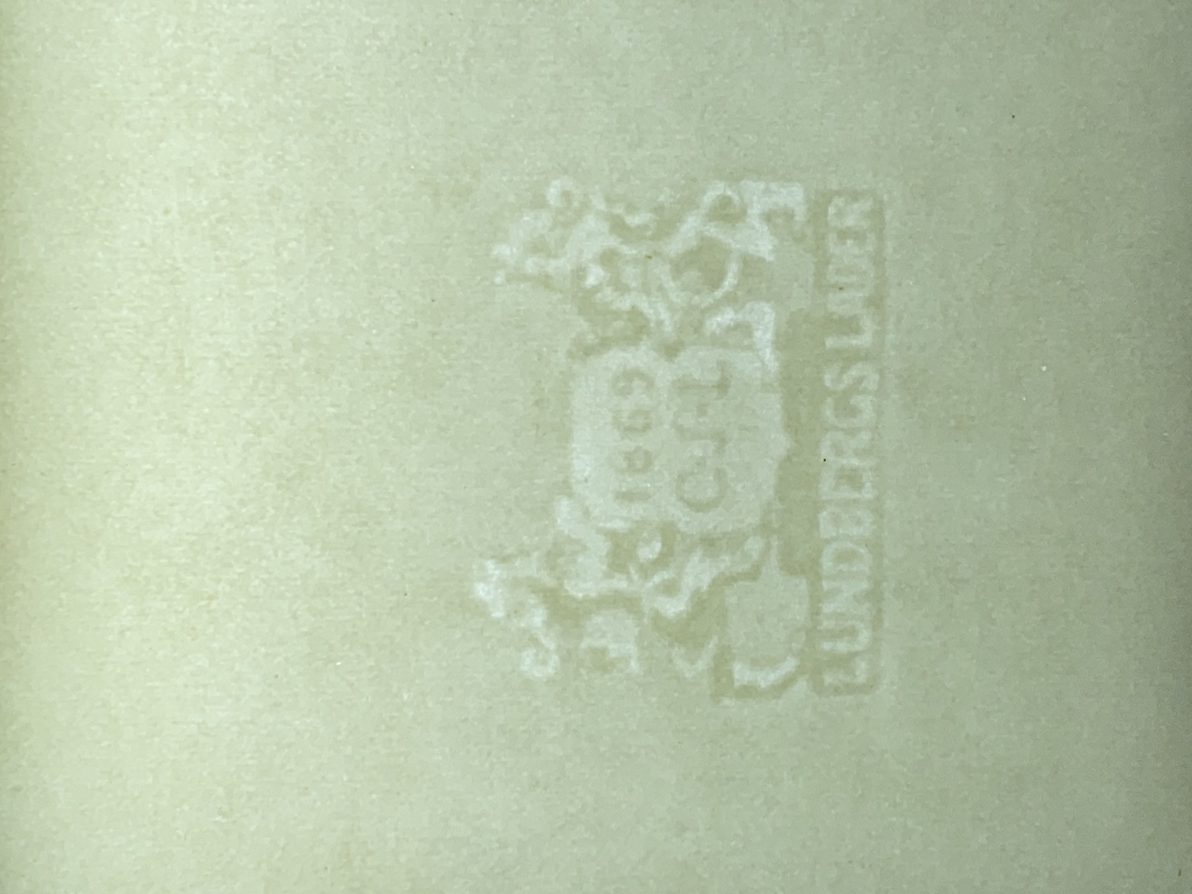 4 handgjorda ark med vattenmärke tillverkade vid Tumba bruk. Vattenmärke: företagslogotyp "Lundbergs läder" (Lundbergs läderfabrik i Valdemarsvik).