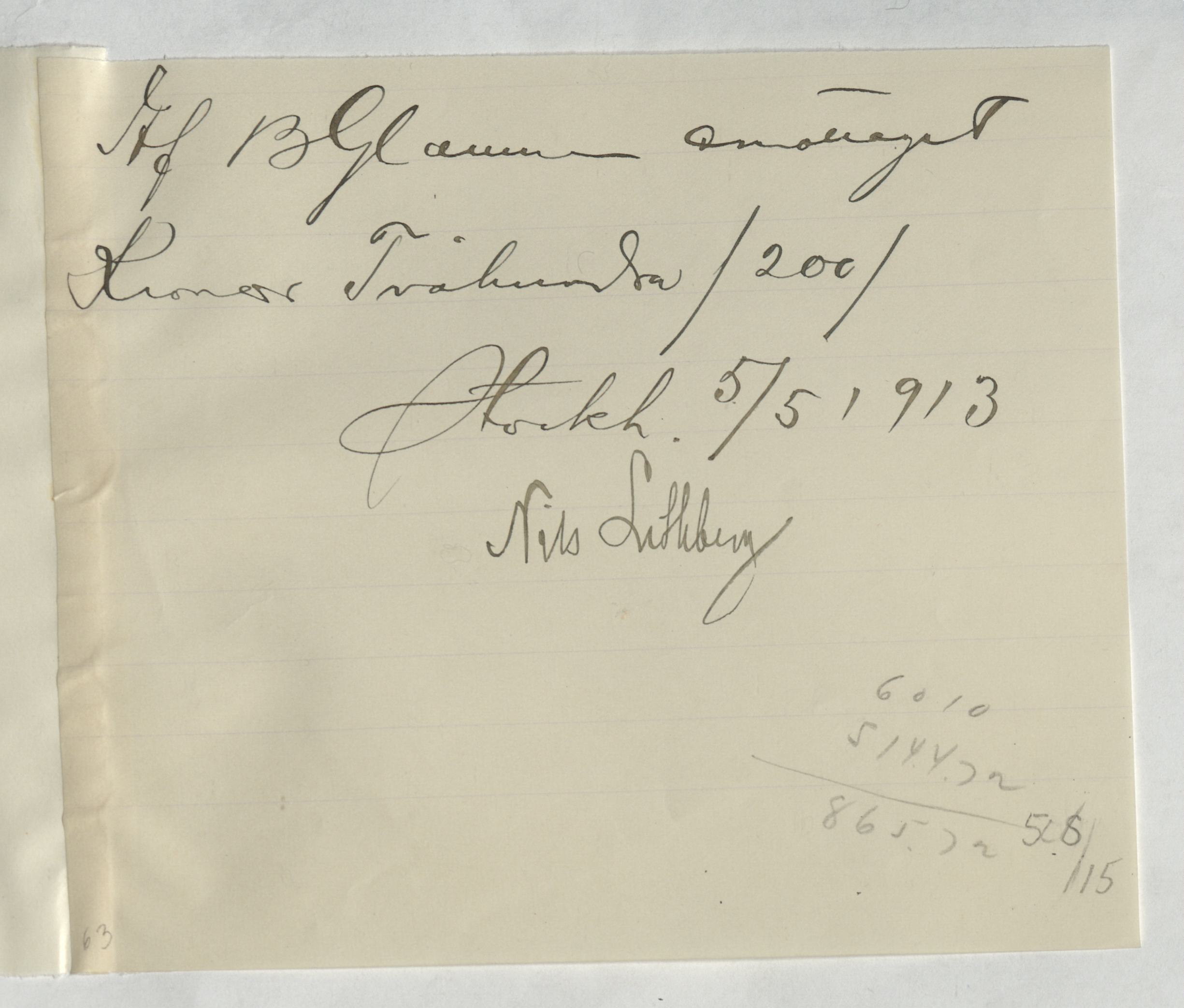 Kvitto gällande pengatransaktion mellan Bernhard Glaumann och Nils Lithberg. Stockholm, 1913.