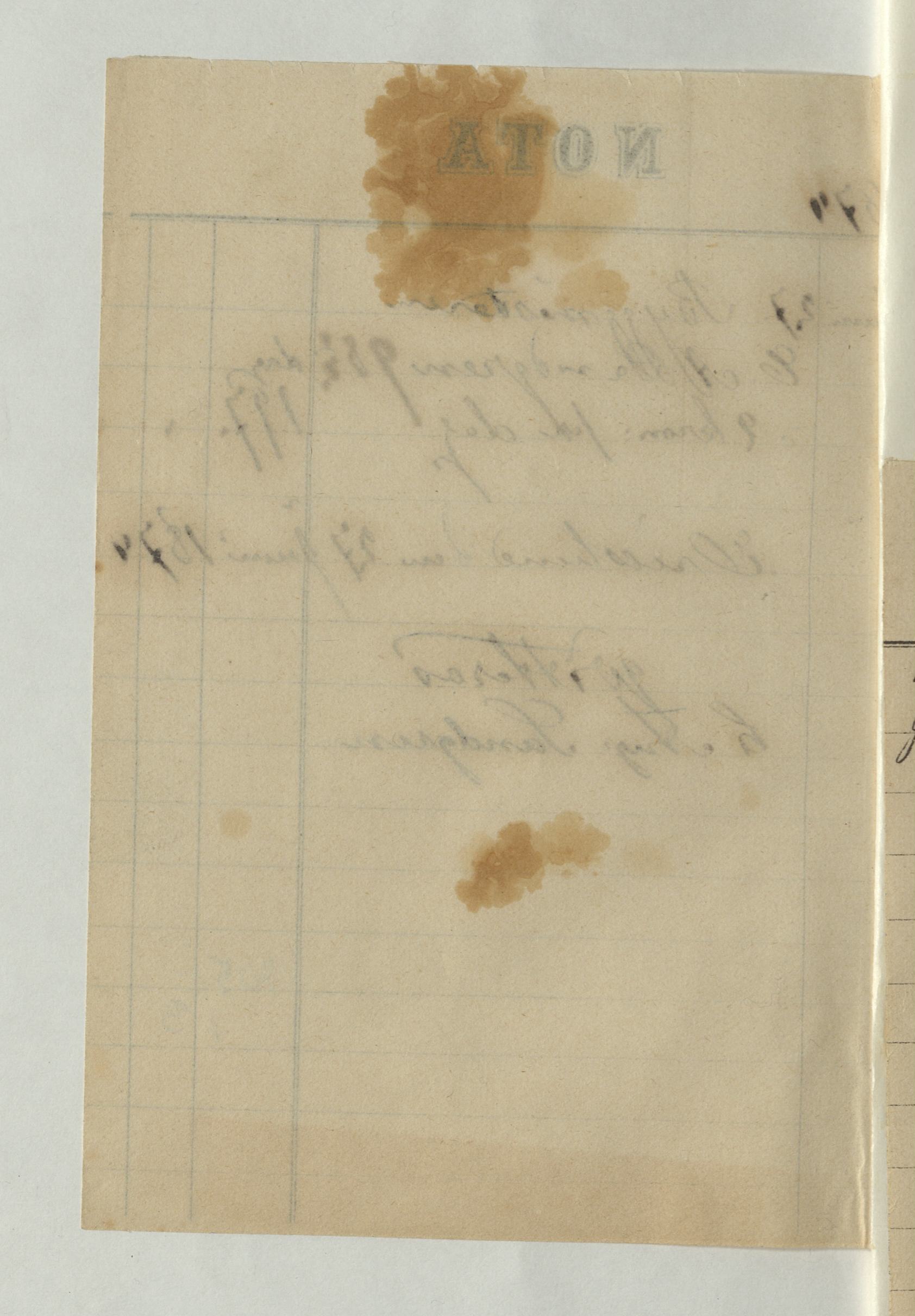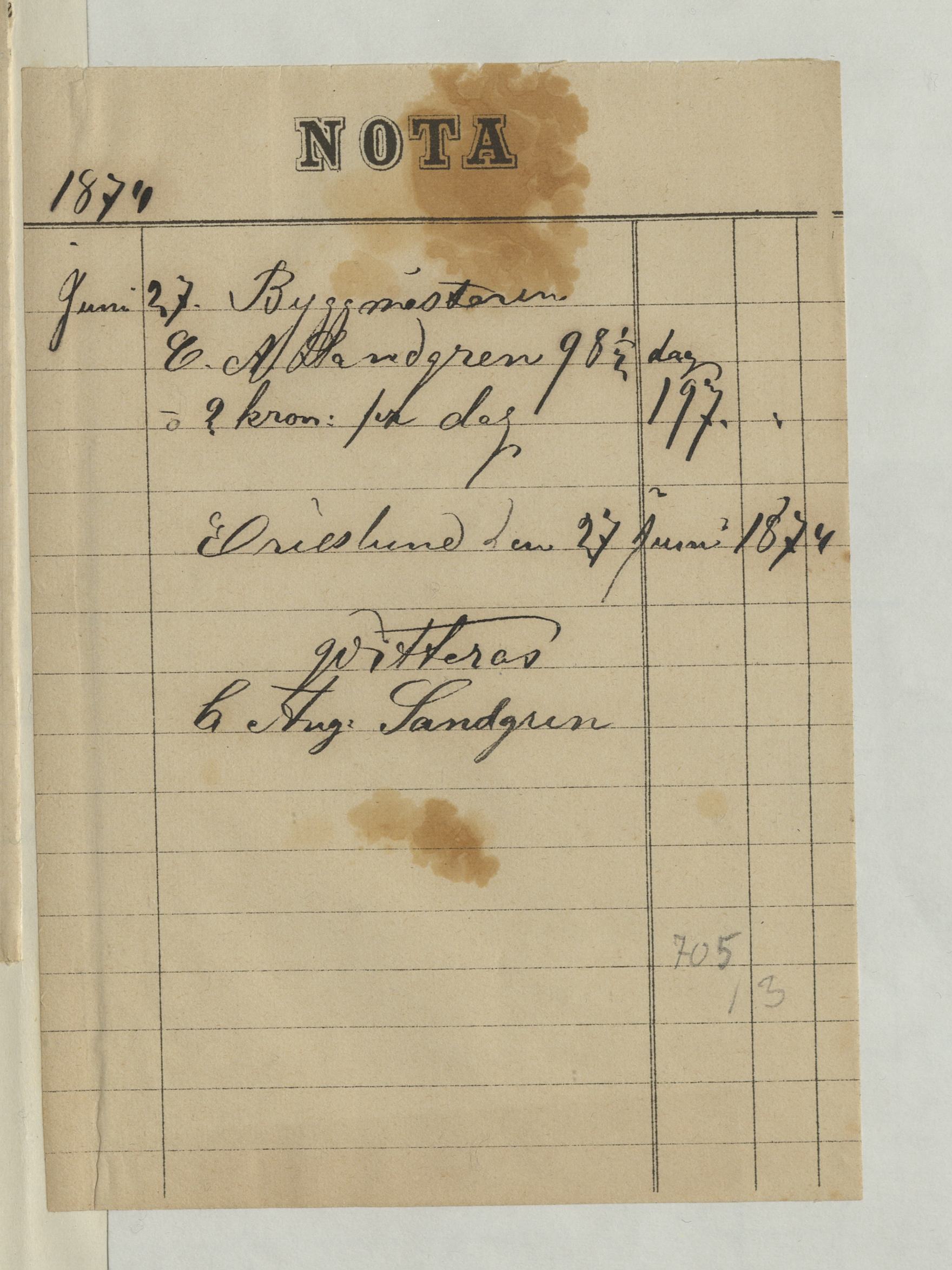 Kvitto från C. August Sandgren, byggmästare, 1874