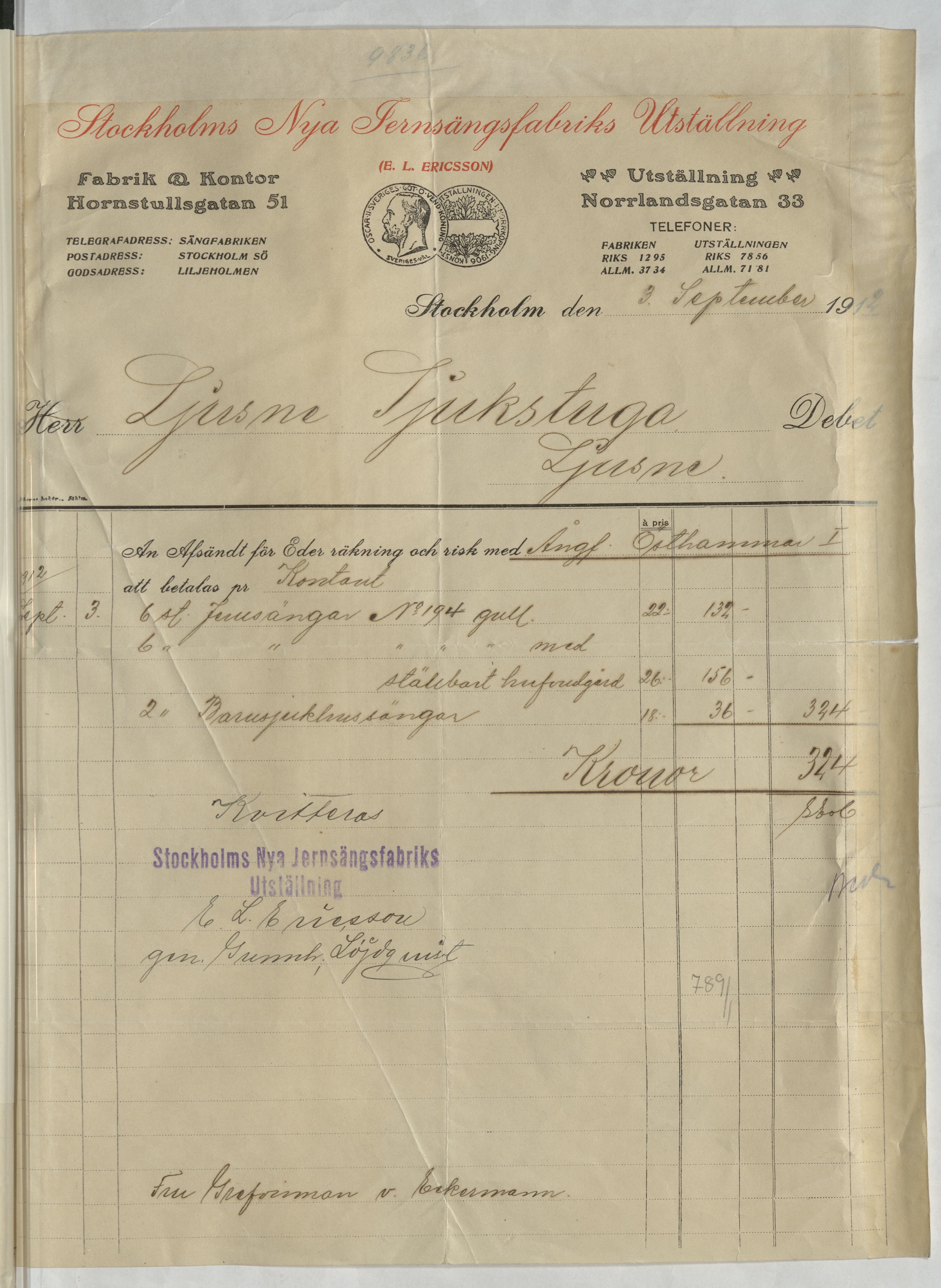 Kvitto från Stockholms Nya Järnsängsfabrik. Gällande järnsängar och barnsjukhussängarn till Ljusne Sjukstuga.