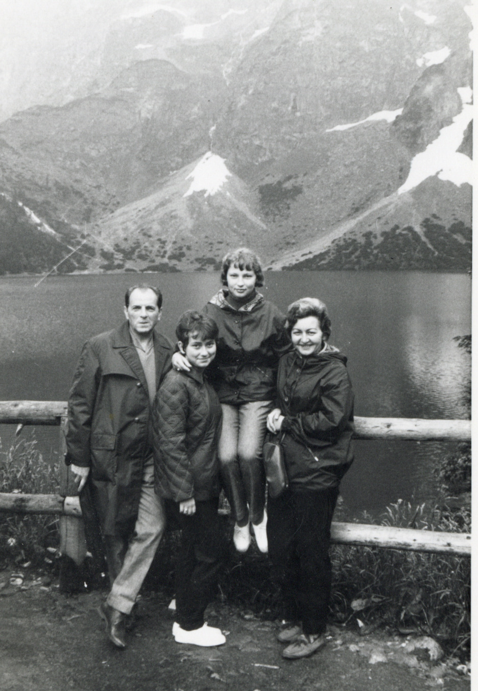 Svartvit bild av Luisa och tre personer till vid en sjö i bergen