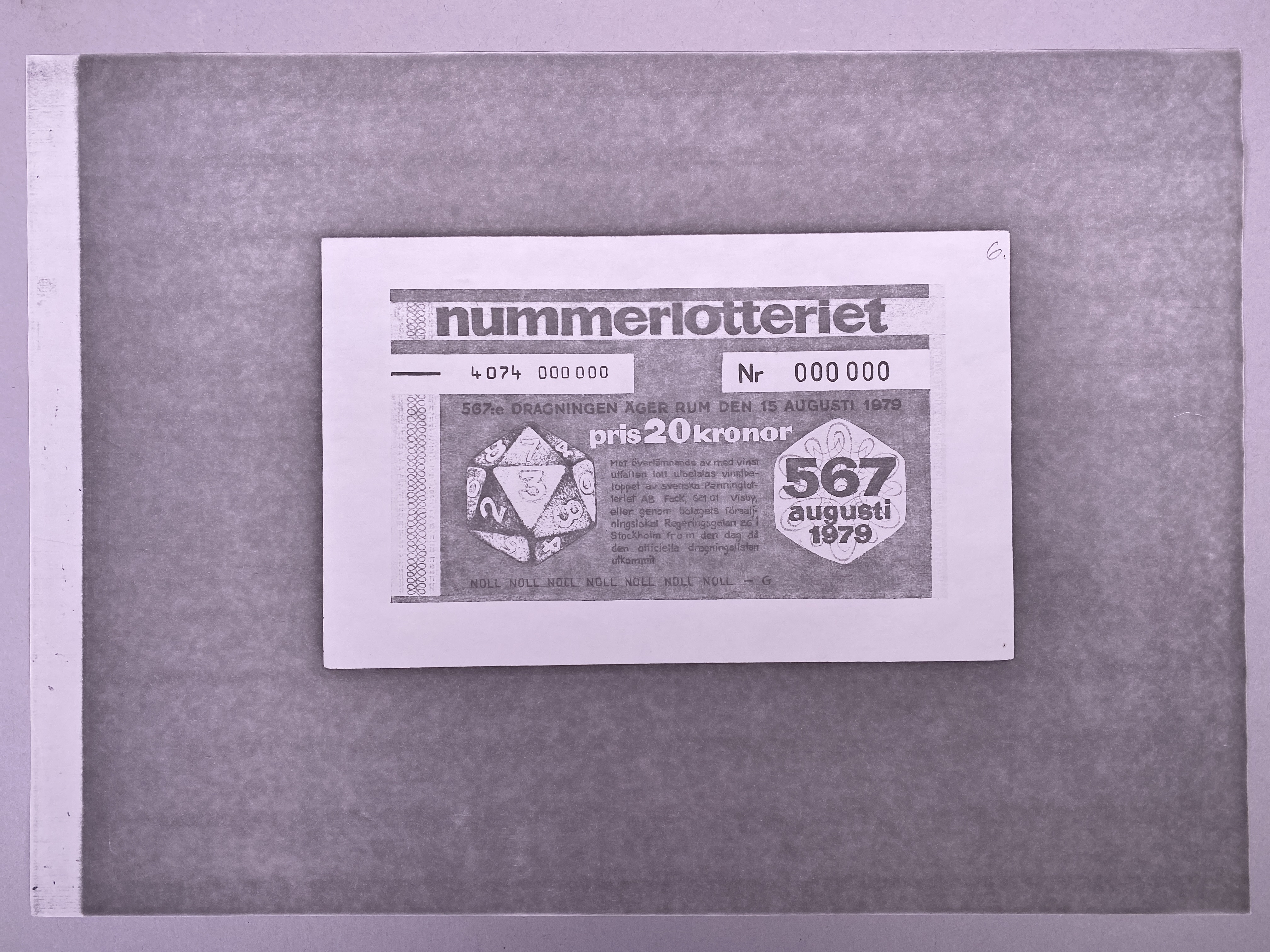 Exemplaret tillhör en grupp om 20 lotter (skiss, lotter med ram, provtryck, förslag etc.) som låg i ett kuvert med texten "Nummerlotteriet 1970-1979". |