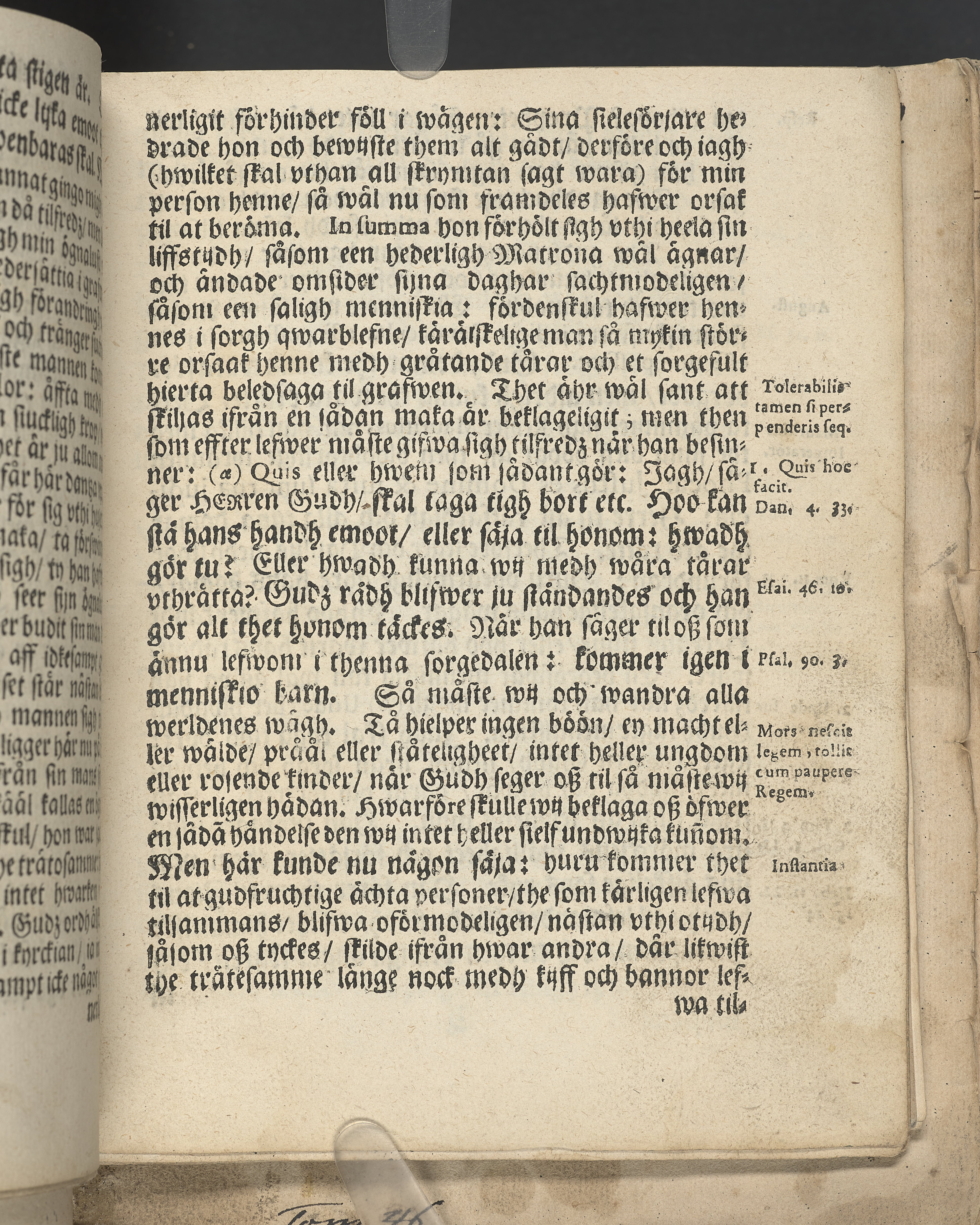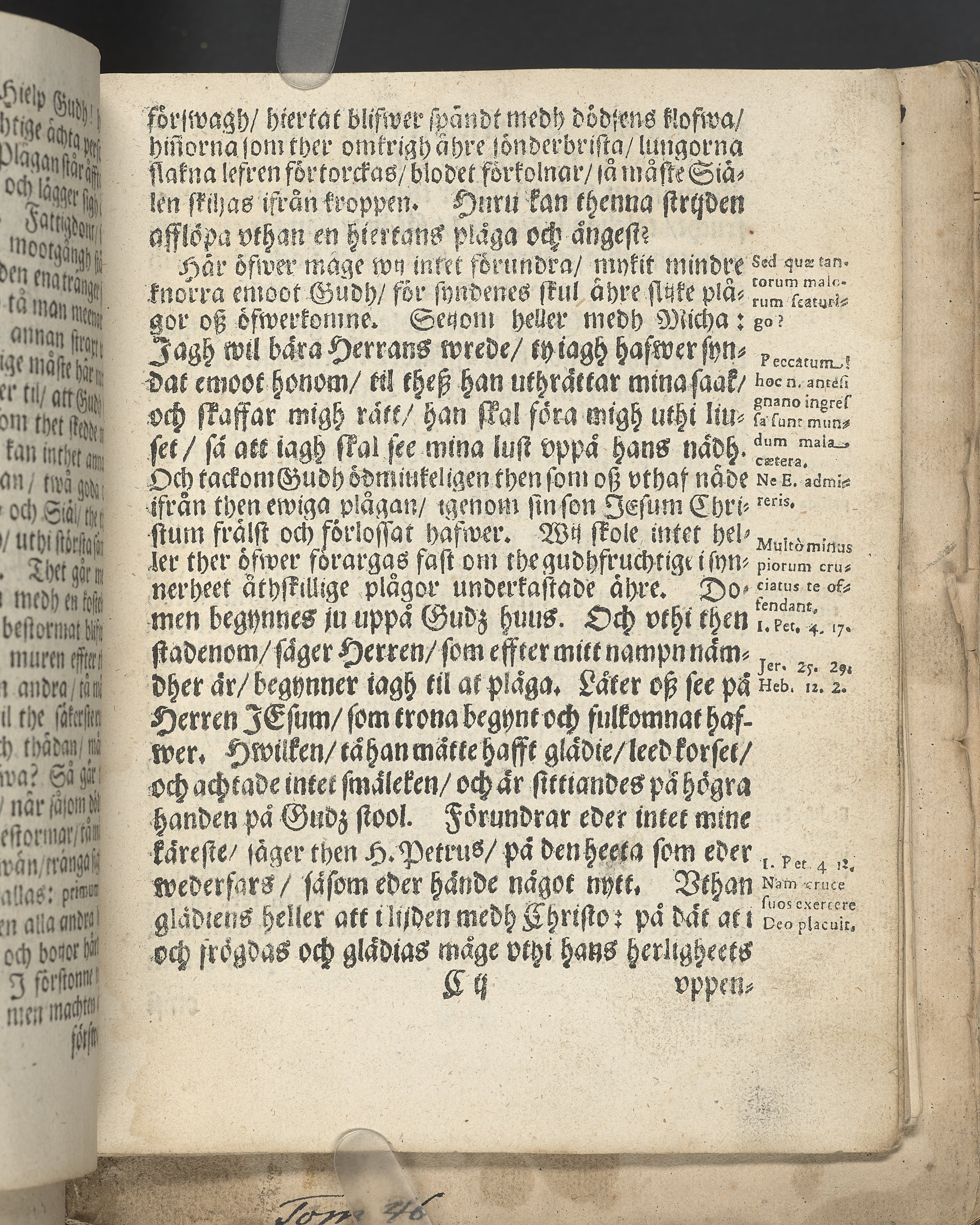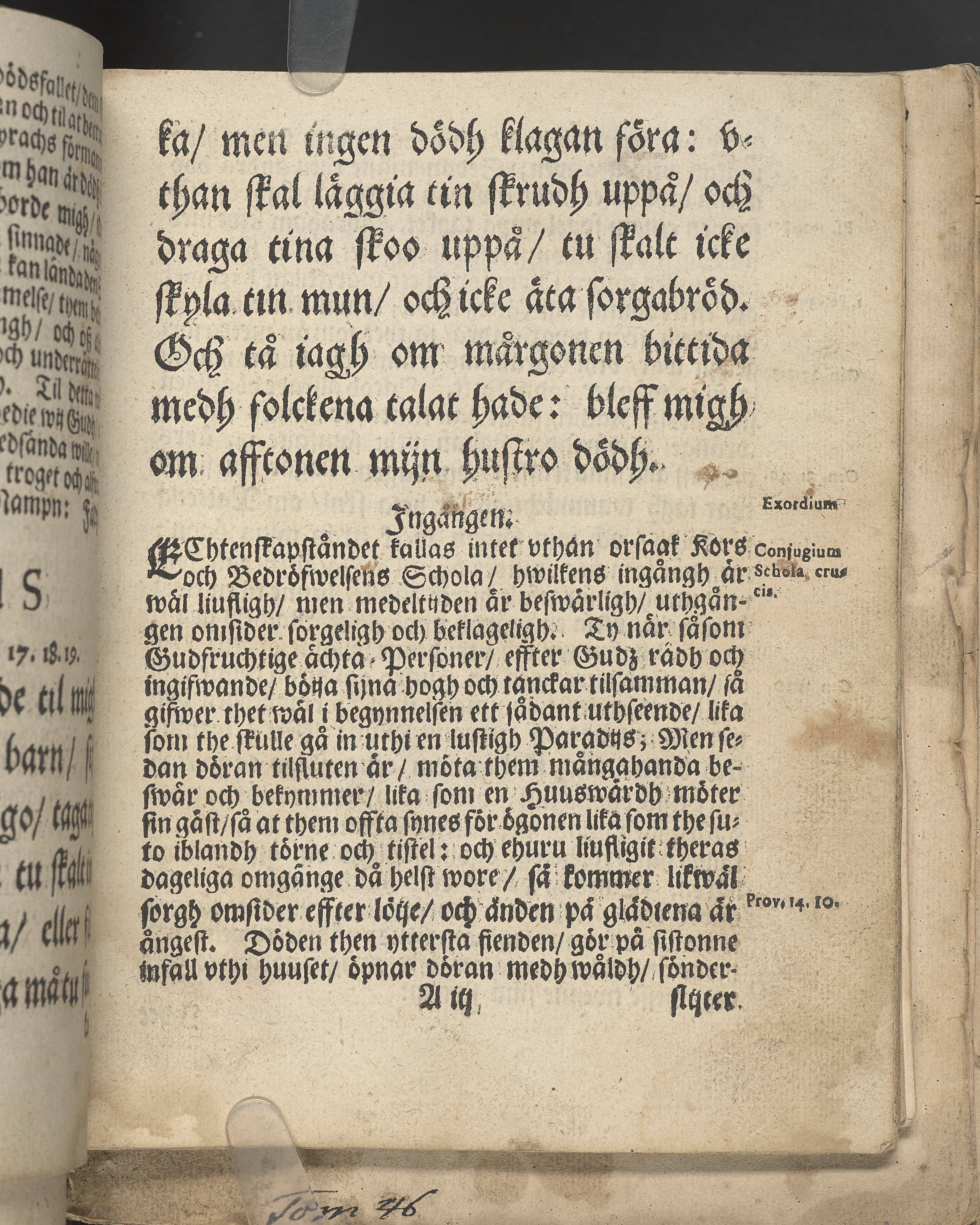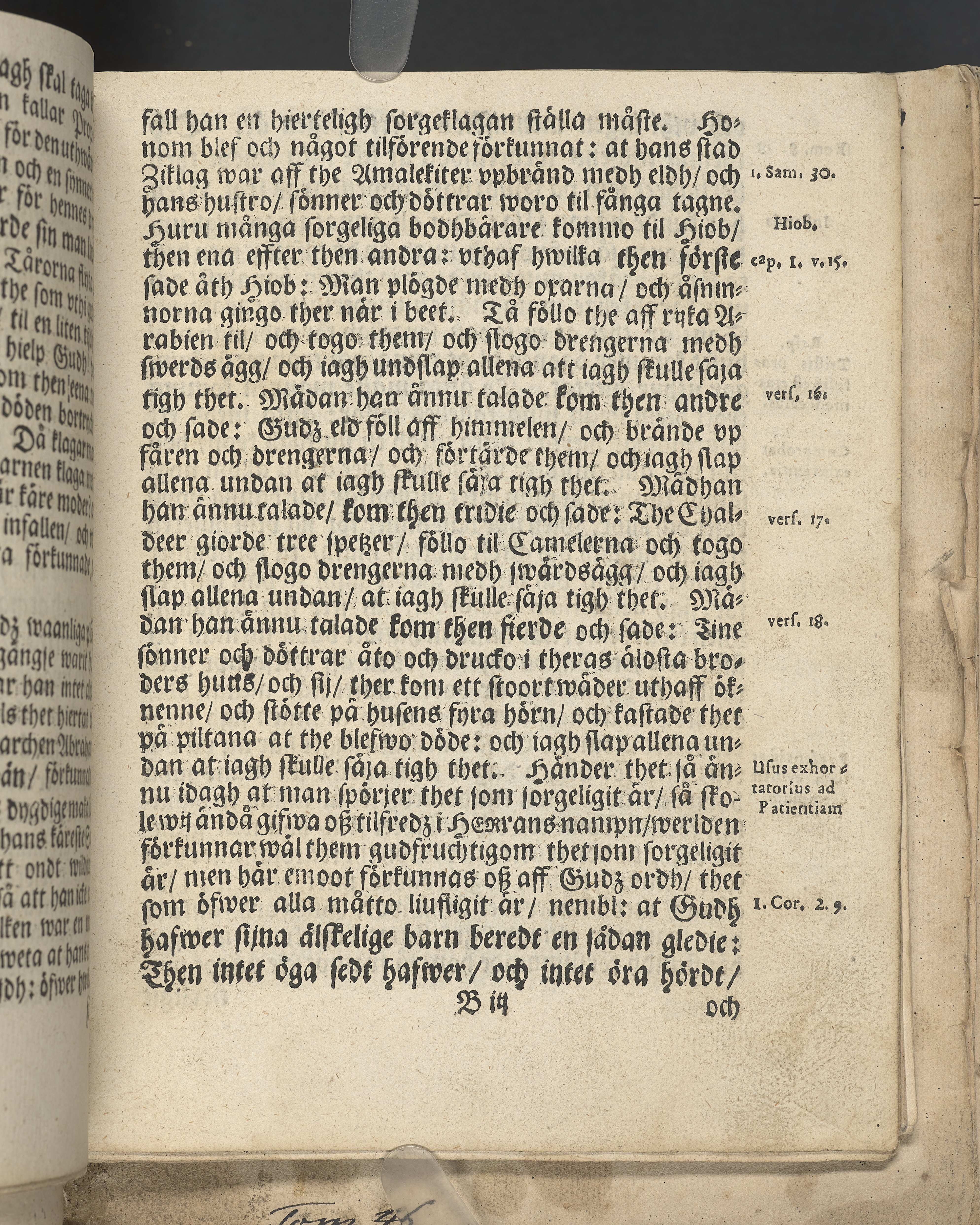 Anteckningar med brunt bläck i nederkant på titelsidan. Snitt stänkta i rött och blått.