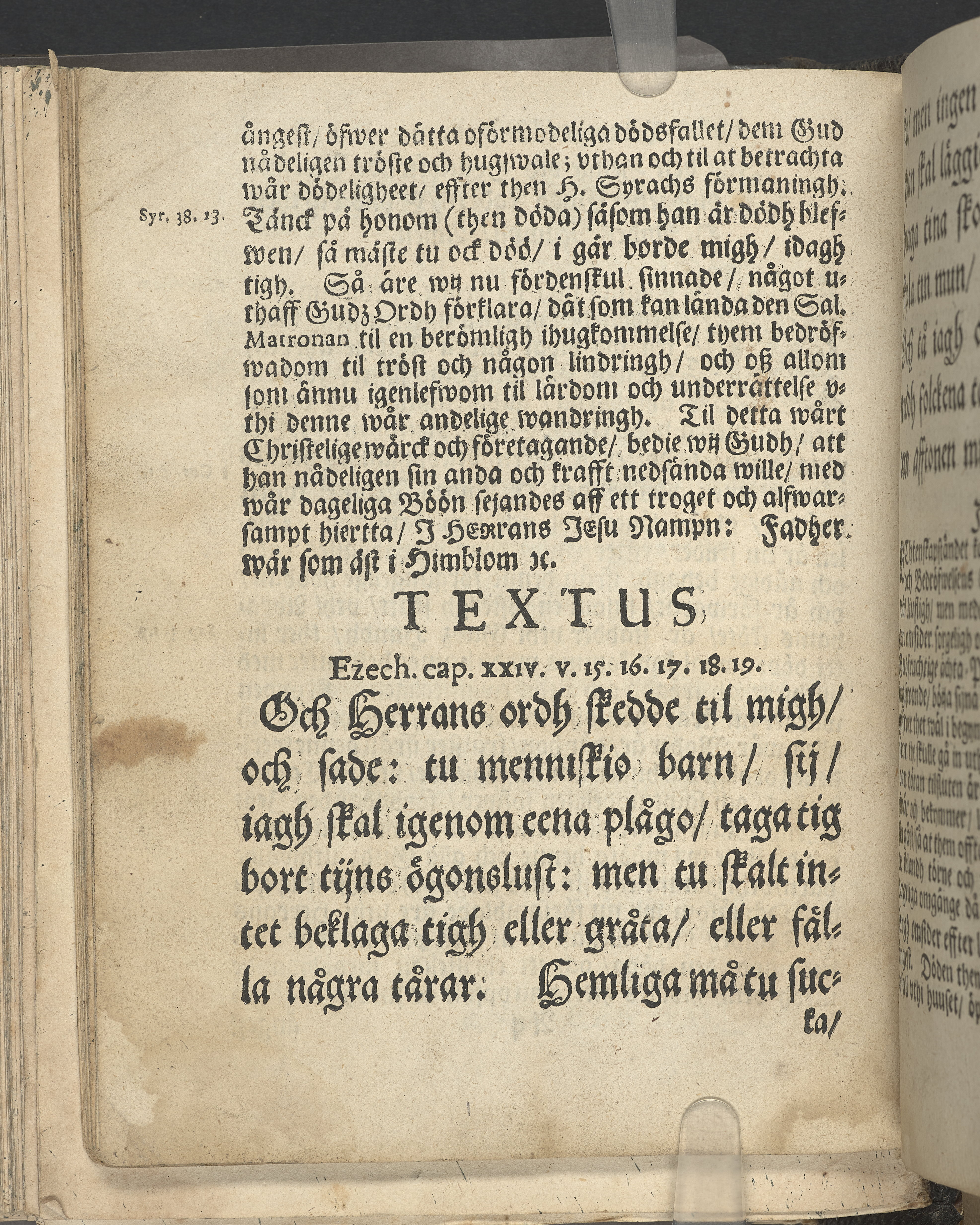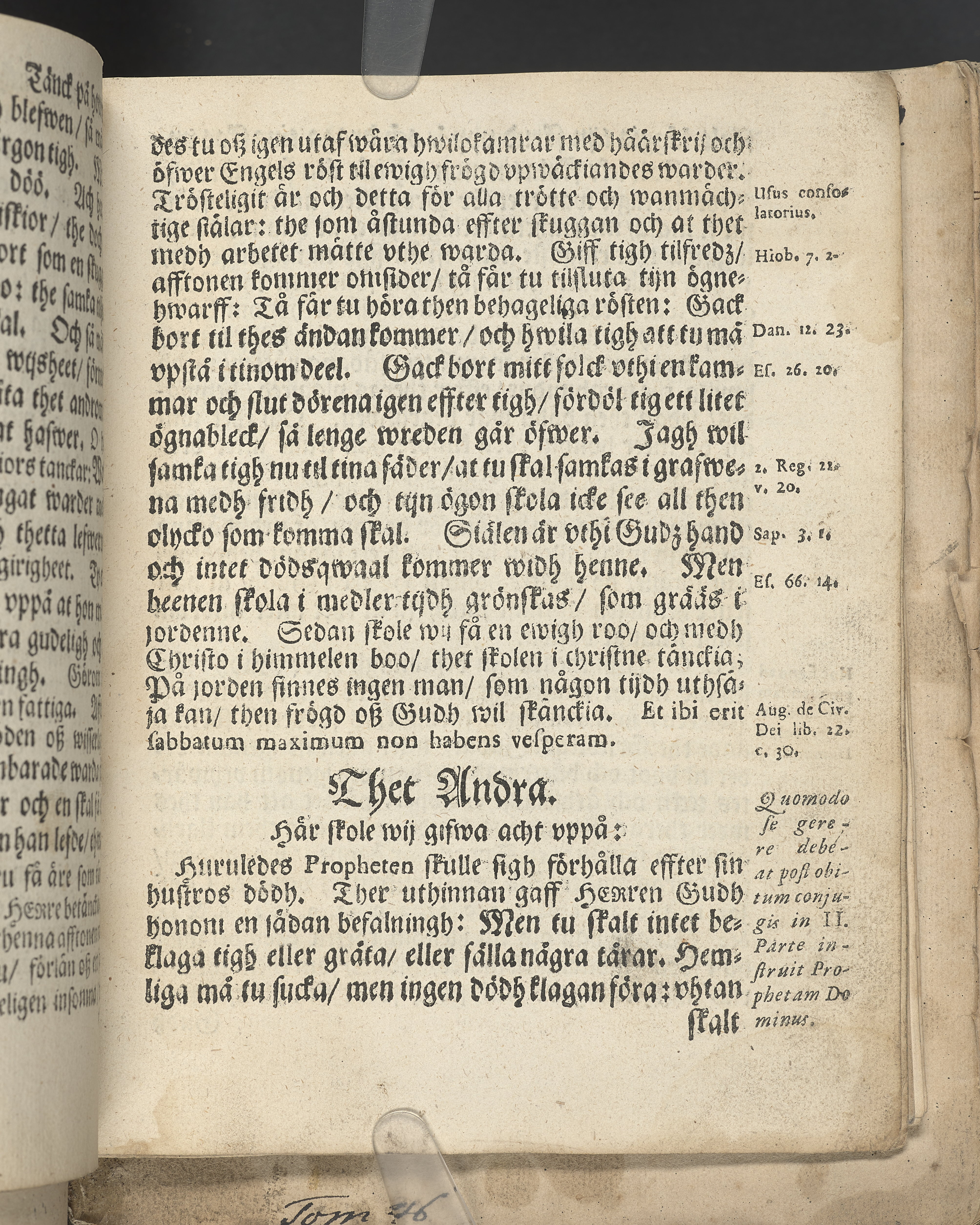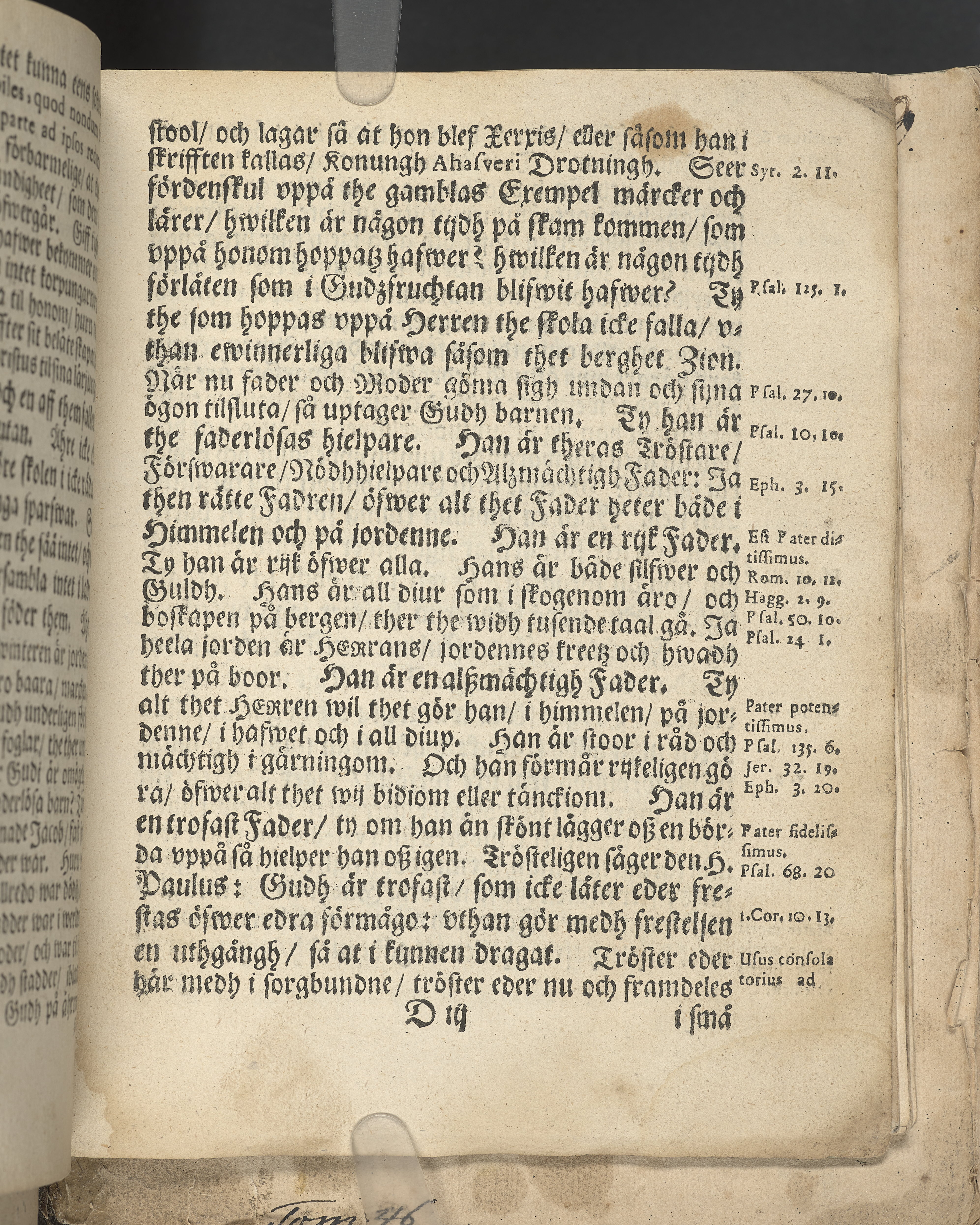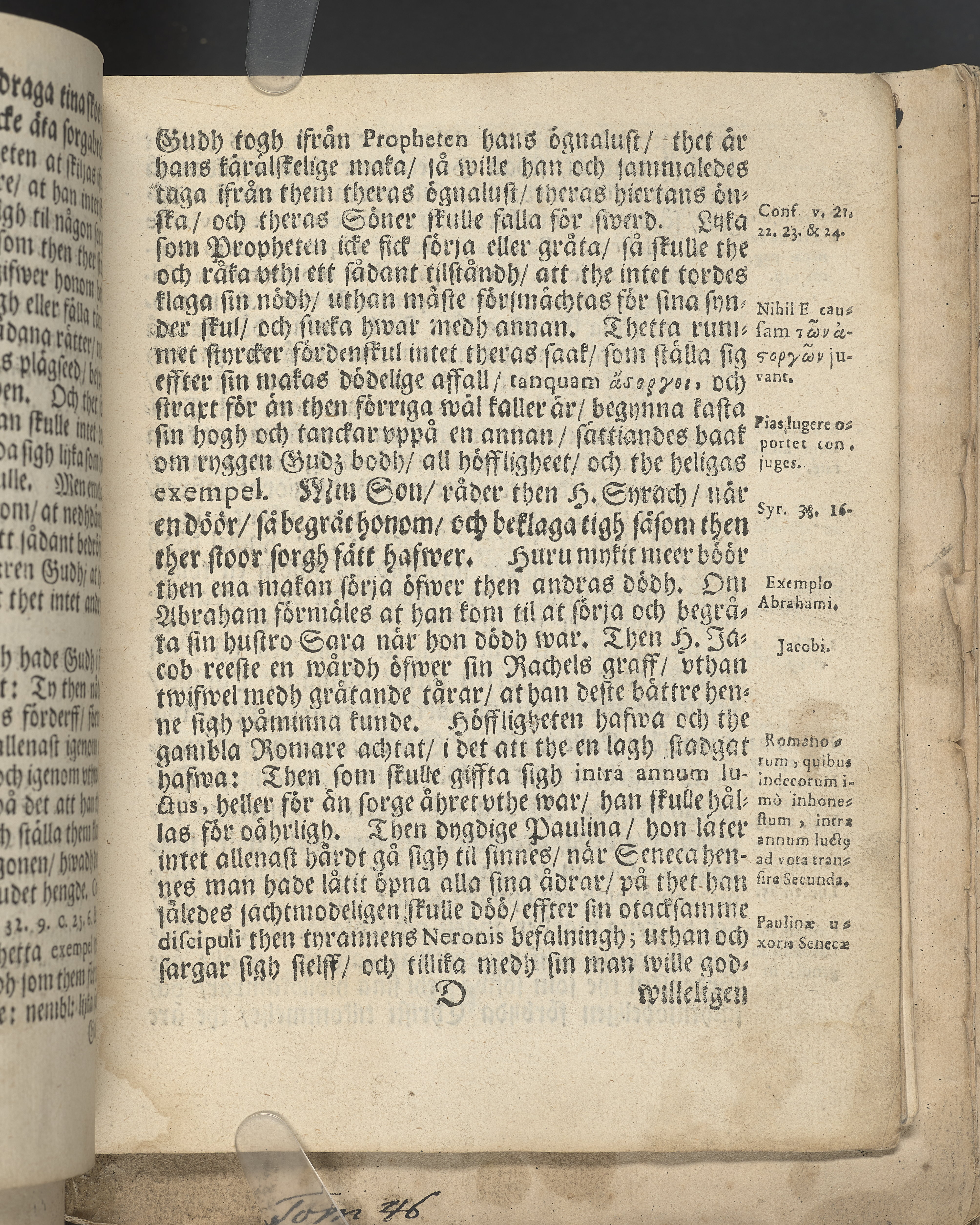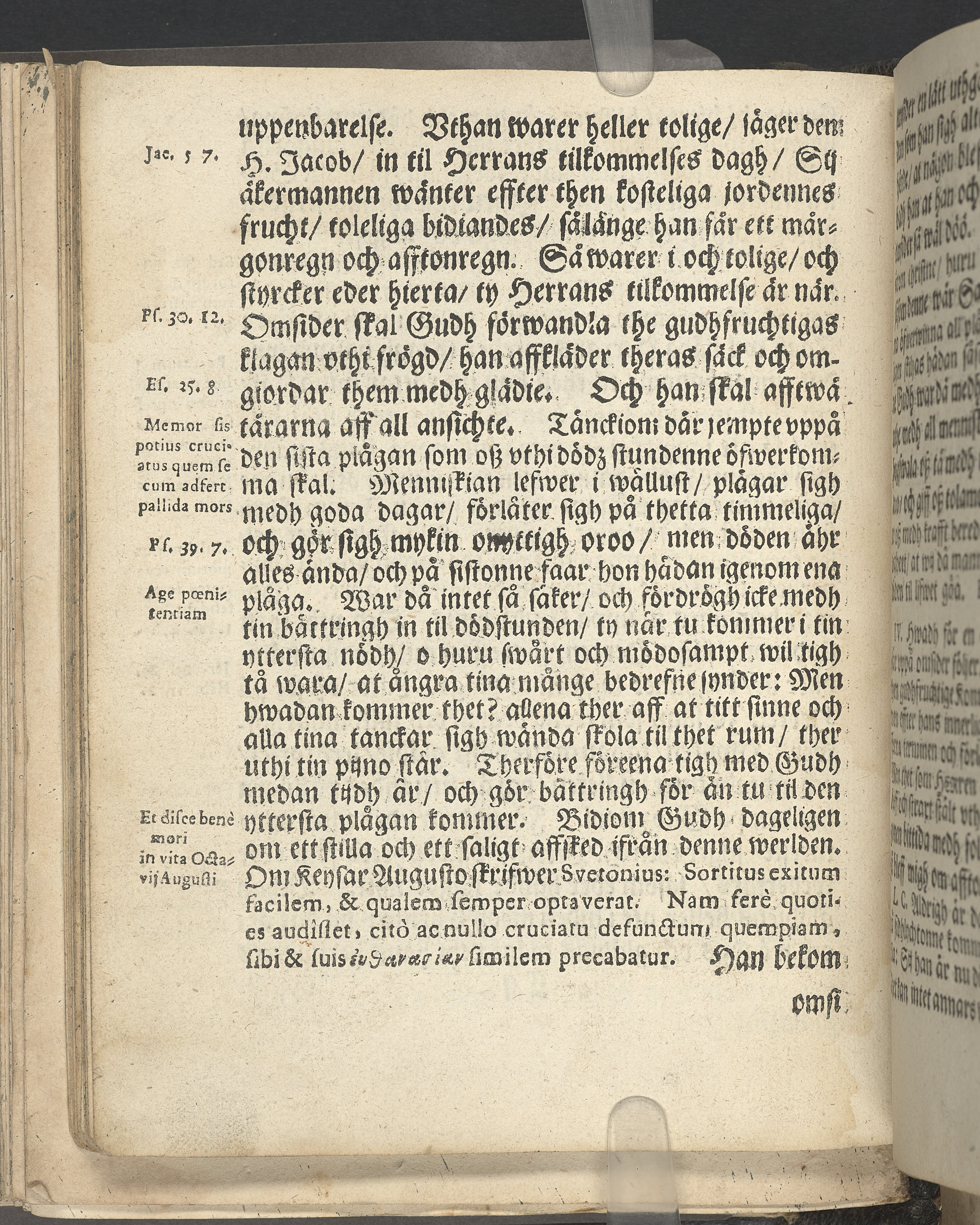 Anteckningar med brunt bläck i nederkant på titelsidan. Snitt stänkta i rött och blått.