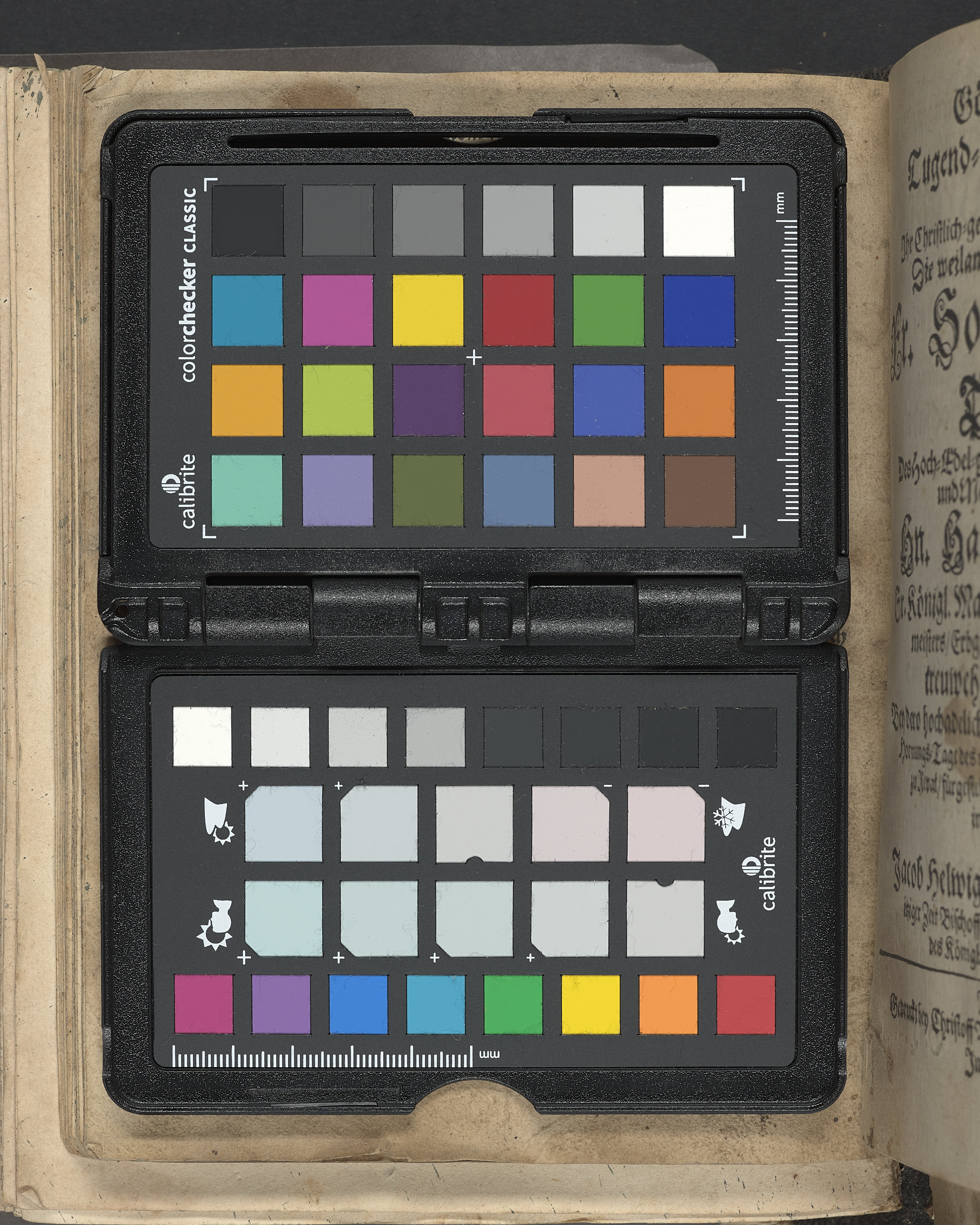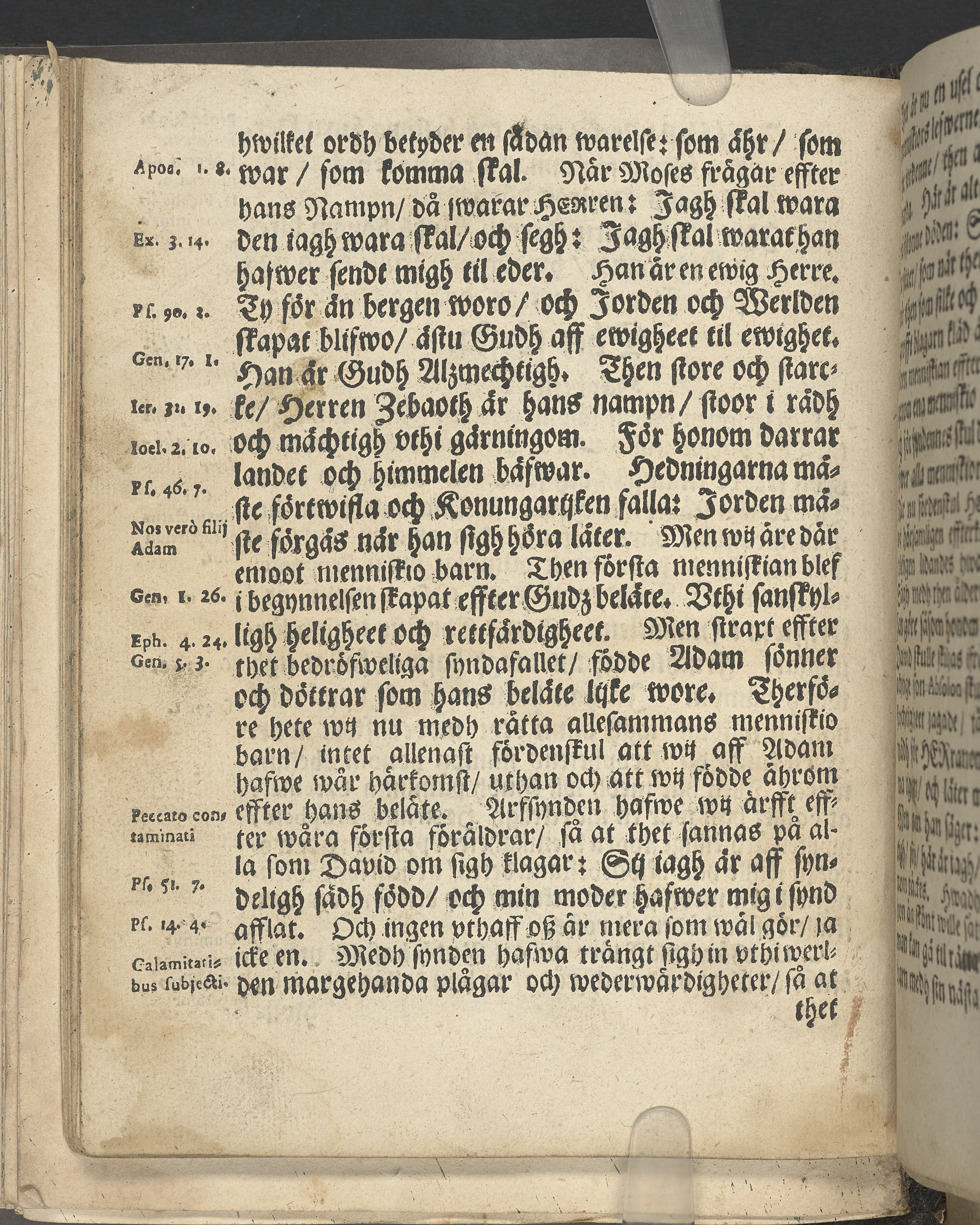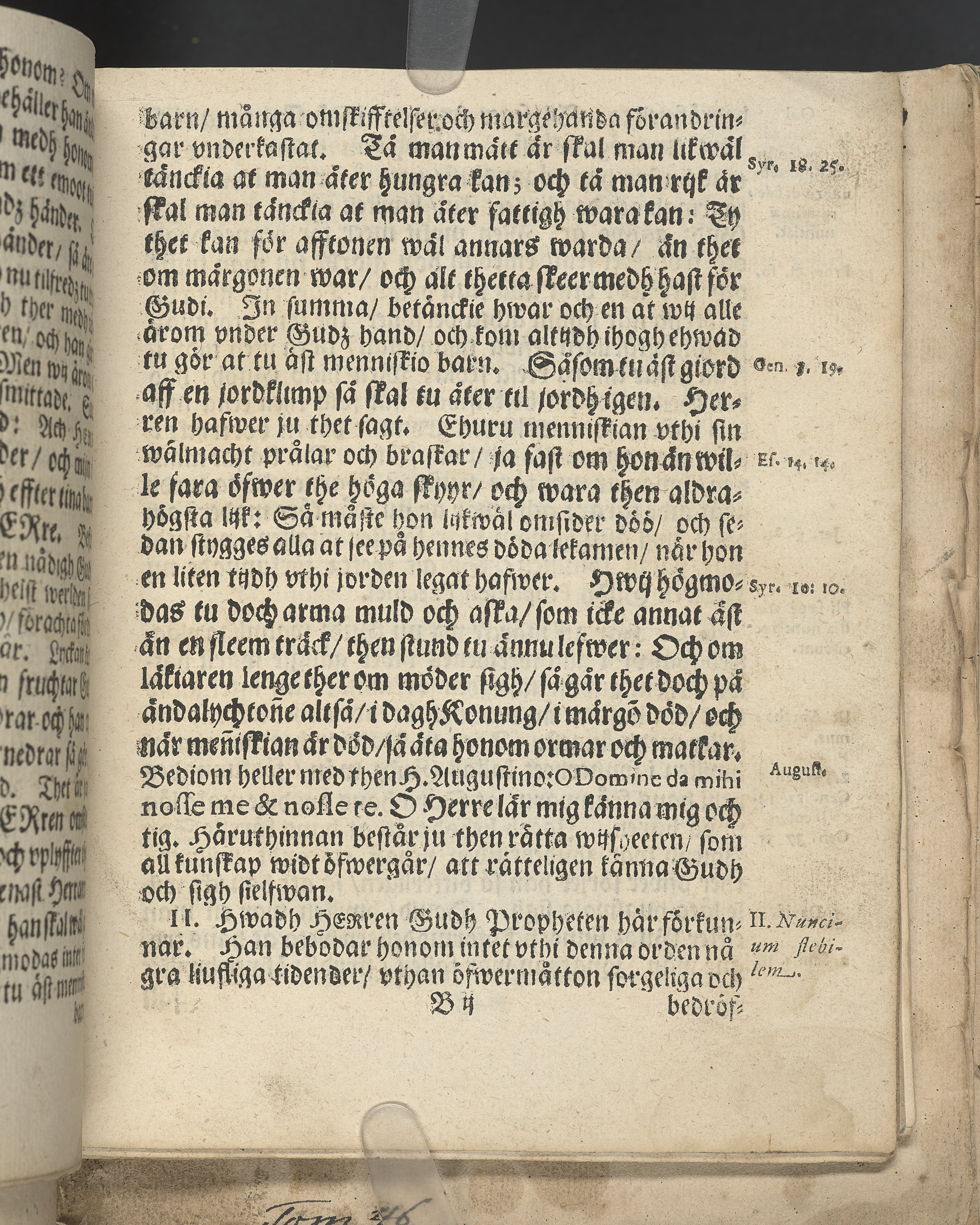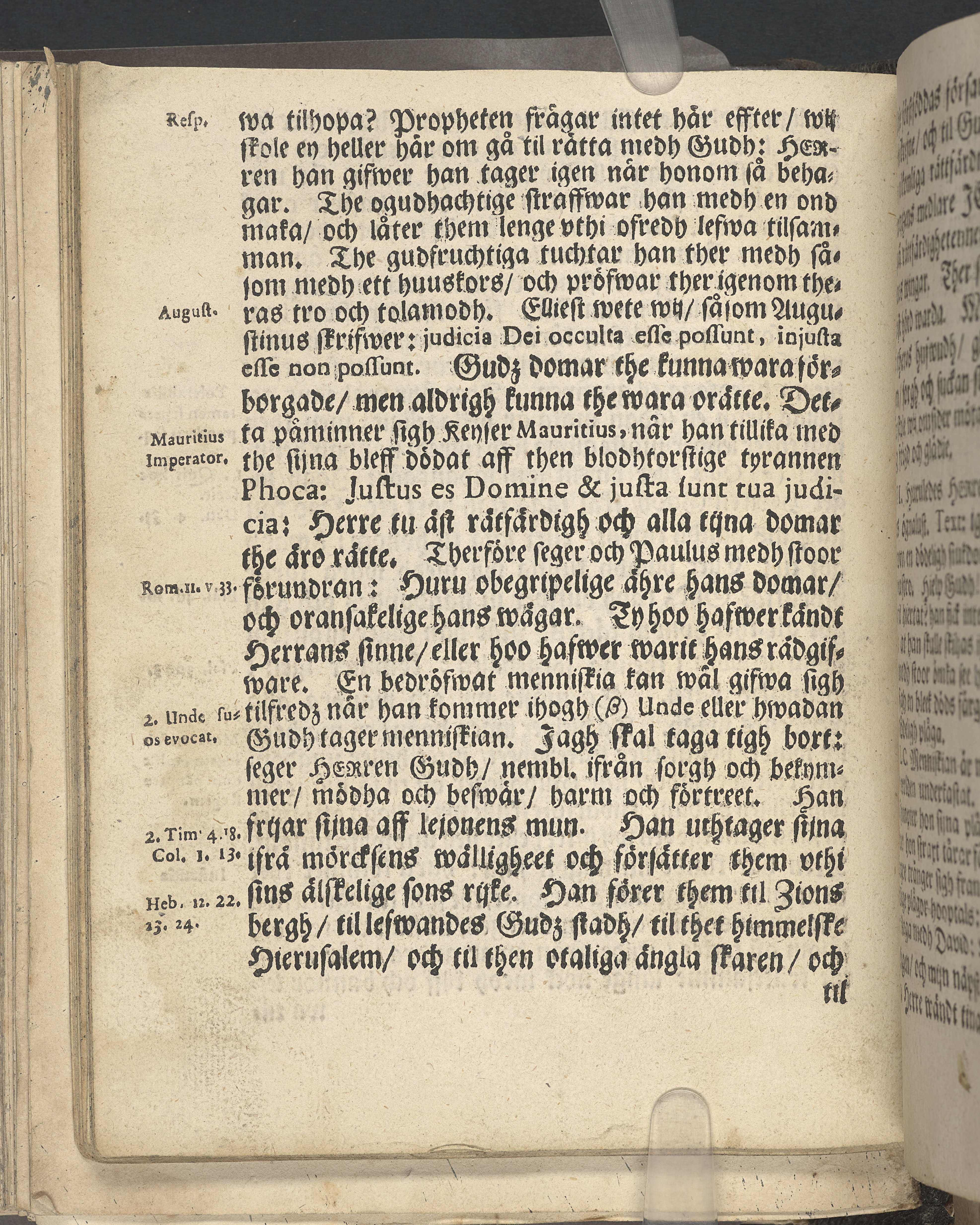 Anteckningar med brunt bläck i nederkant på titelsidan. Snitt stänkta i rött och blått.