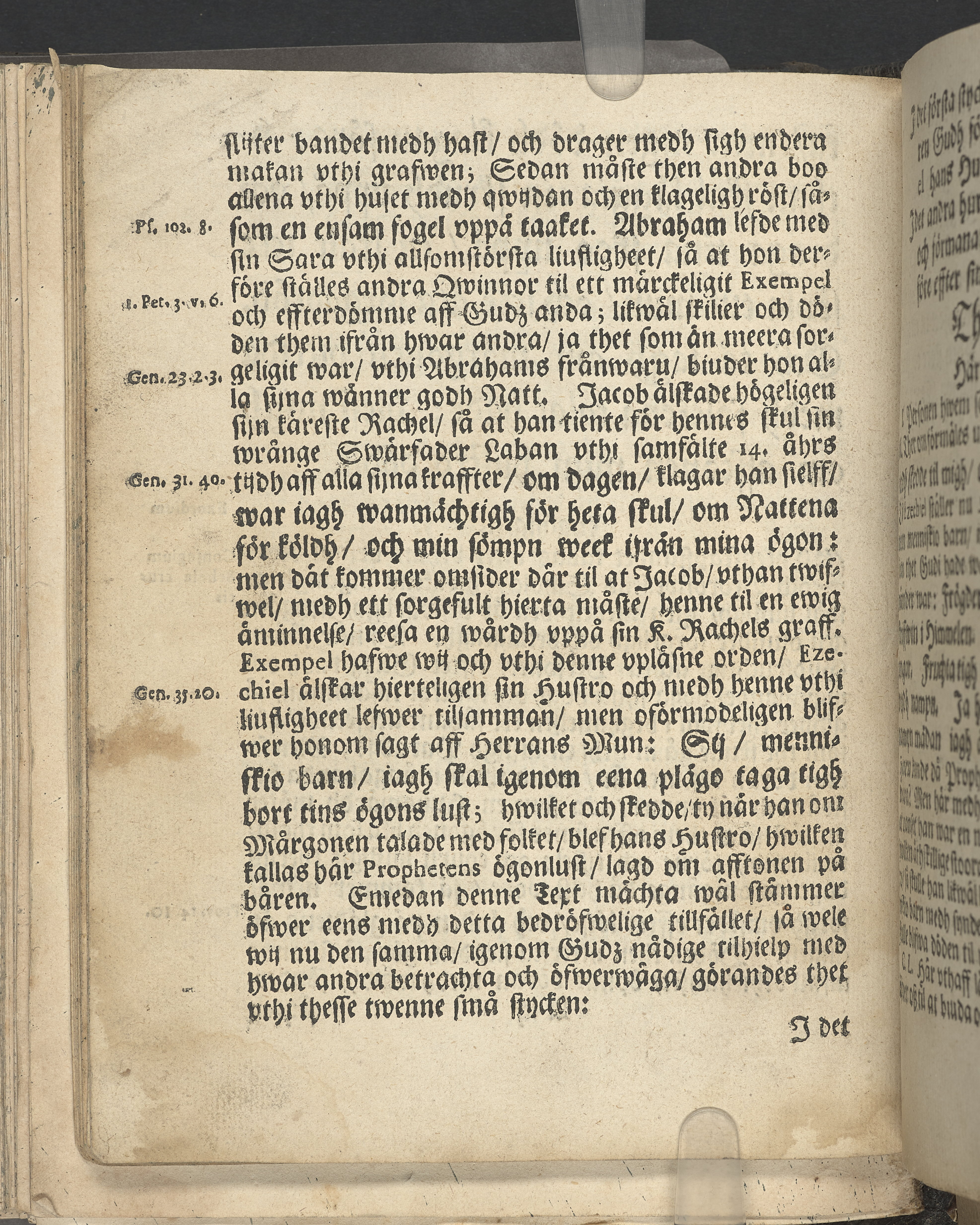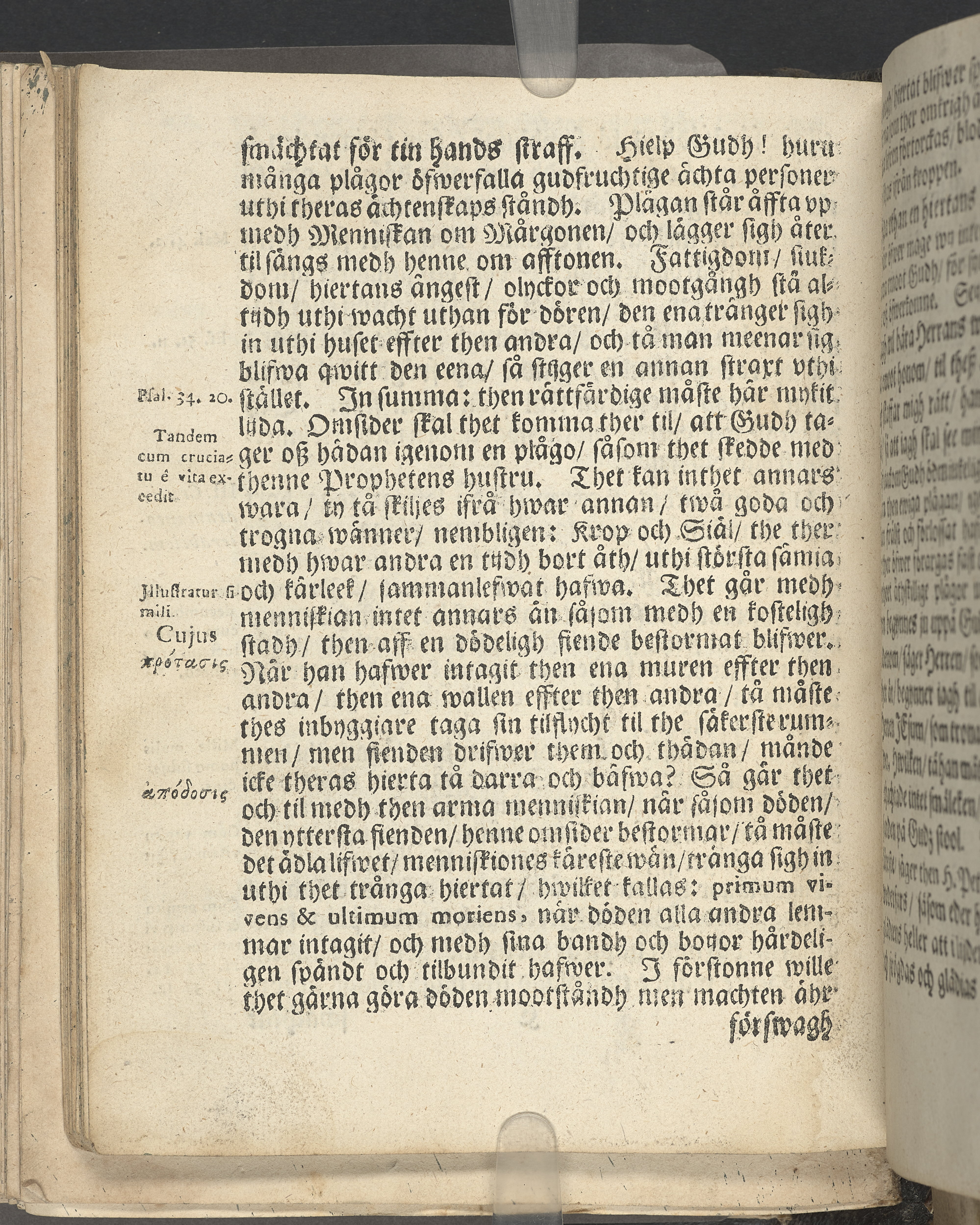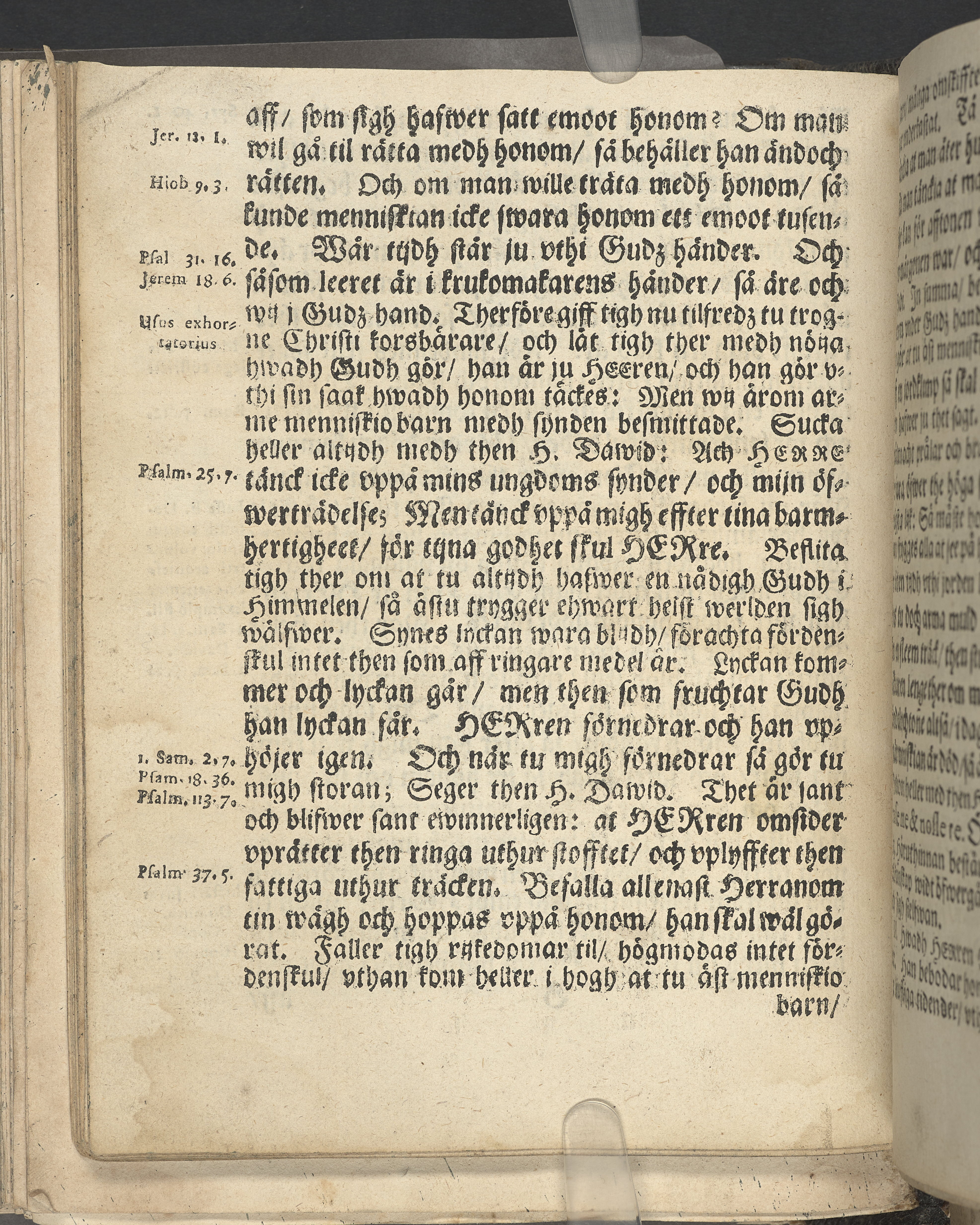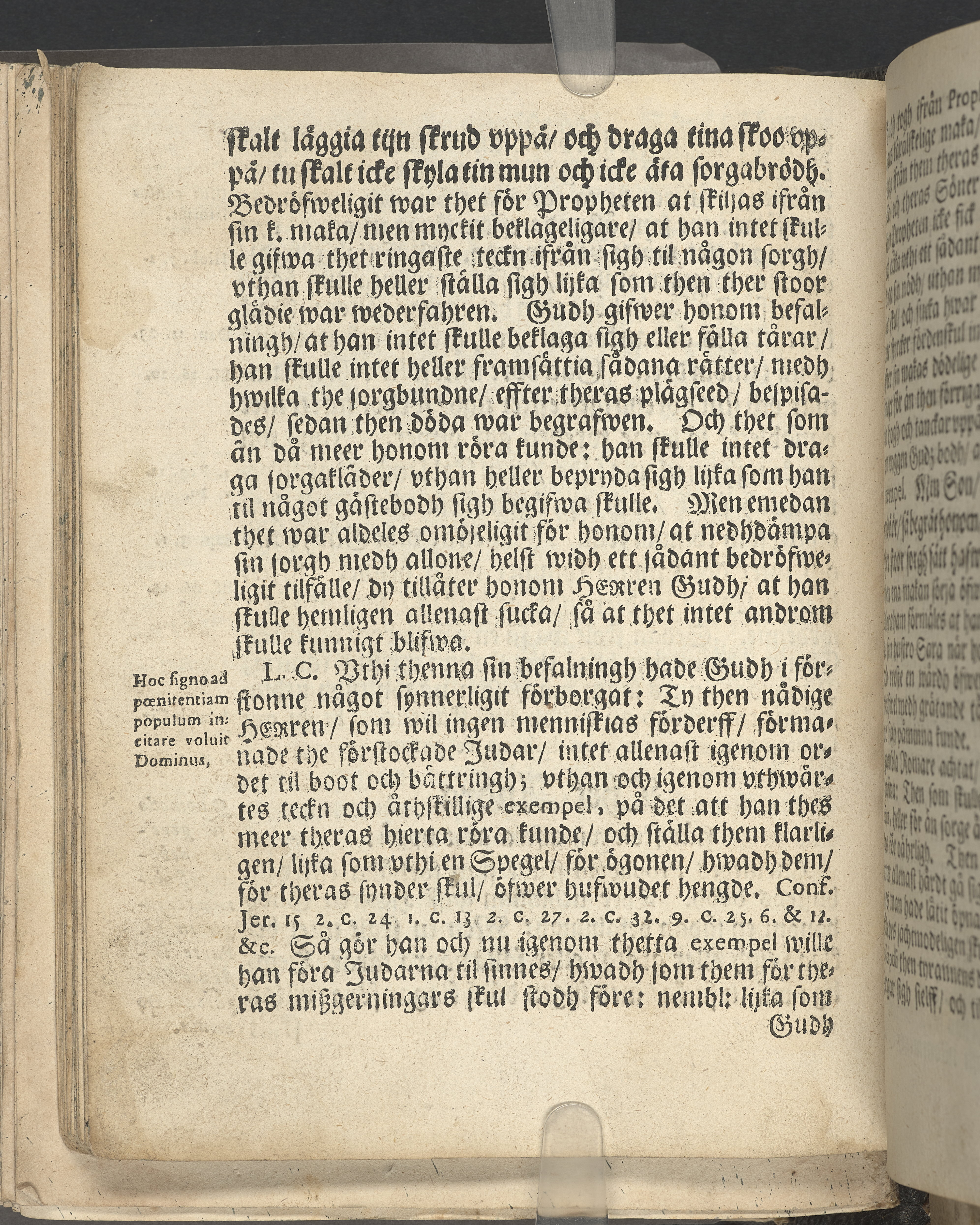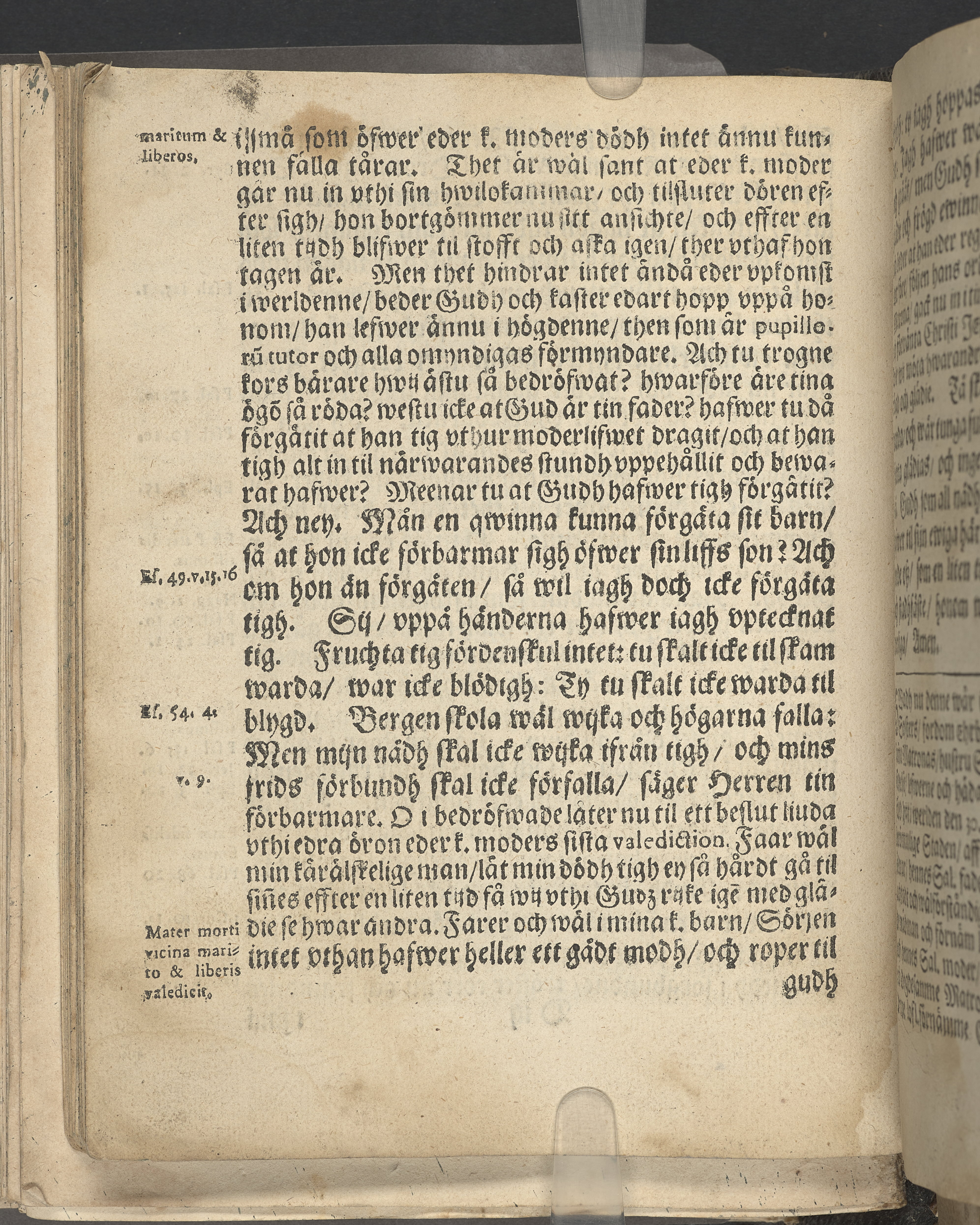 Anteckningar med brunt bläck i nederkant på titelsidan. Snitt stänkta i rött och blått.