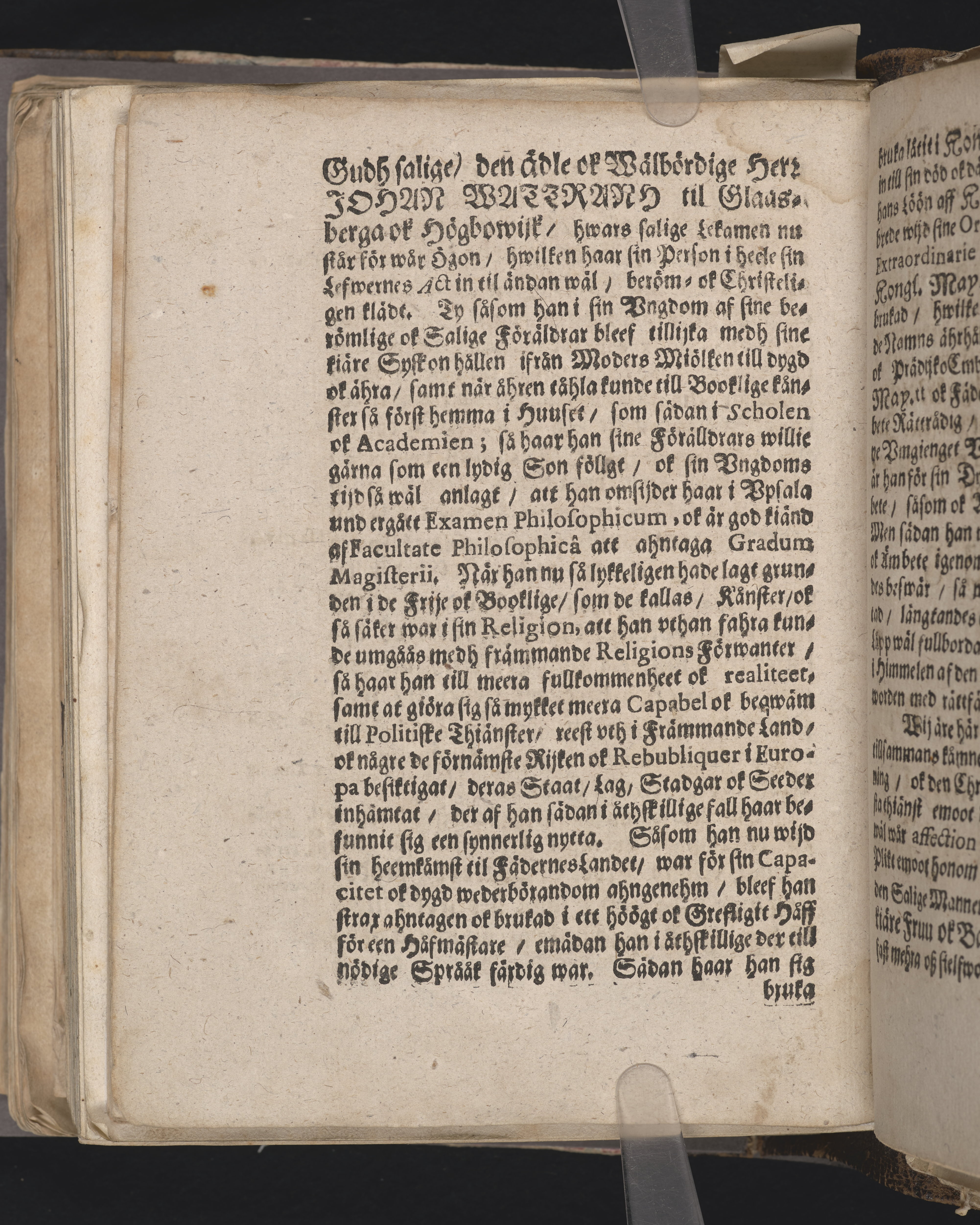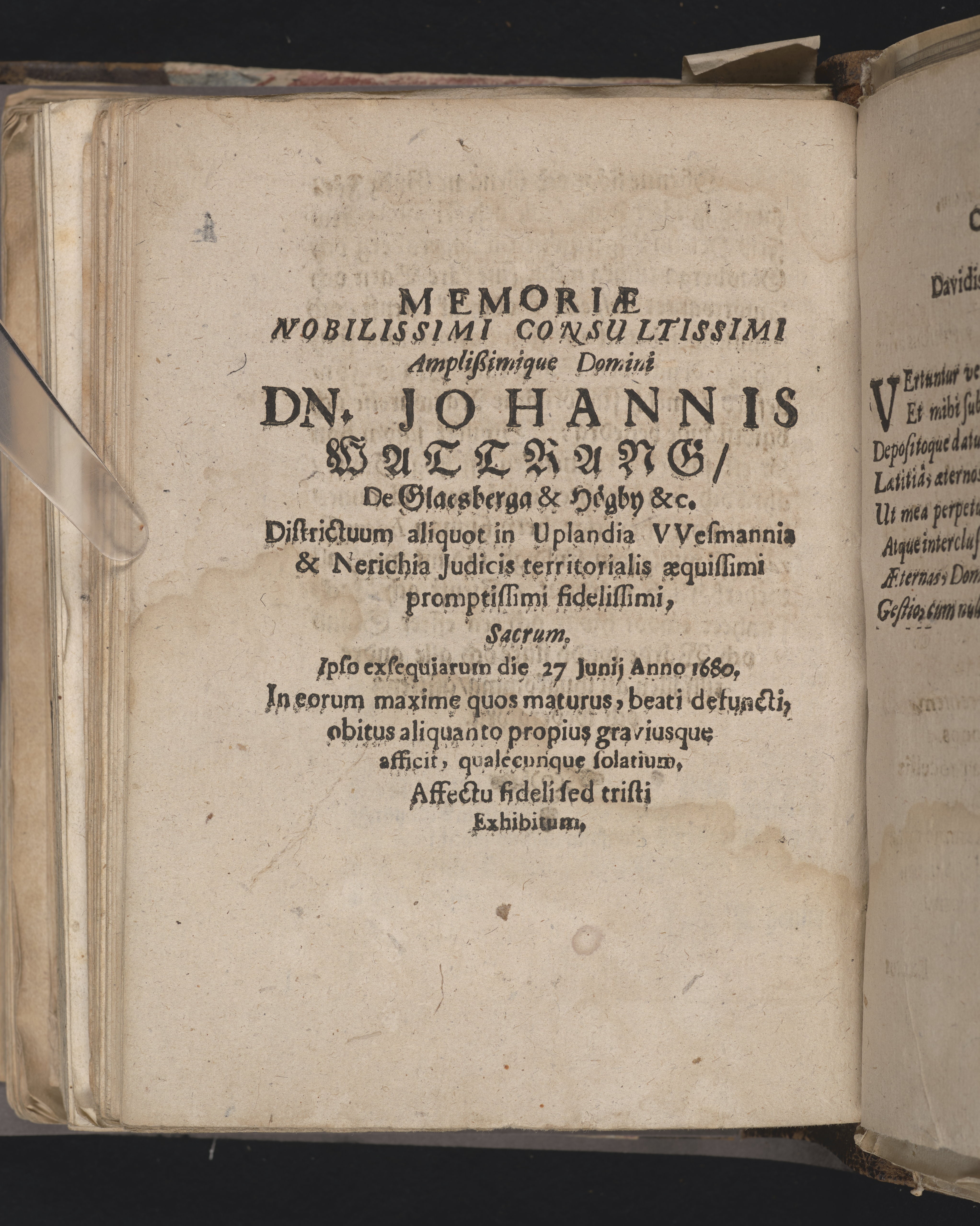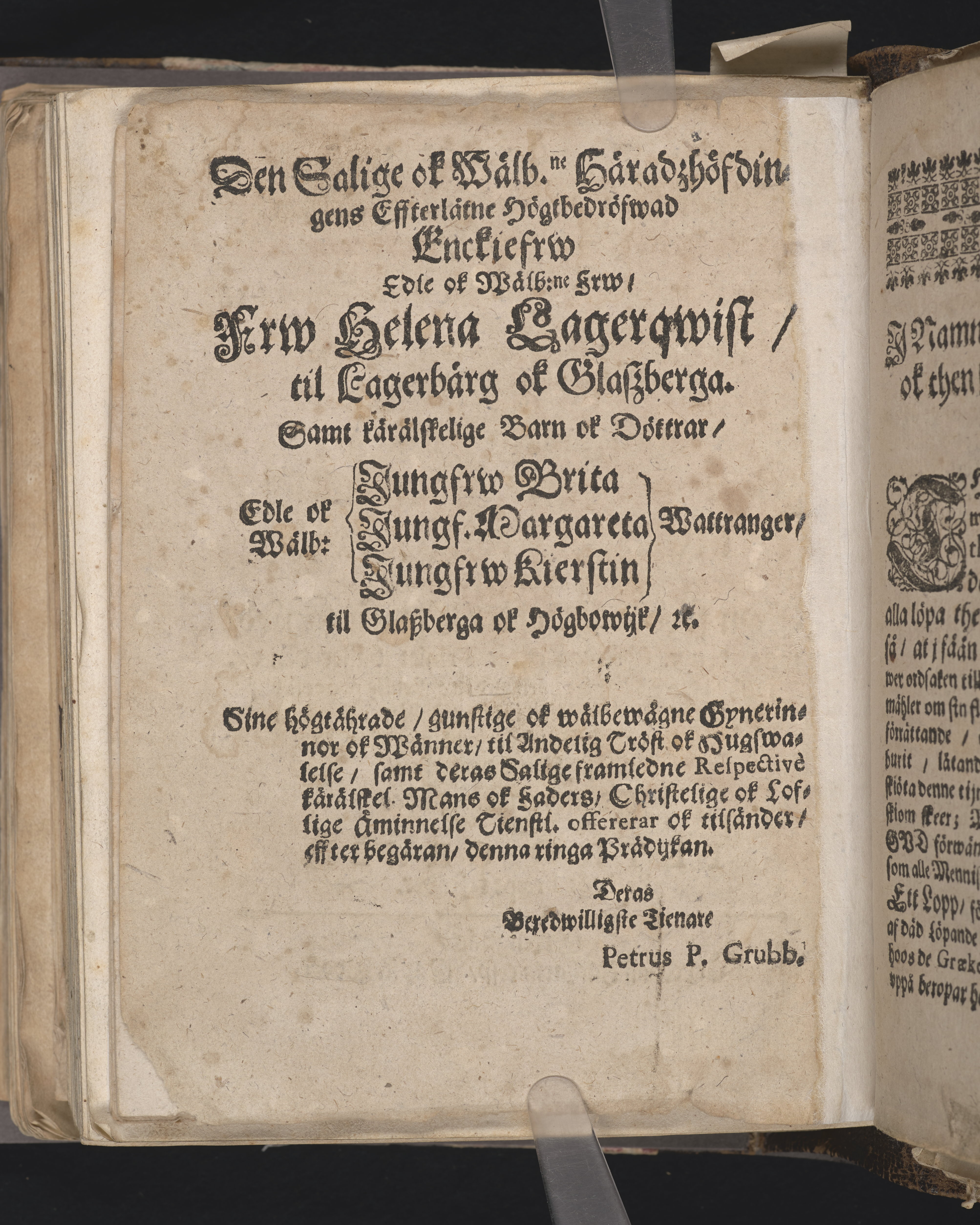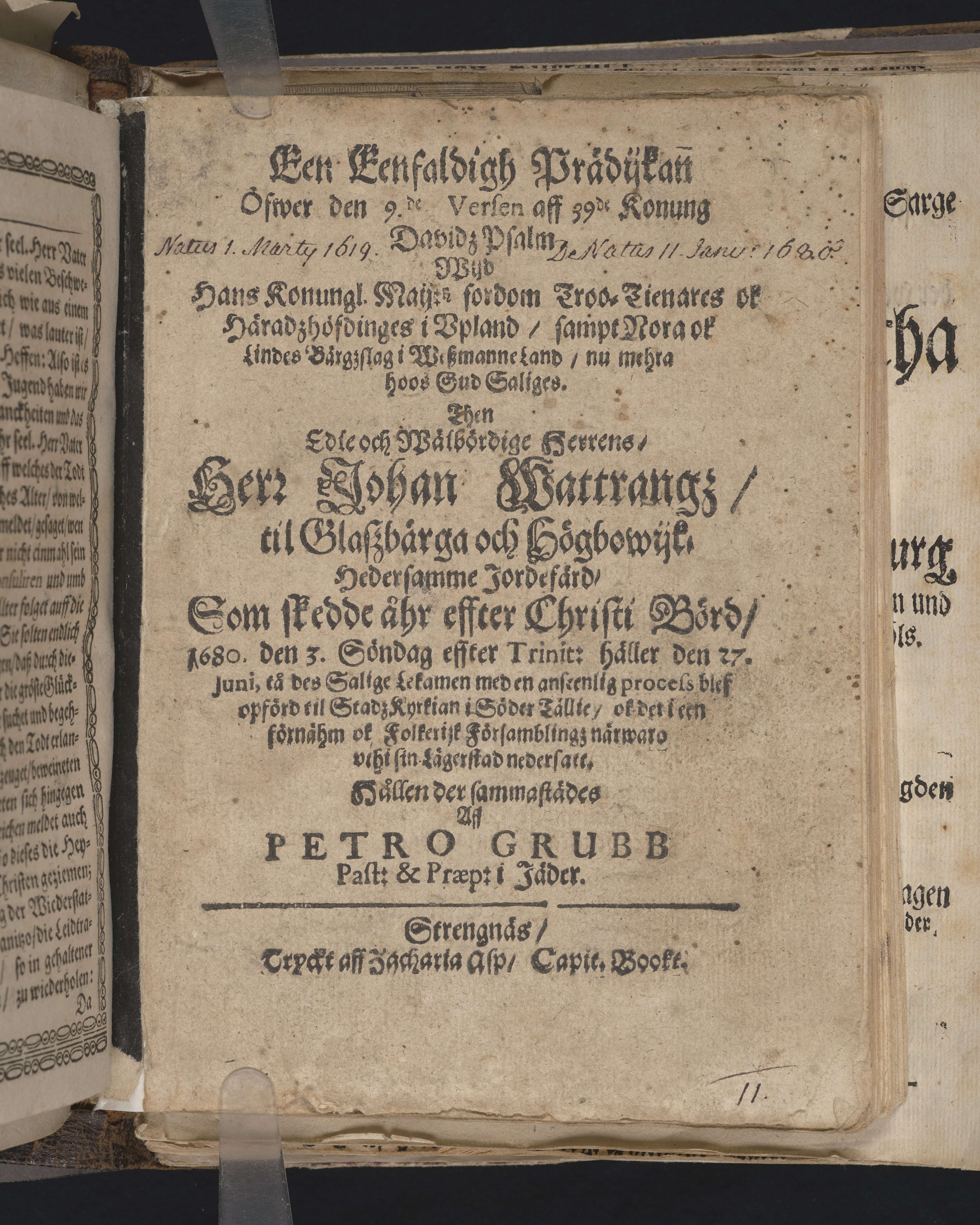 Een eenfaldigh prädijkan ... wijd hans konungl. maij:tz fordom troo-tienares ok häradzhöfdinges i Vpland, sampt Nora ok Lindes Bärgzslag i Wiszmanneland, nu mehra hoos Gud saliges. Then edle och wälbördige herrens, herr Johan Wattrangz, til Glaszbärga och Högbowijk hedersamme jordefärd, som skedde åhr effter Christi börd, 1680. den 3. söndag effter trinit: håller den 27. juni, tå des salige lekamen med en anseenlig process blef opförd til stadzkyrkian i Söder Tällie, ... vthi sin lägerstad nedersatt. Hållen der sammastädes aff Petro Grubb ..