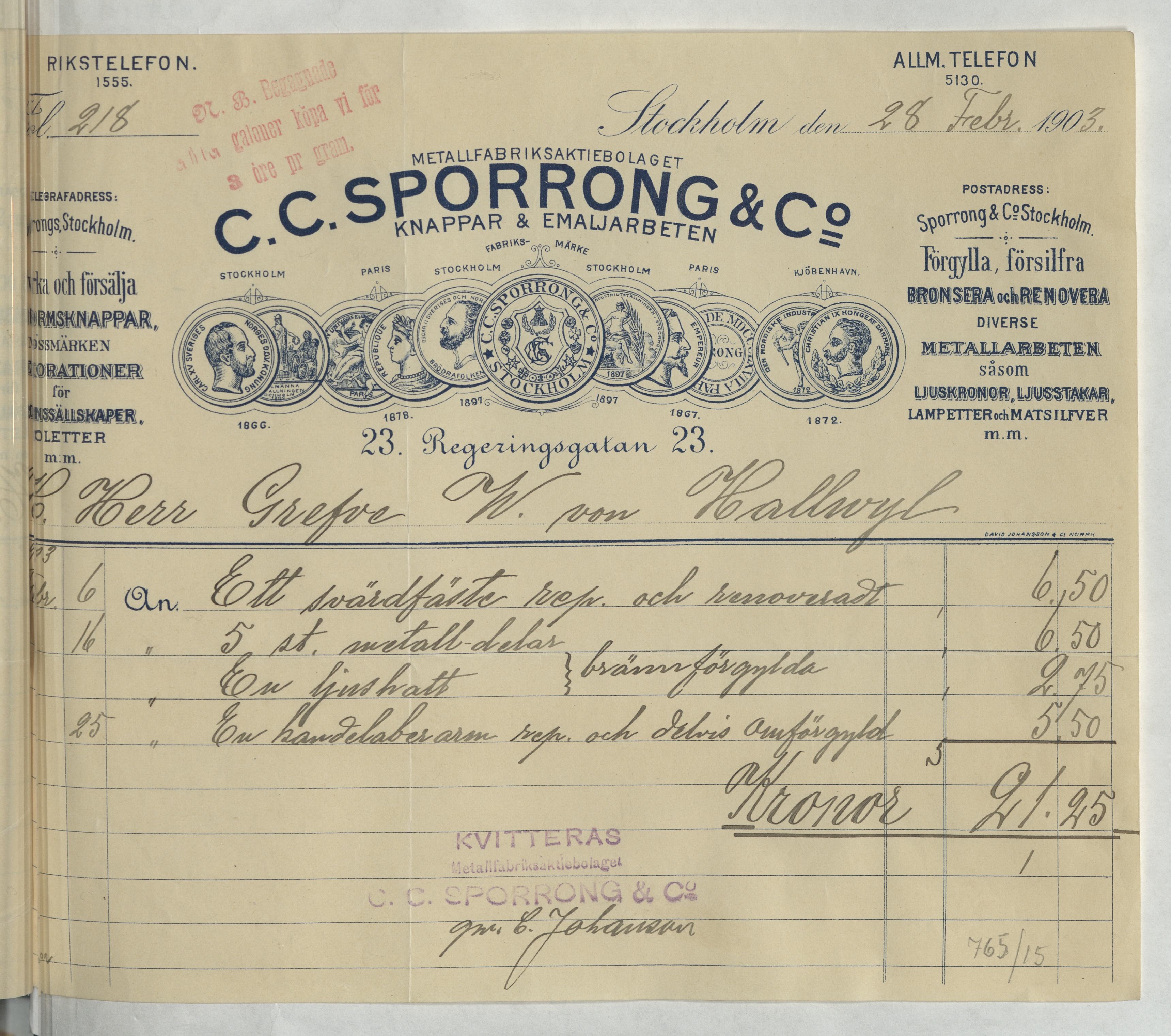 Kvitto från Metallfabriksaktiebolaget C. C. Sporrong & Co. Knappar & Emaljarbeten. Gällande bland annat reparation och brännförgyllningsarbeten. Stockholm, 1903.