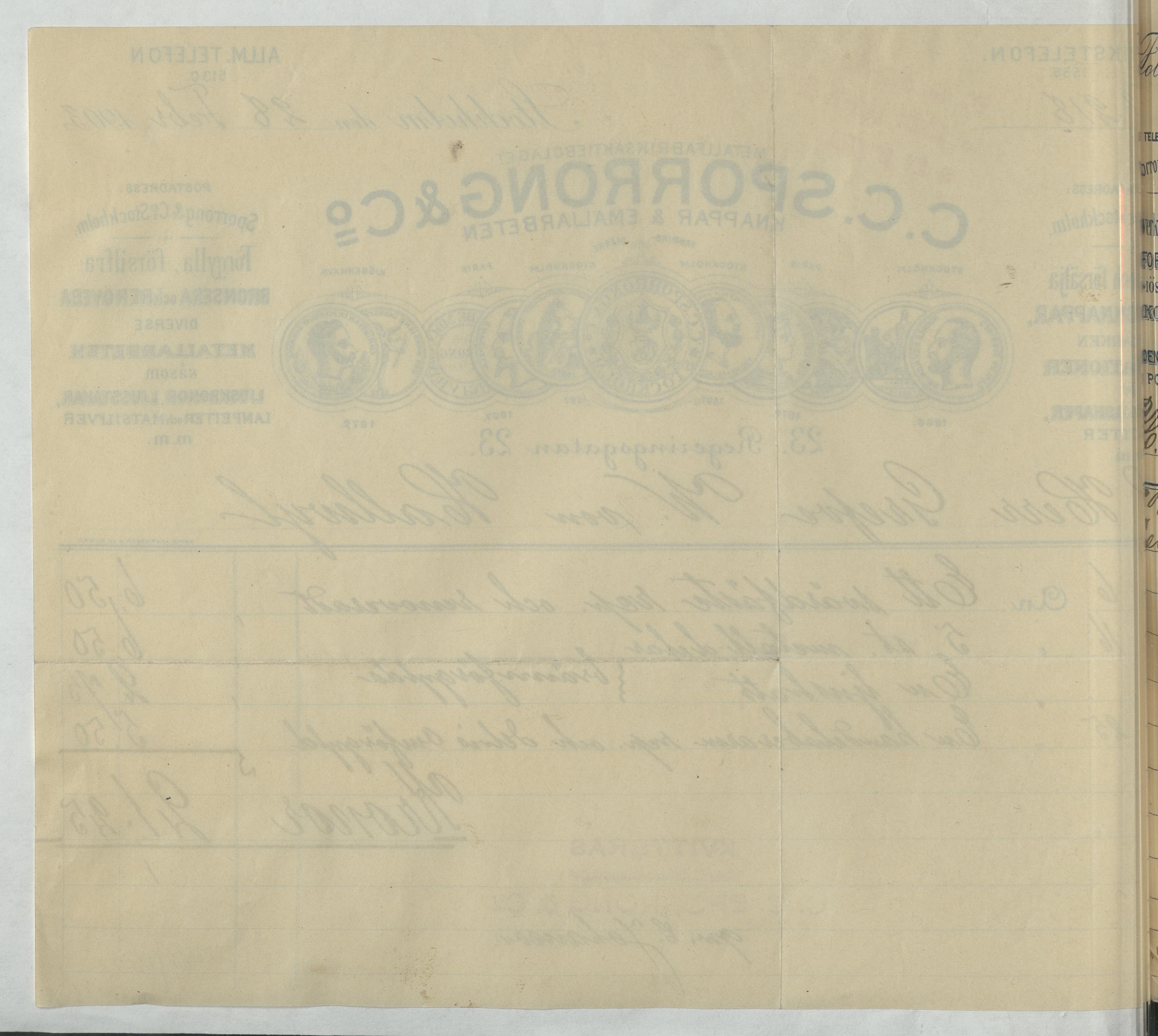 Kvitto från Metallfabriksaktiebolaget C. C. Sporrong & Co. Knappar & Emaljarbeten