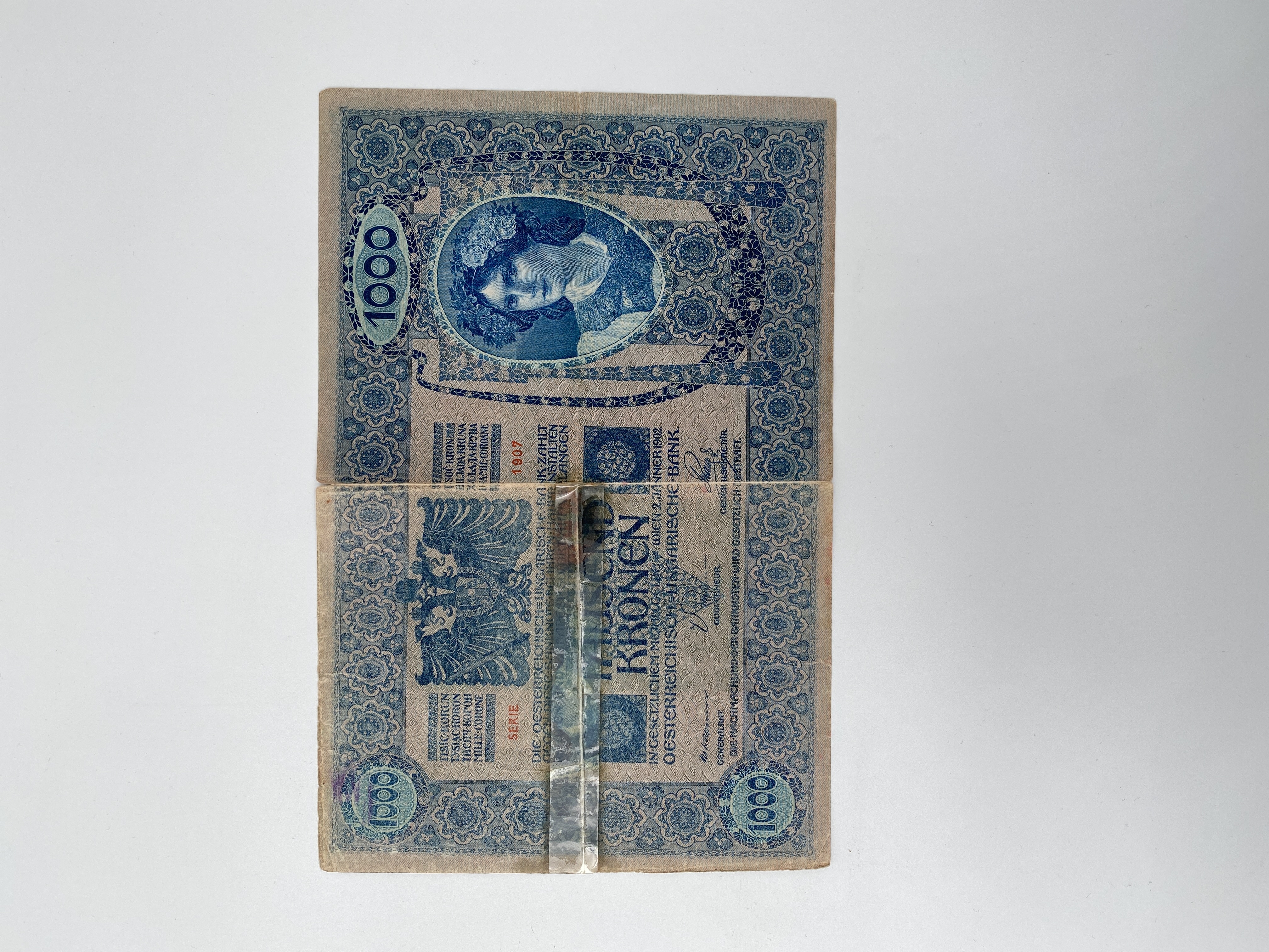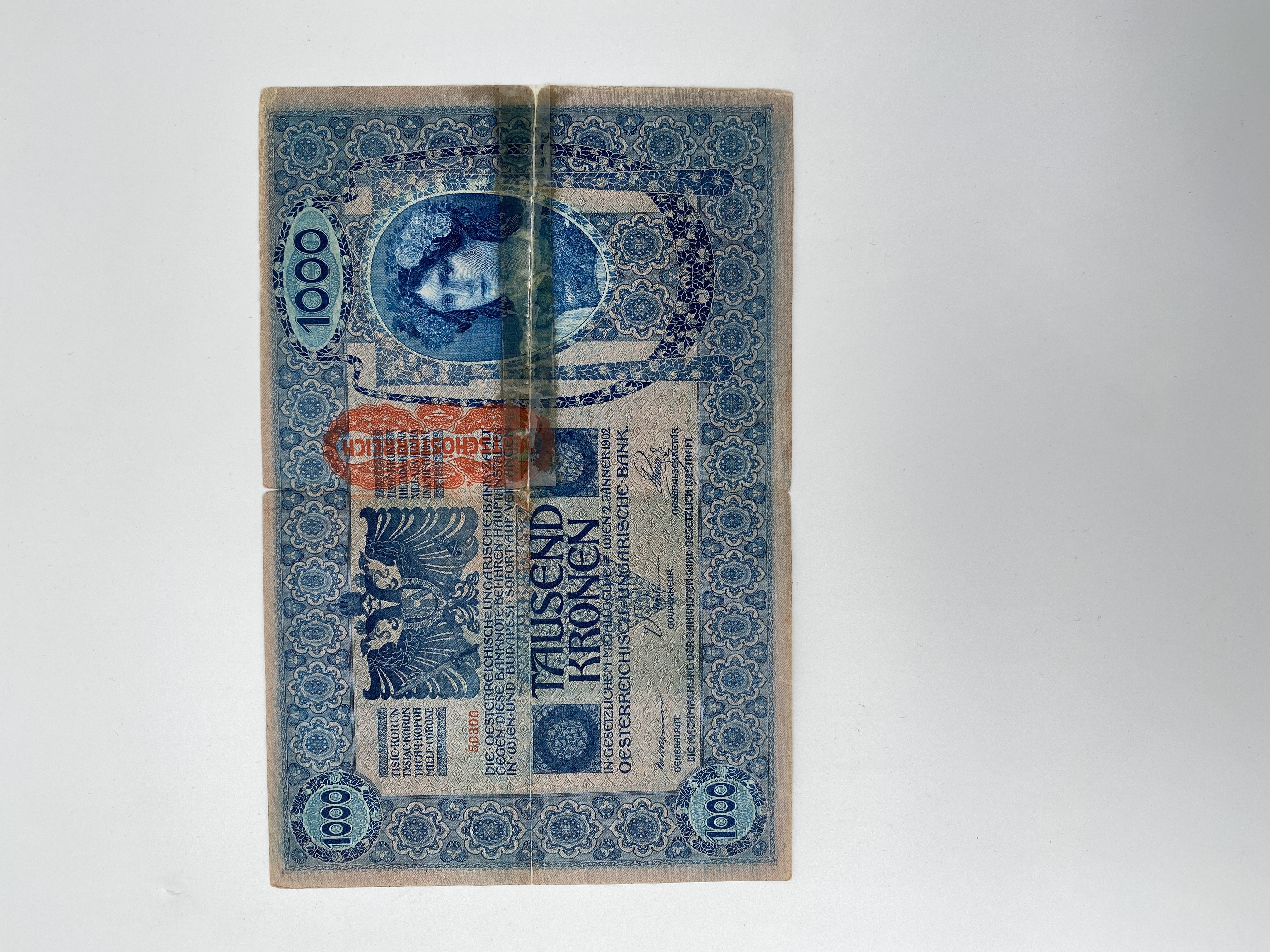 Stor blå sedel i valör 1000 kronor, daterad januari 1902. Förmodligen skickad av Liselotte Haase i Tyskland till Sonia Jönsson i Sverige.