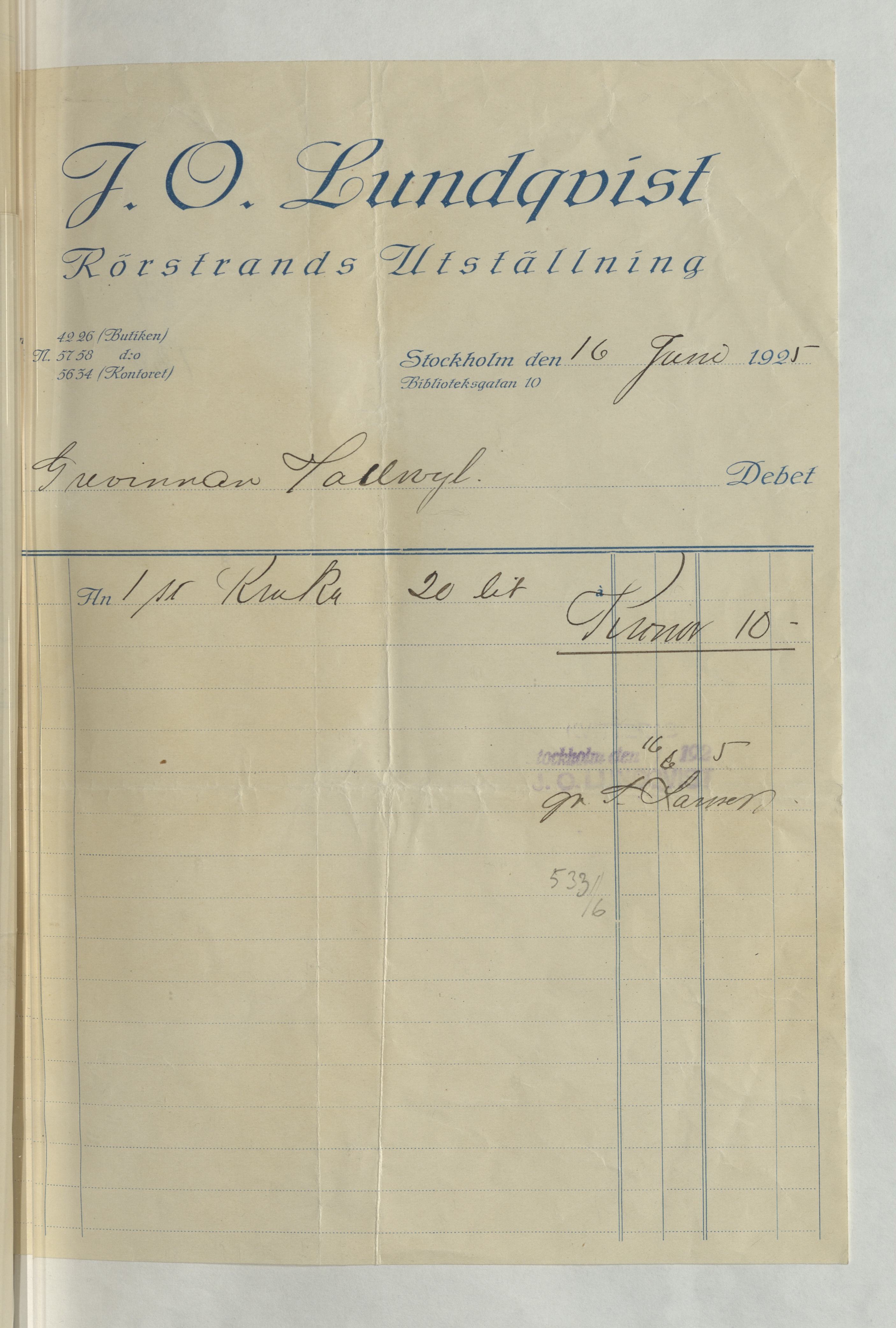 Kvitto till Fru Grevinnan Hallwyl för inköp av 1 st Kruka 20 liter, hos J. O. Lundqvist, Rörstrands Porslins-Magasin, Rörstrands Utställning, för en summa av 10Kr. Stockholm 16 juni 1925.