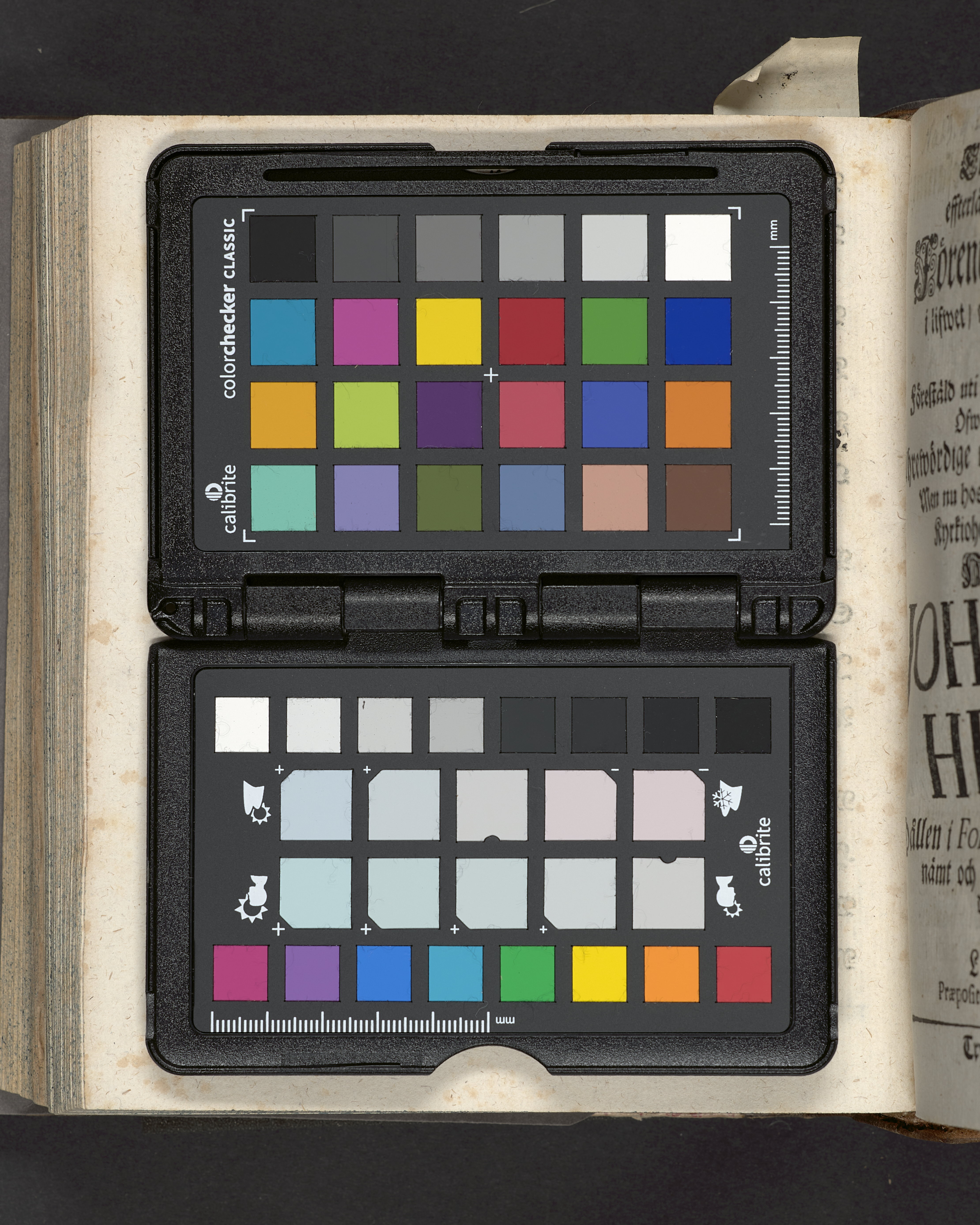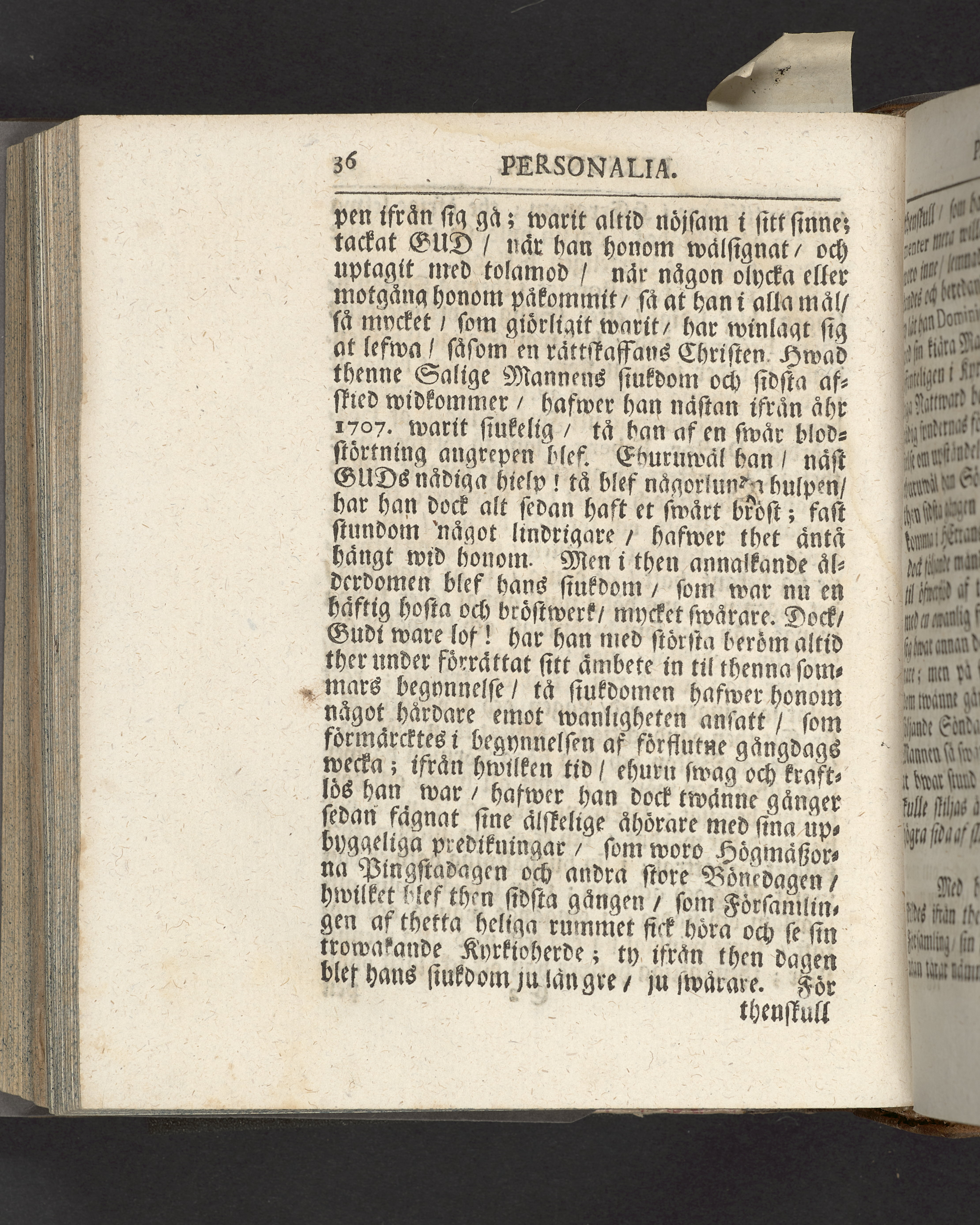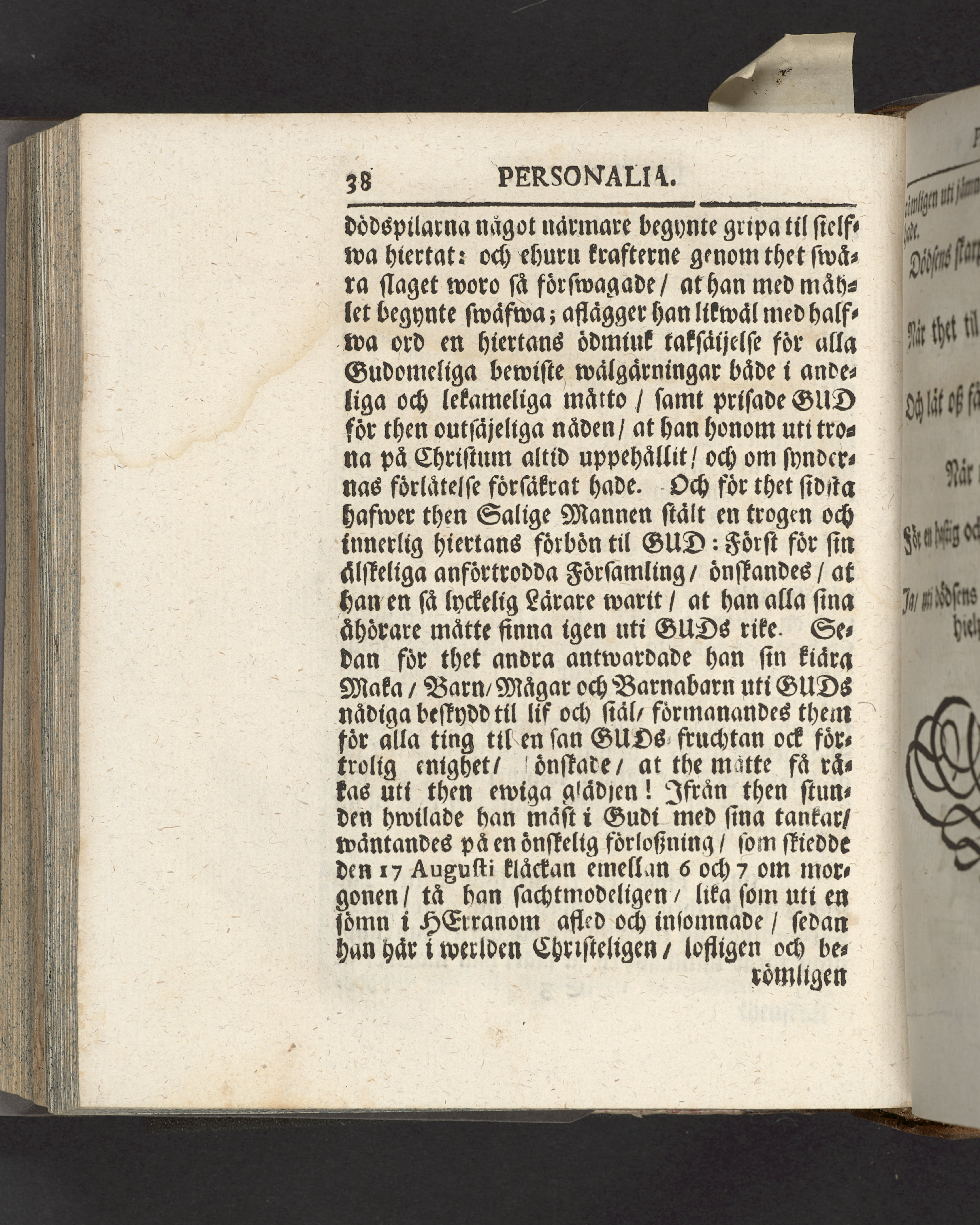 I sammelband med 26 tryck. Högst upp på titelsidan anteckning med uppgifter om födelse- och dödsdatum för den avlidna. Snitten stänkta i blått.