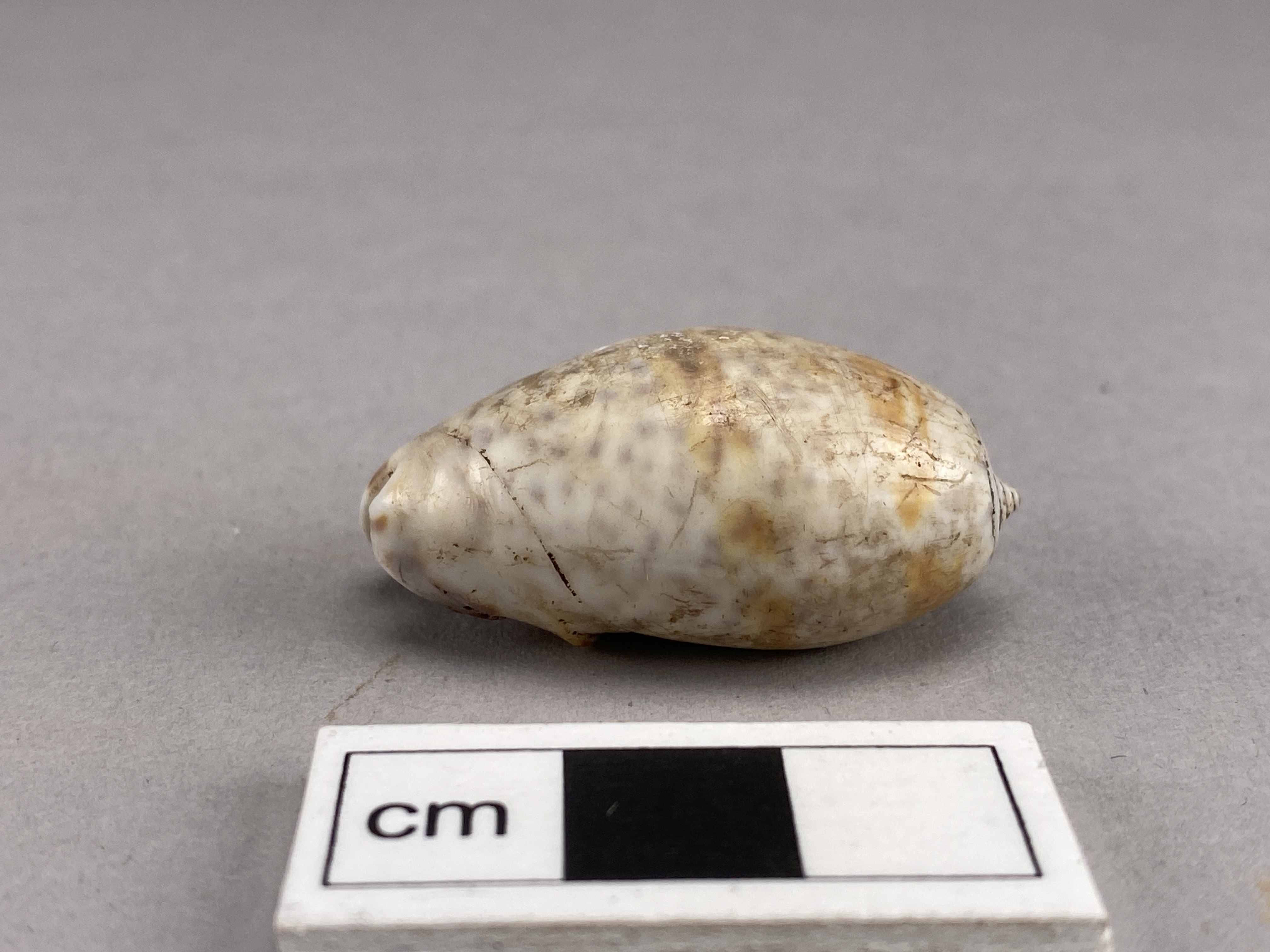 snäcka, vit med gråbruna fläckar. Bestämd som "Oliva inflata fam." Ska finnas i Indiska oceanen och Röda Havet