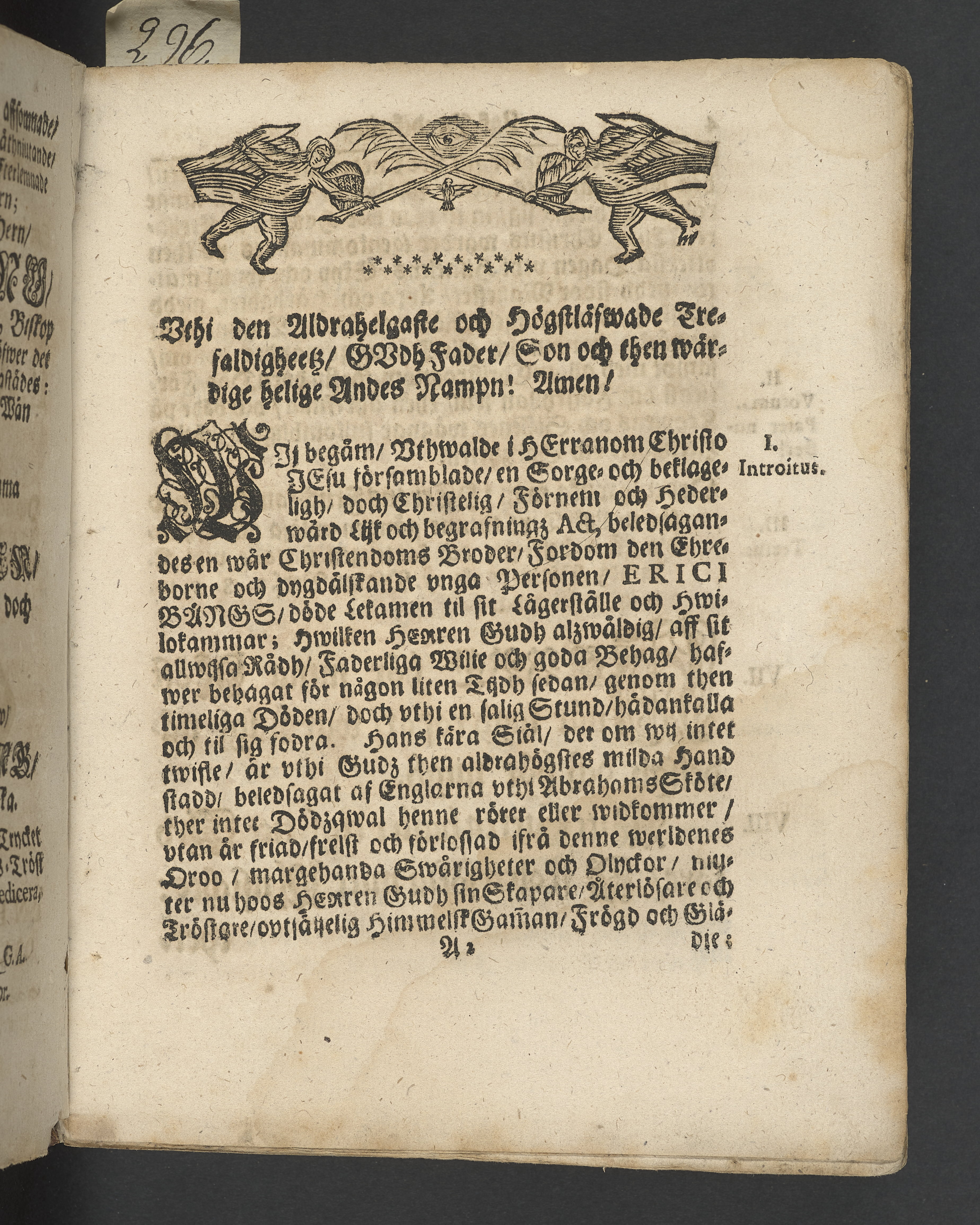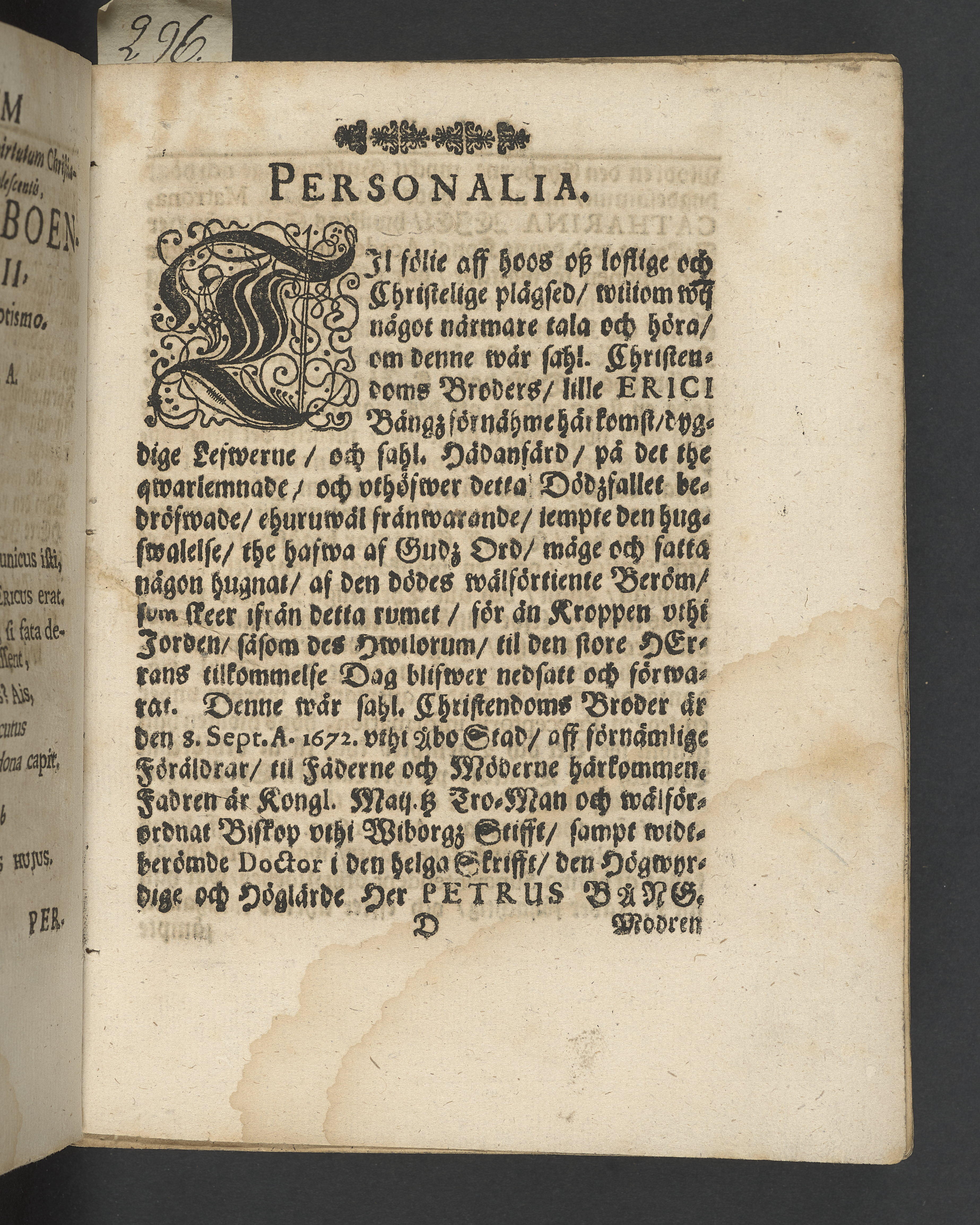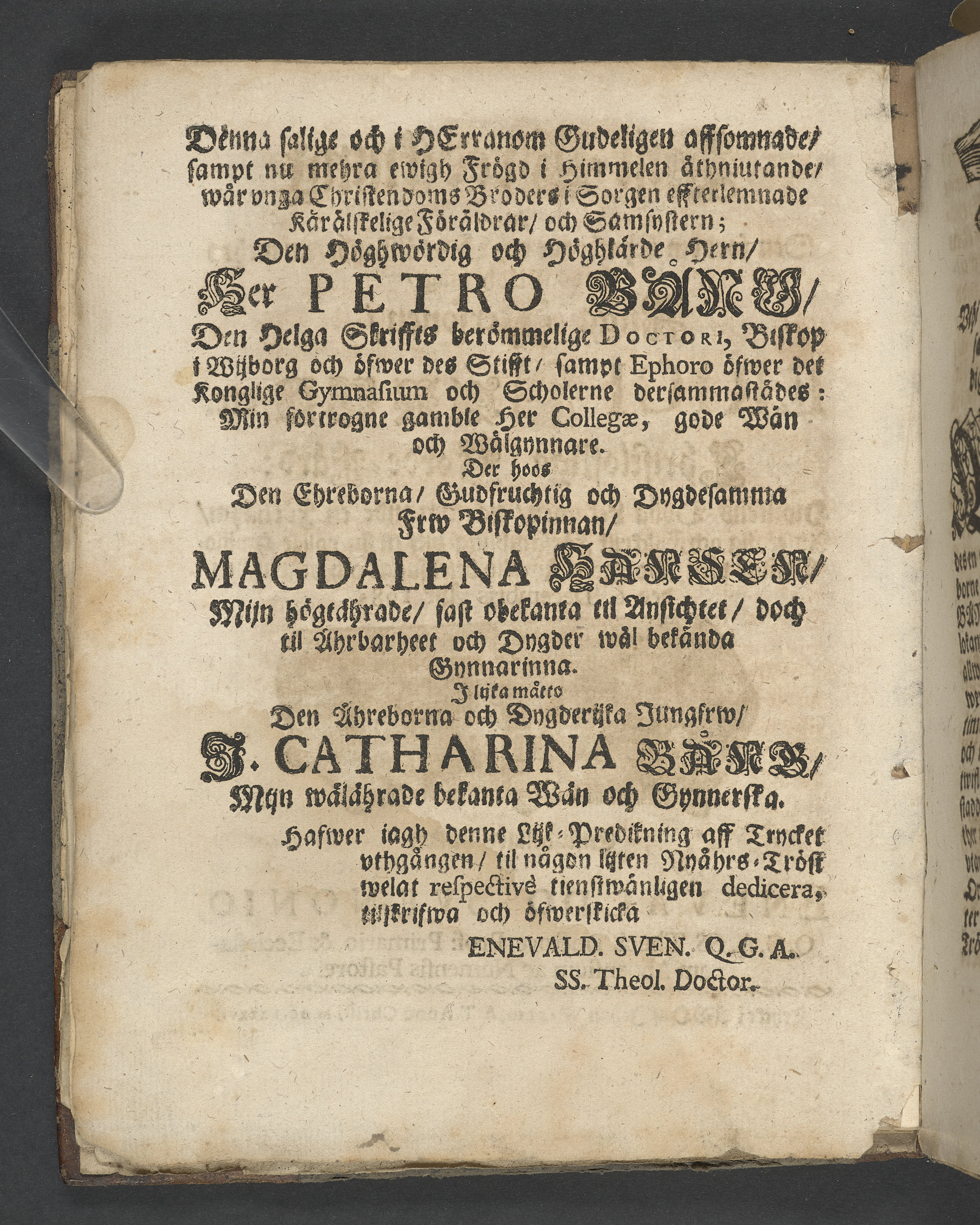 Lijk-predikning. Öfwer den fordom ehreborne och dygdälskande, nu mehra hoos Gud salige, unga personen, Erici Bångs, etc. christliga jorde-färd: hwilkens döda lekamen, närwarande en förnähm, anseenlig och folkrijk församlibling, blef til sin rolige hwijlocamar vthi Åbo dom-kyrckio beledsagat och begrafwen den 6. decembris åhr 1685. Enfaldeligen hållen af Enevaldo Svenonio, Q.G.A.SS. theol. doctore, prof: primario & ecclesiarum Aboënsium ac numensis pastore. tryckt i Åbo af Johan Wallio, A.T. anno Christi M.DC.LXXXXVI.