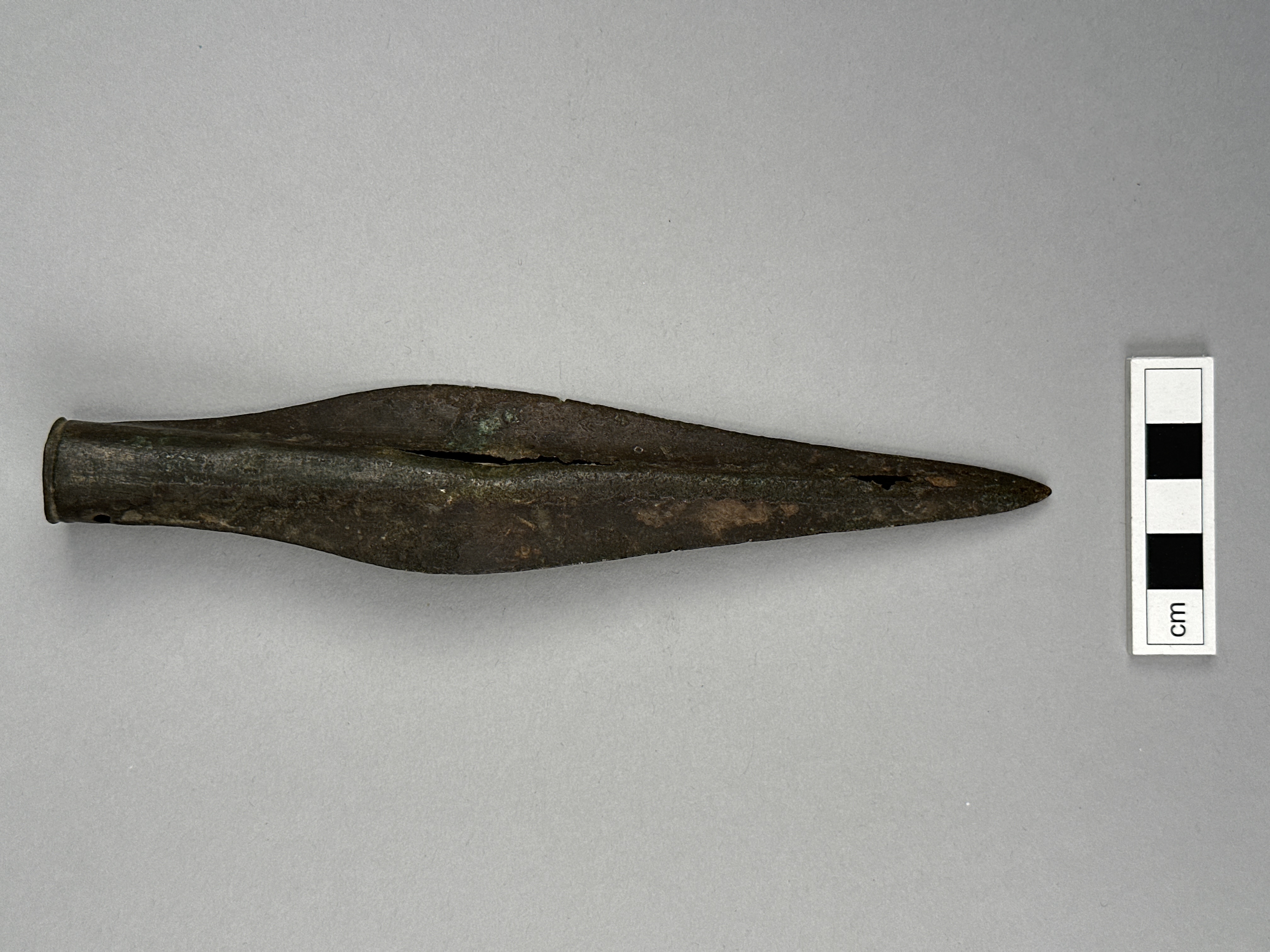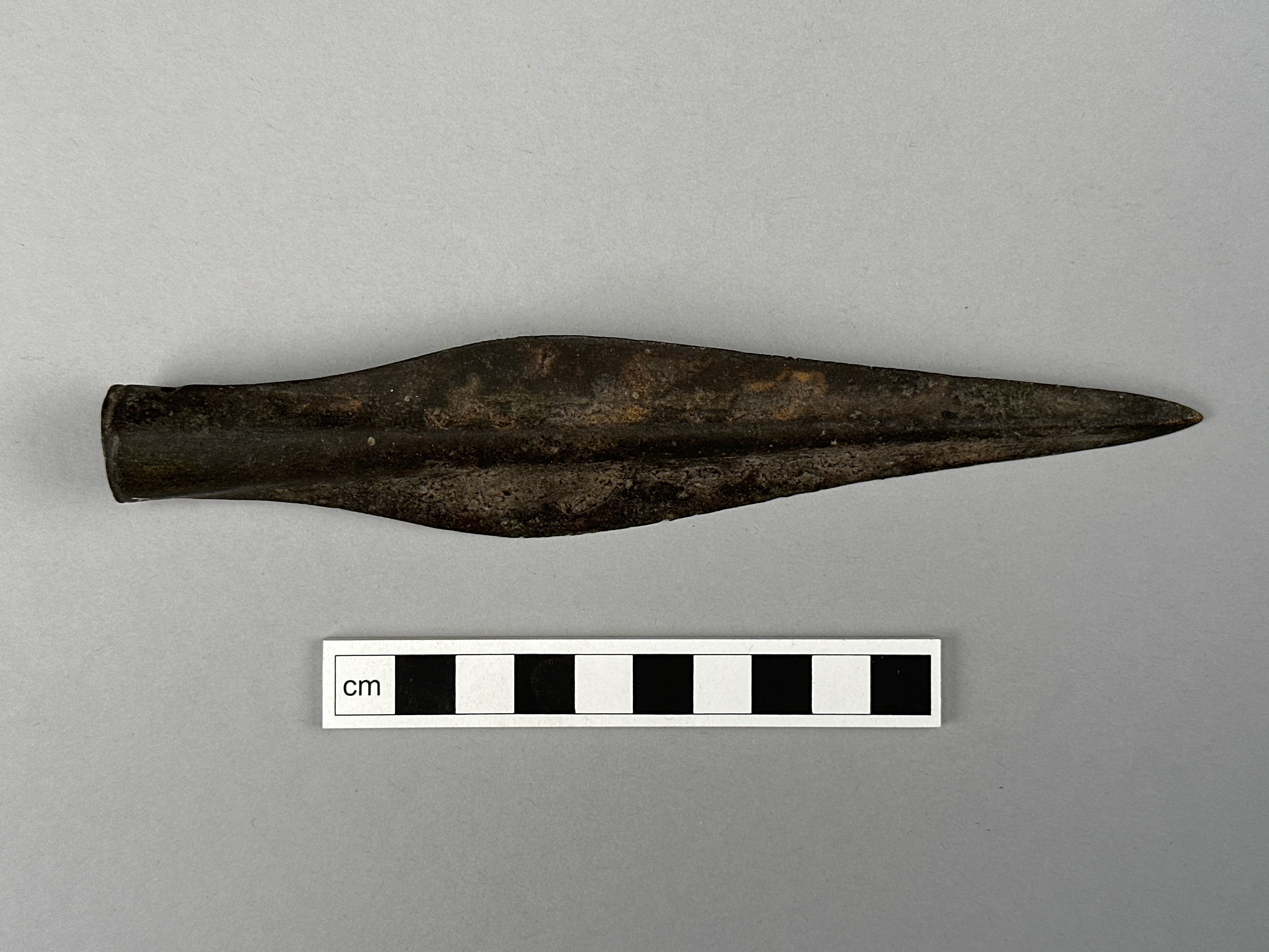 Spjutspets av brons. Holken går genom hela bladet. Bladet är sprucket på ena sidan längs mittåsen. En fåra runt holköppningen.