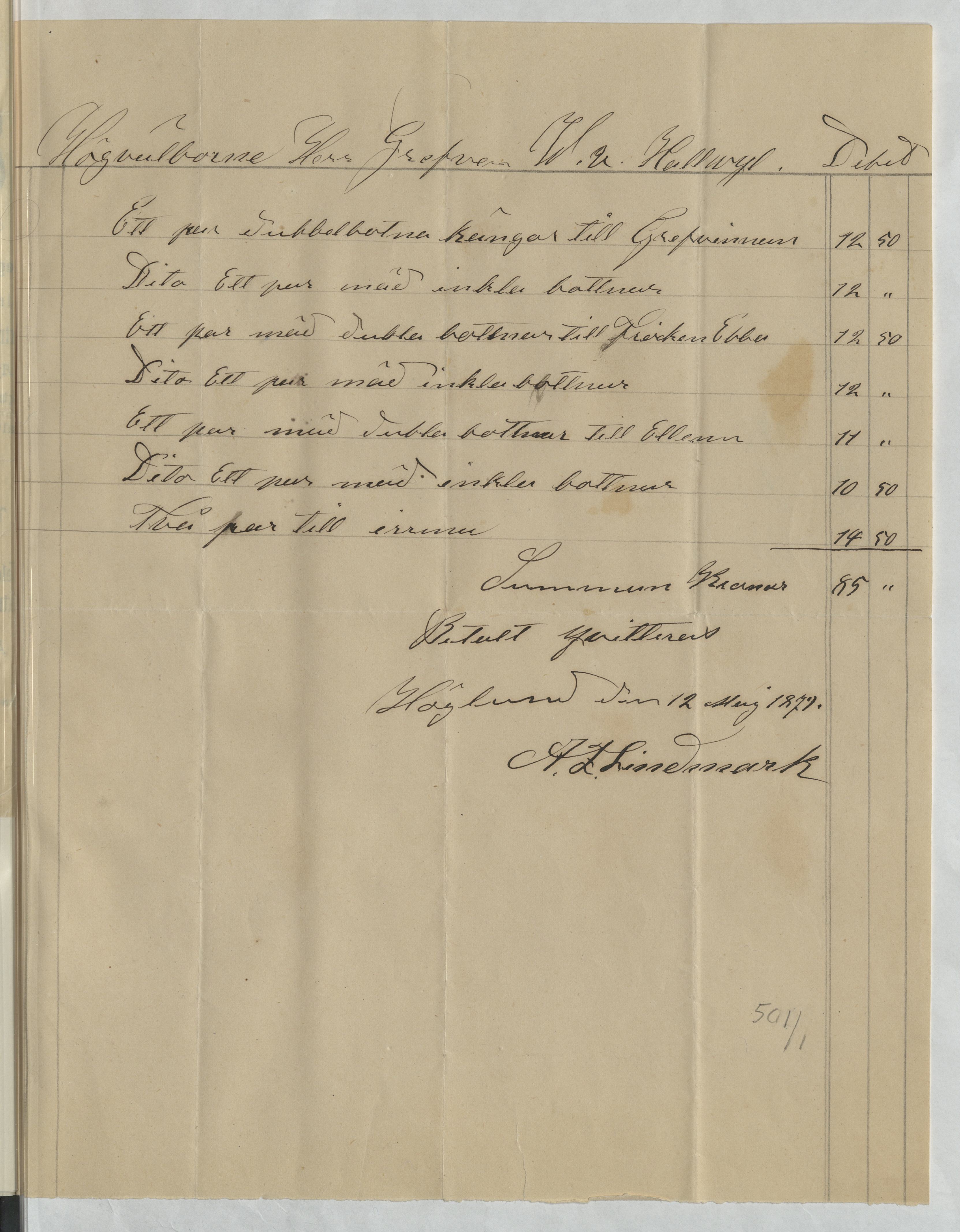 Kvitto från A. F. Lindmark, Skomakare. Gällande inköpa av bland annat kängor till Wilhelmina, Ebba, Ellen och Irma von Hallwyl.