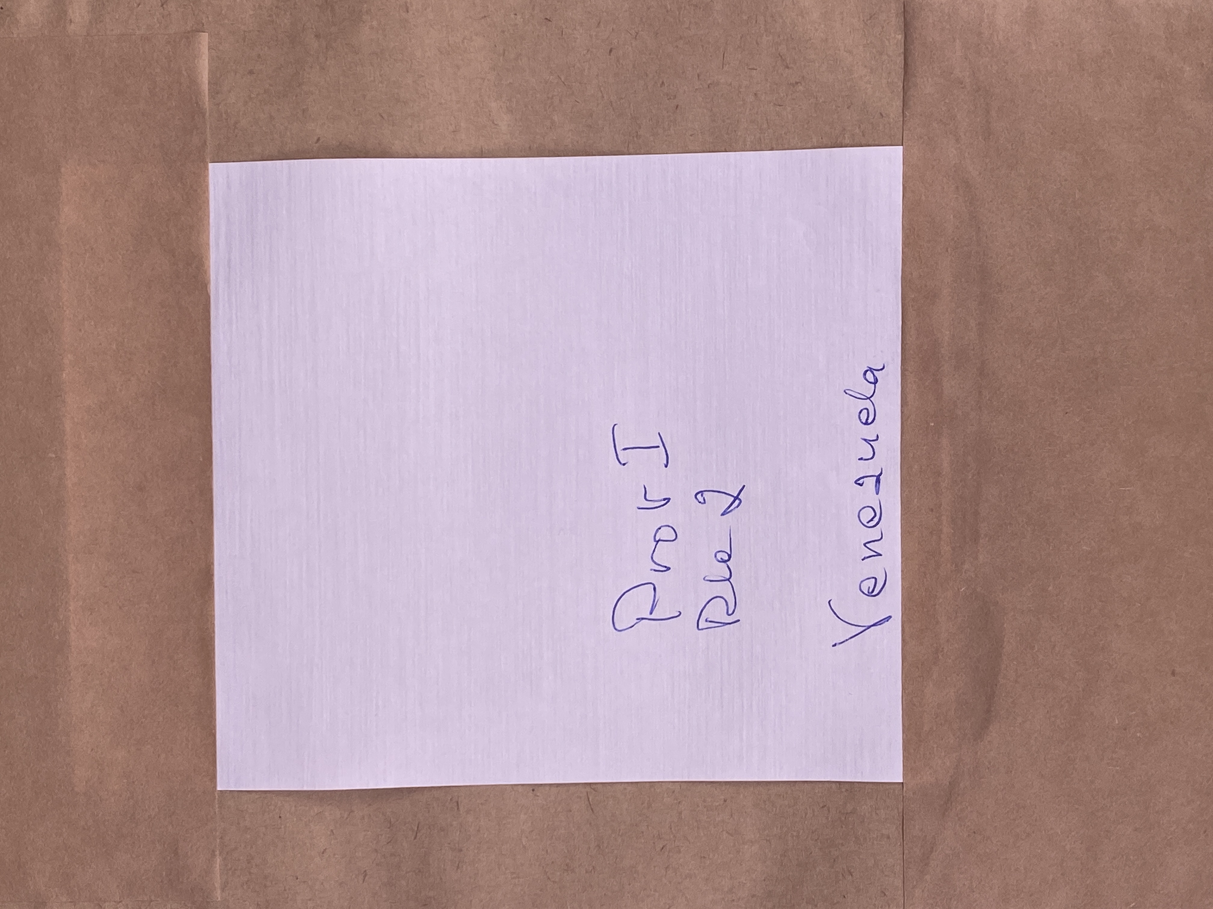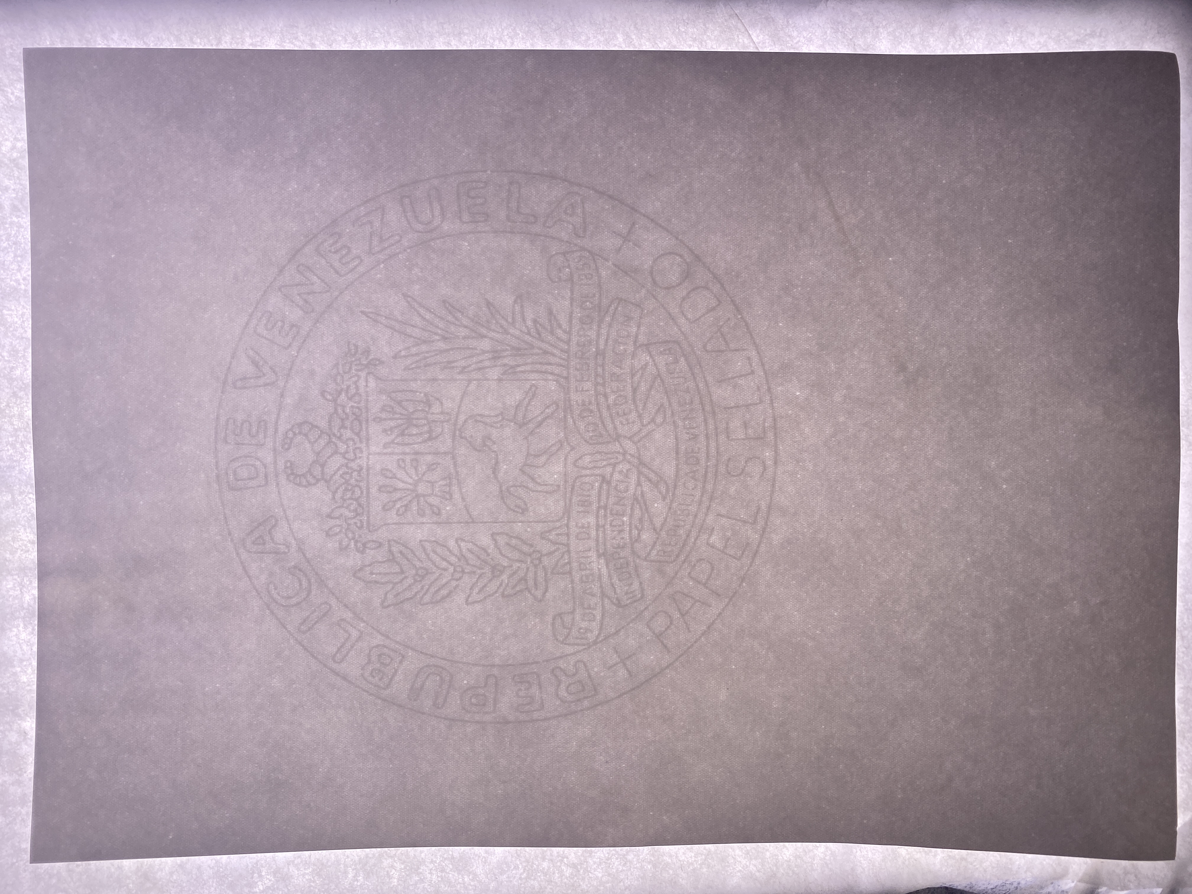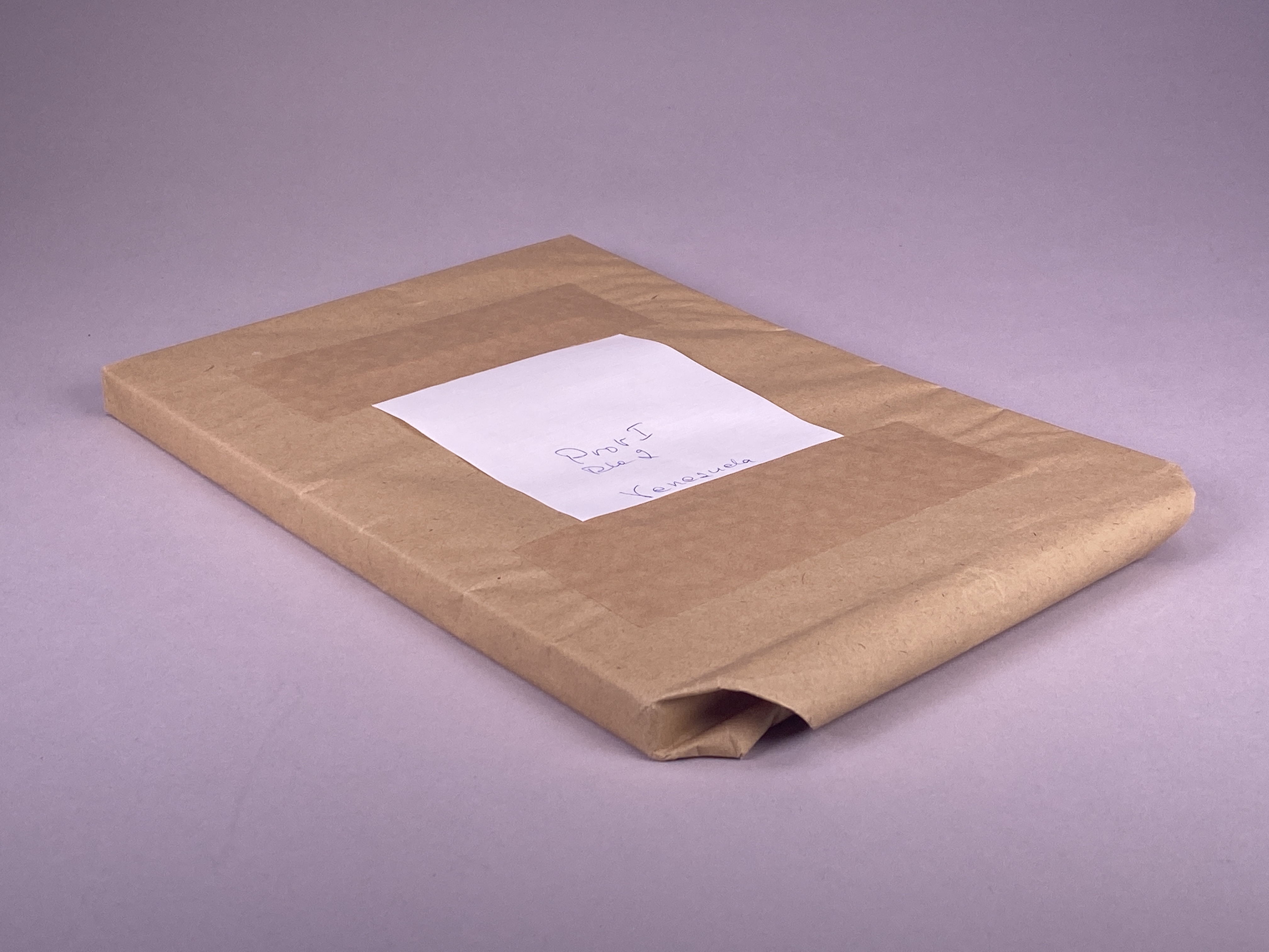 Paket innehållandes pappersark tillverkade vid Tumba bruk. Med enkelverkande vattenmärke föreställande Venezuelas stadsvapen omgärdat av texten: "REPUBICA DE VENEZUELA PAPEL SELLADO". Paketet med vit etikett märkt: "Prov 1 Rlo 2 Venezuela".